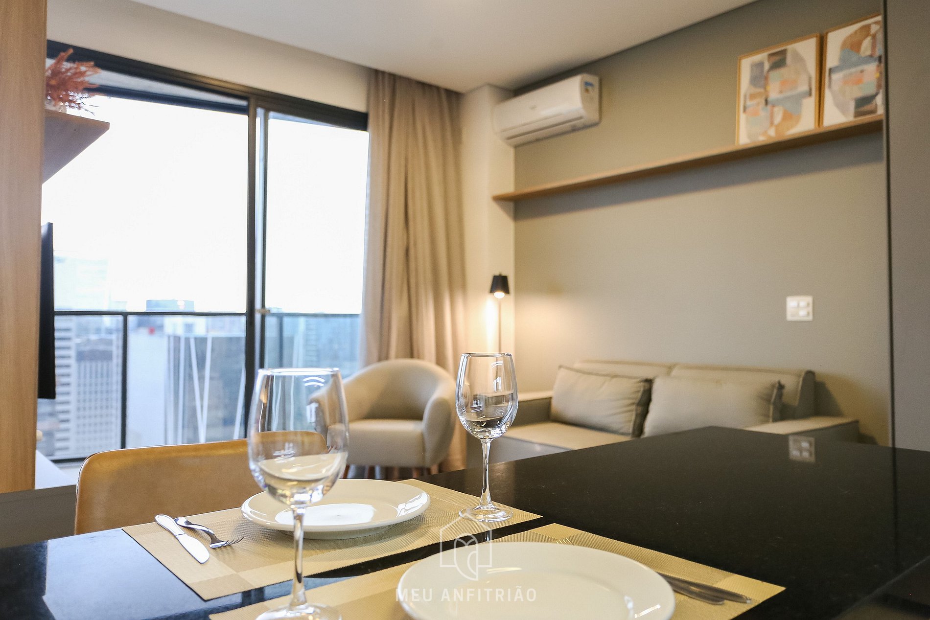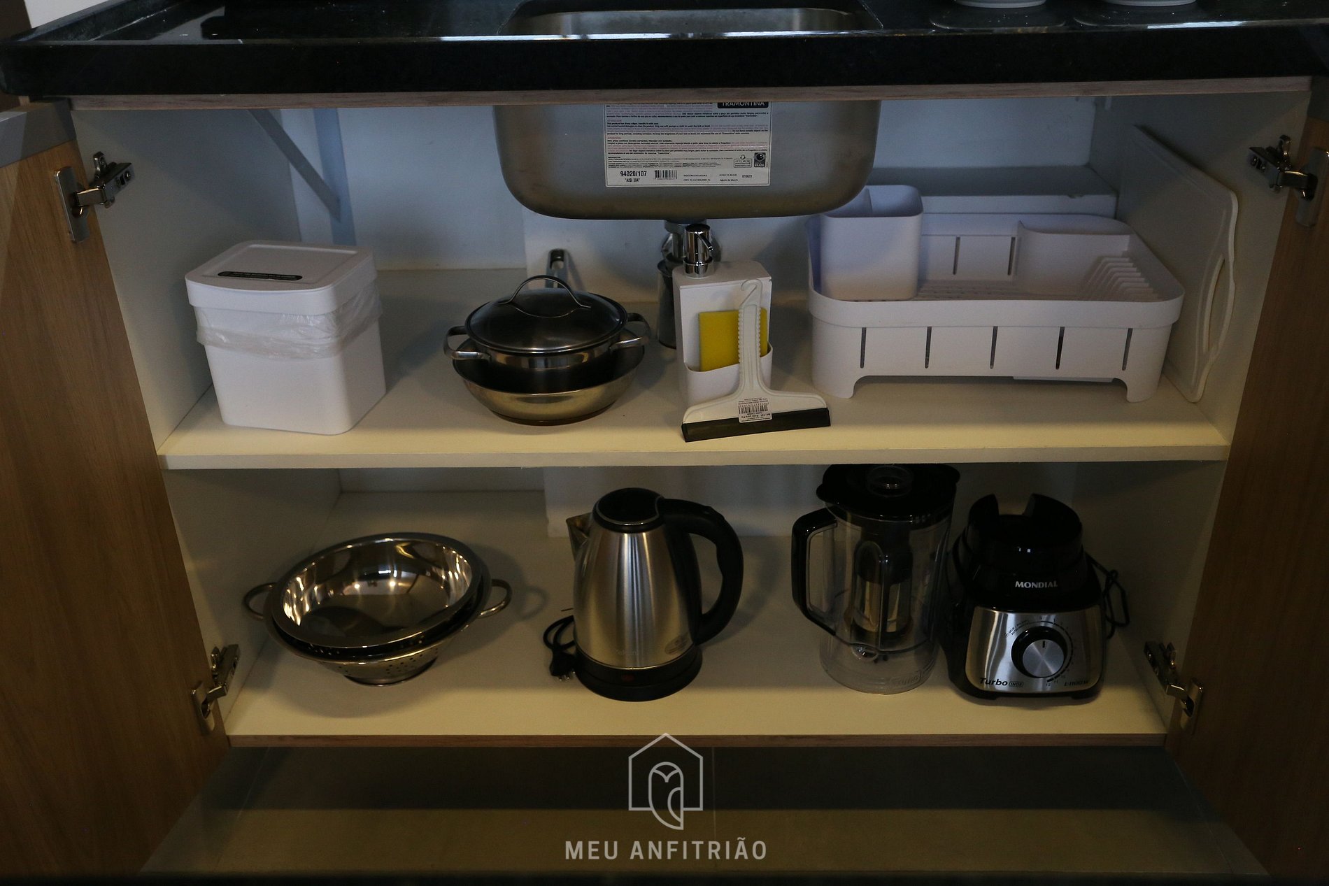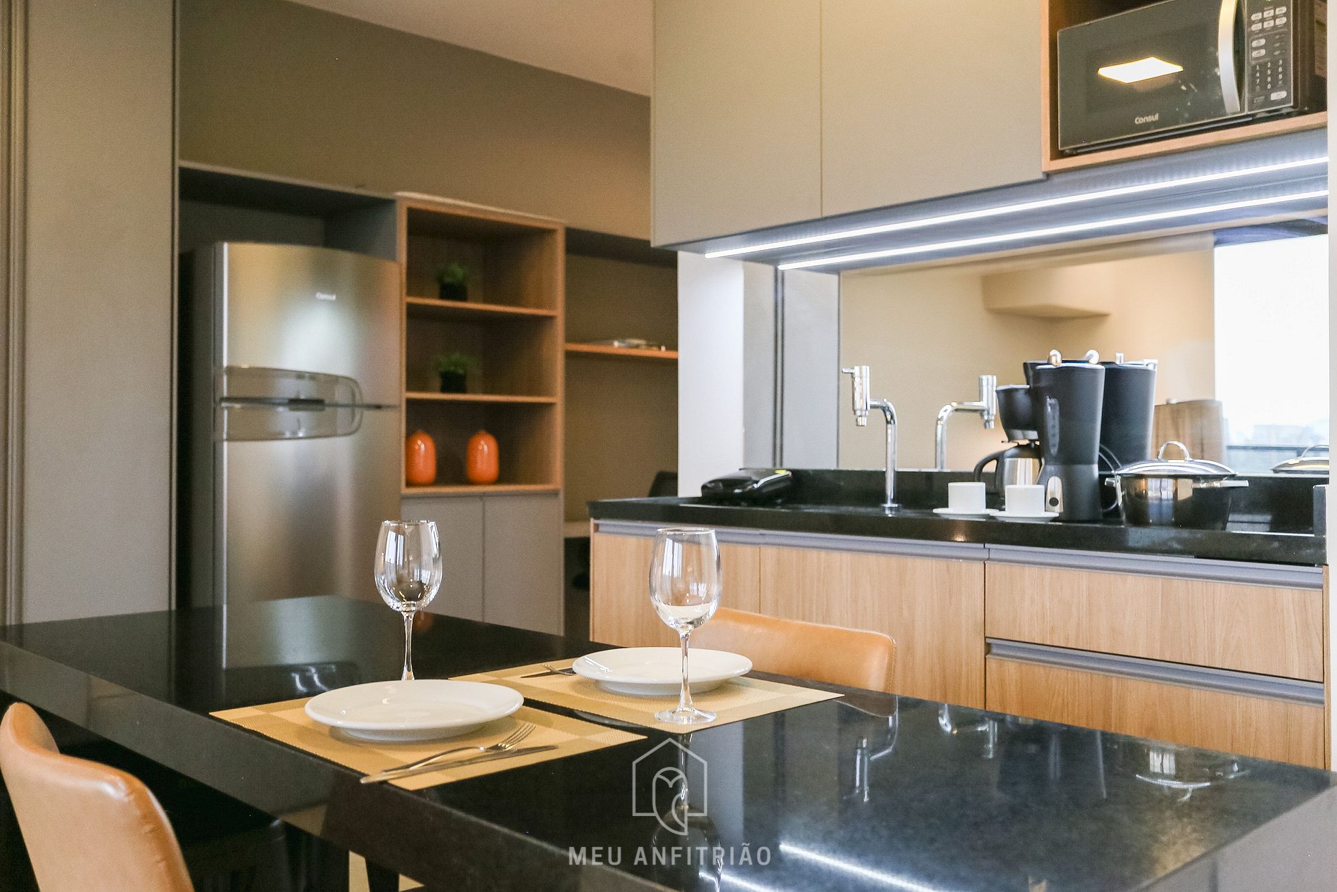 Entrando no studio, o hóspede terá acesso ao espaço para home office, que conta com mesa e cadeira. A cozinha dispõe de geladeira, fogão cooktop, microondas, liquidificador, sanduicheira, cafeteira e chaleira elétricas entre outros utensílios necessários para a estadia, além de uma mesa com bancos e cadeiras para refeições.