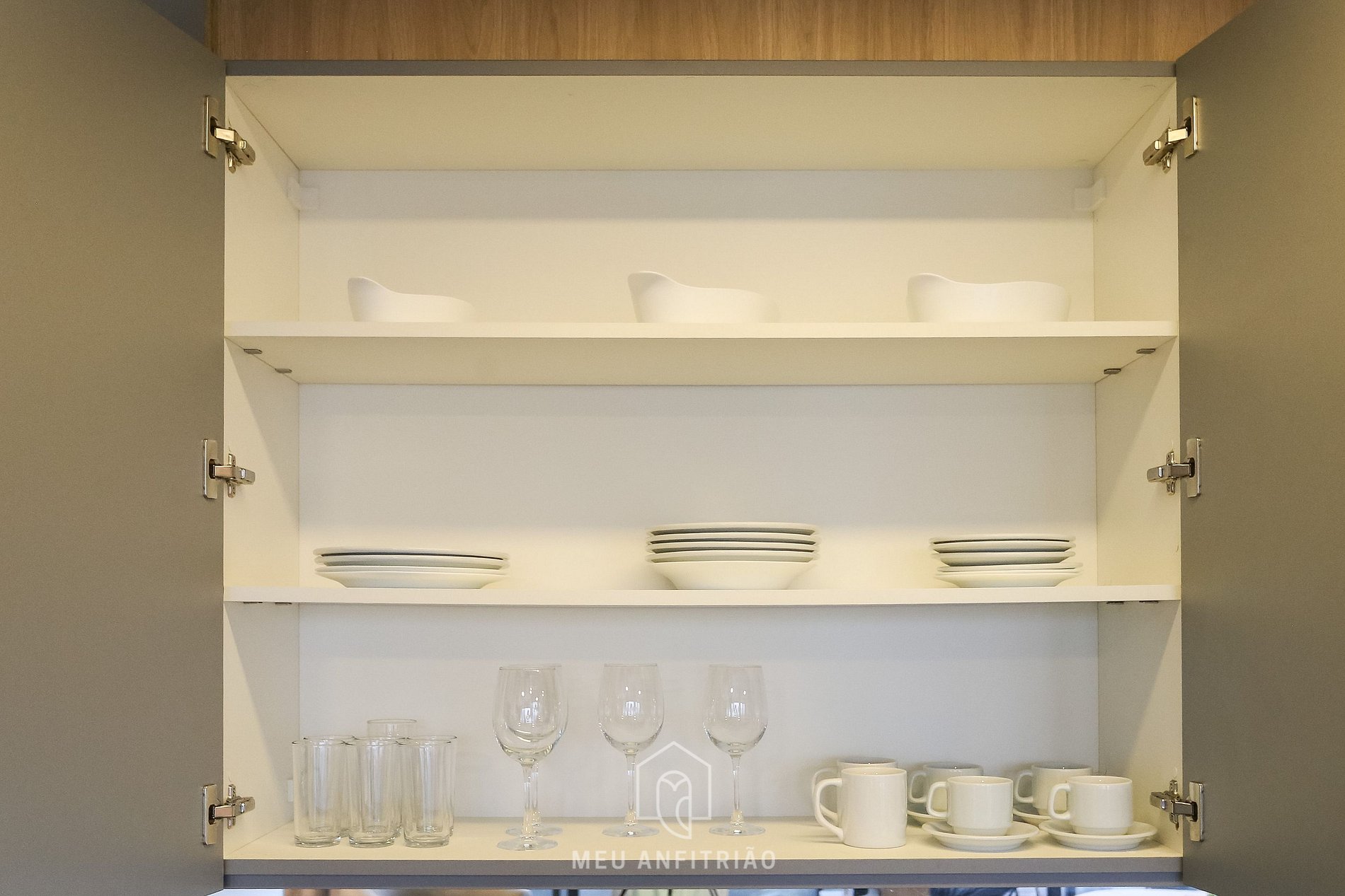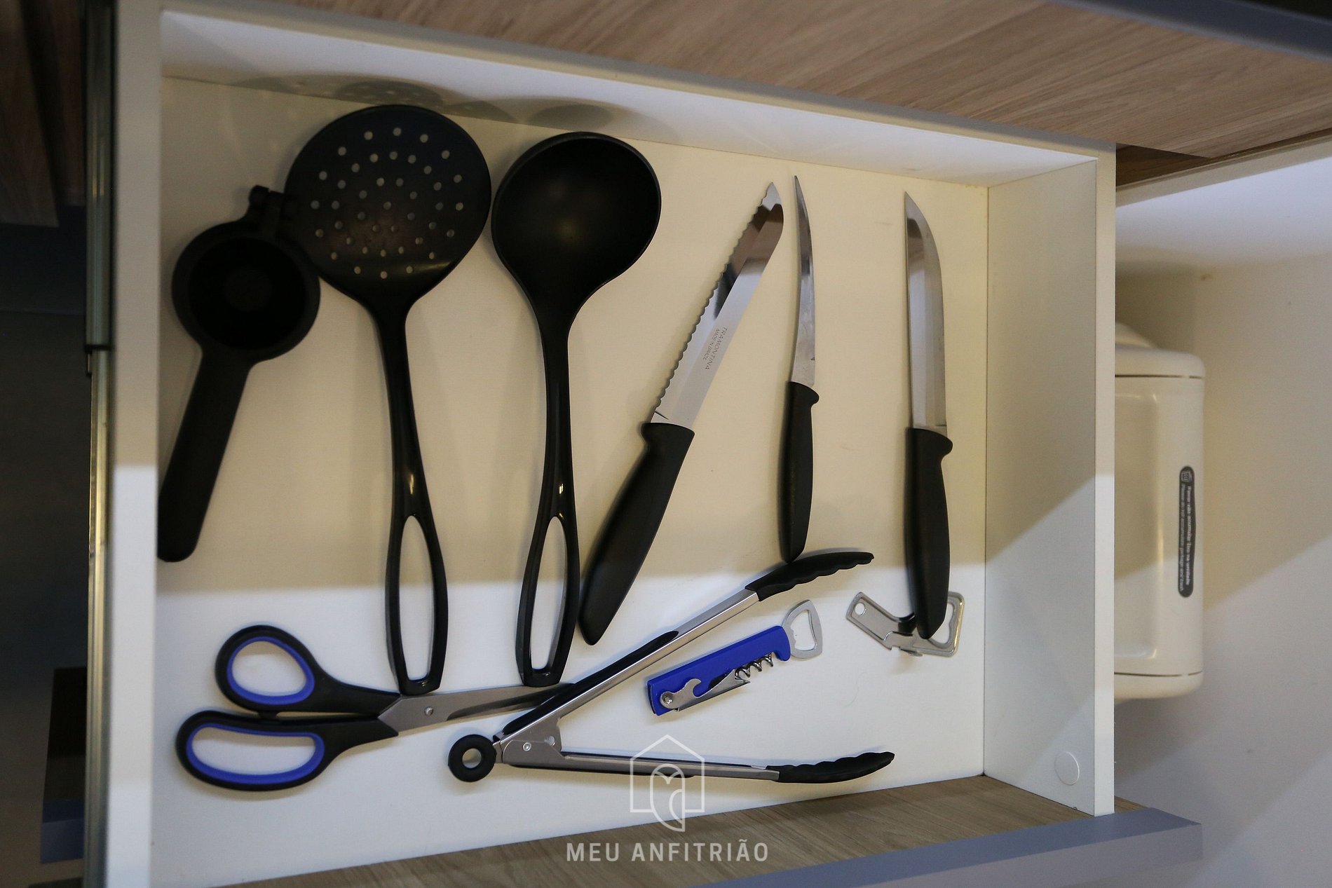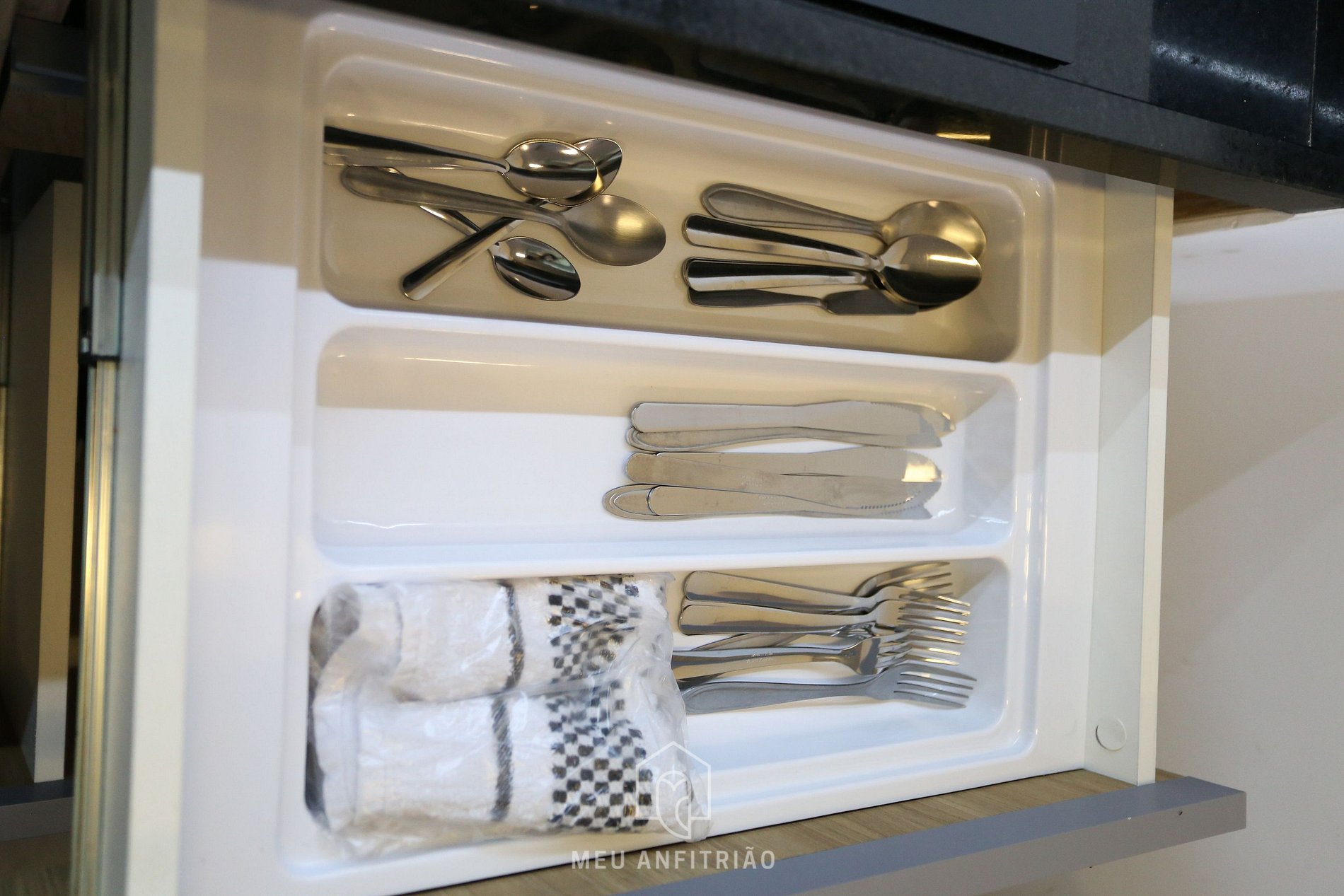 Entrando no studio, o hóspede terá acesso ao espaço para home office, que conta com mesa e cadeira. A cozinha dispõe de geladeira, fogão cooktop, microondas, liquidificador, sanduicheira, cafeteira e chaleira elétricas entre outros utensílios necessários para a estadia, além de uma mesa com bancos e cadeiras para refeições.