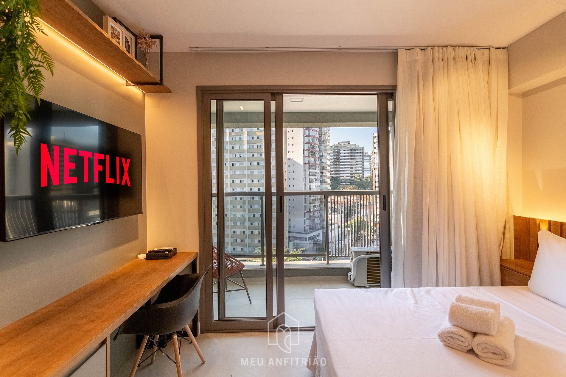 O studio é em conceito aberto, possui 27m² e acomoda até 2 pessoas em cama de casal. No mesmo espaço, dispomos de uma cozinha com utensílios necessários para uma estadia prática, banheiro, armário, mesa para refeições, TV Smart e espaço para home office.