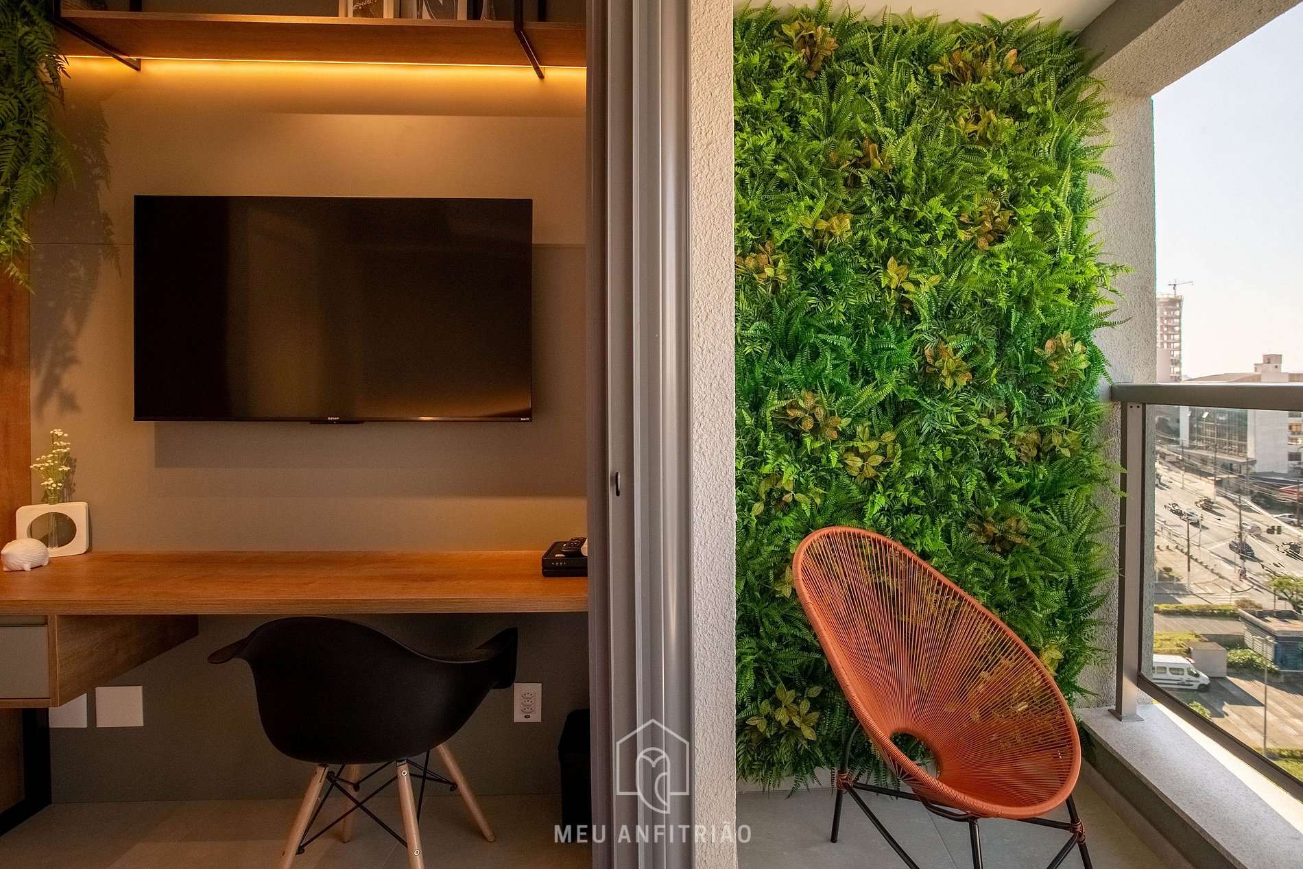 Uma porta de vidro divide o espaço com a varanda. No local, há uma cadeira de descanso em frente a um jardim vertical.
