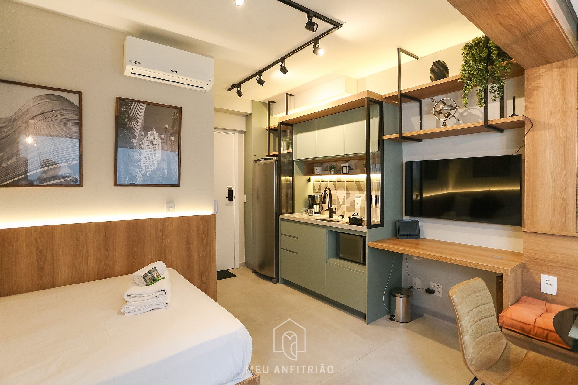 Nosso studio conta com um espaço de 20m² e acomoda 2 pessoas em uma cama de casal. O condomínio conta com portaria presencial 24h, academia e lavanderia compartilhada.