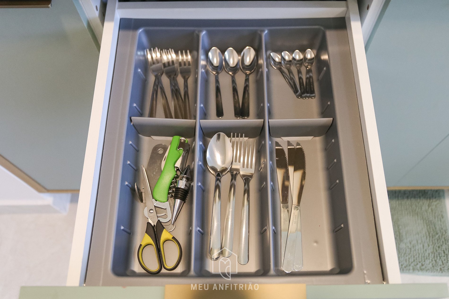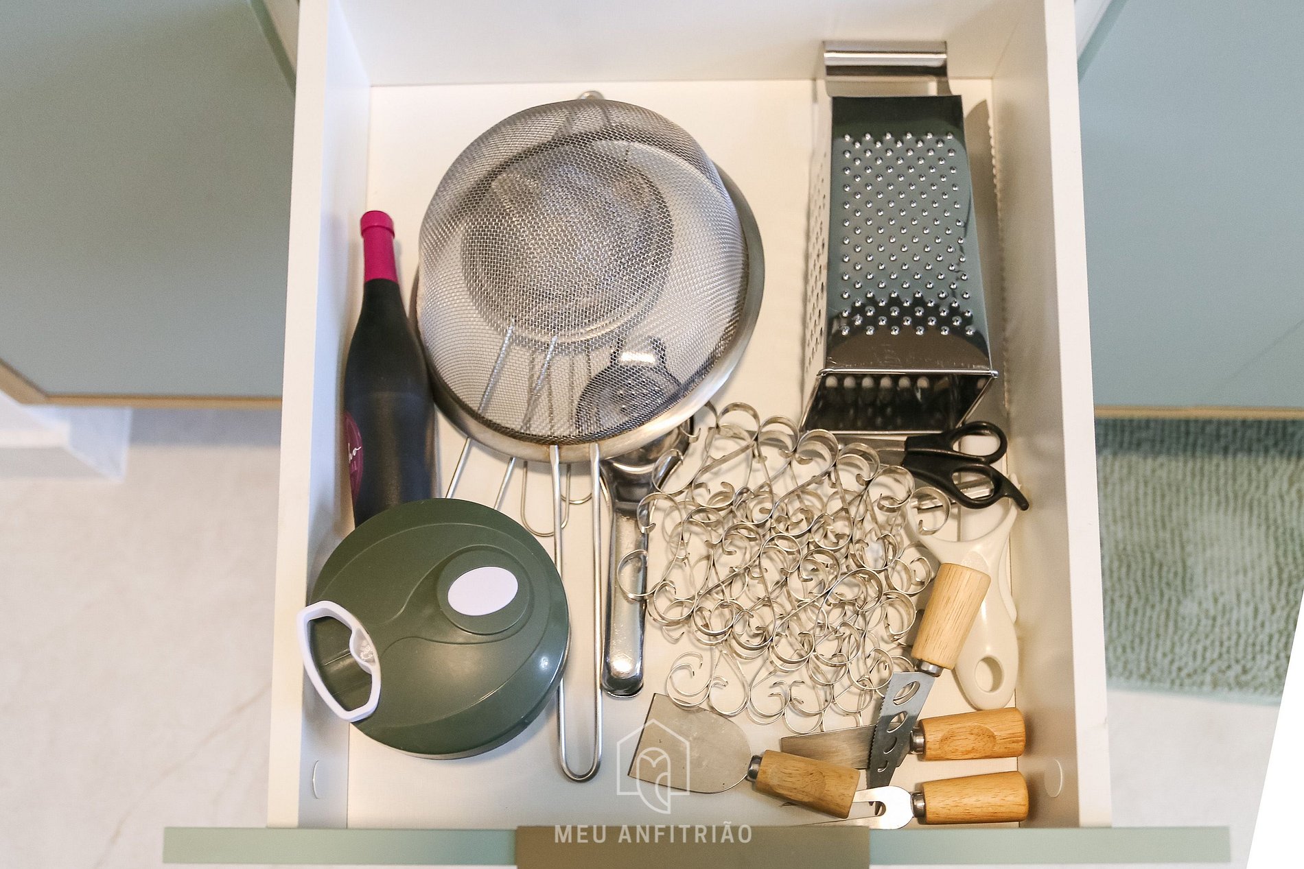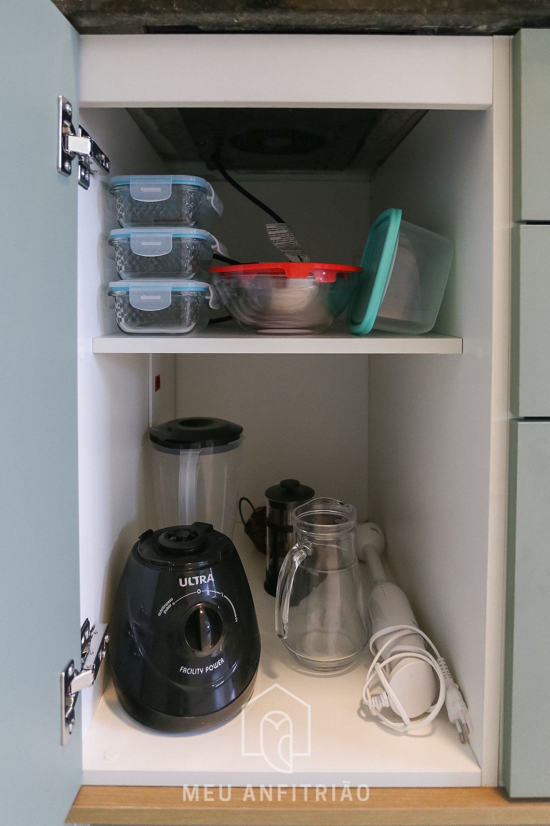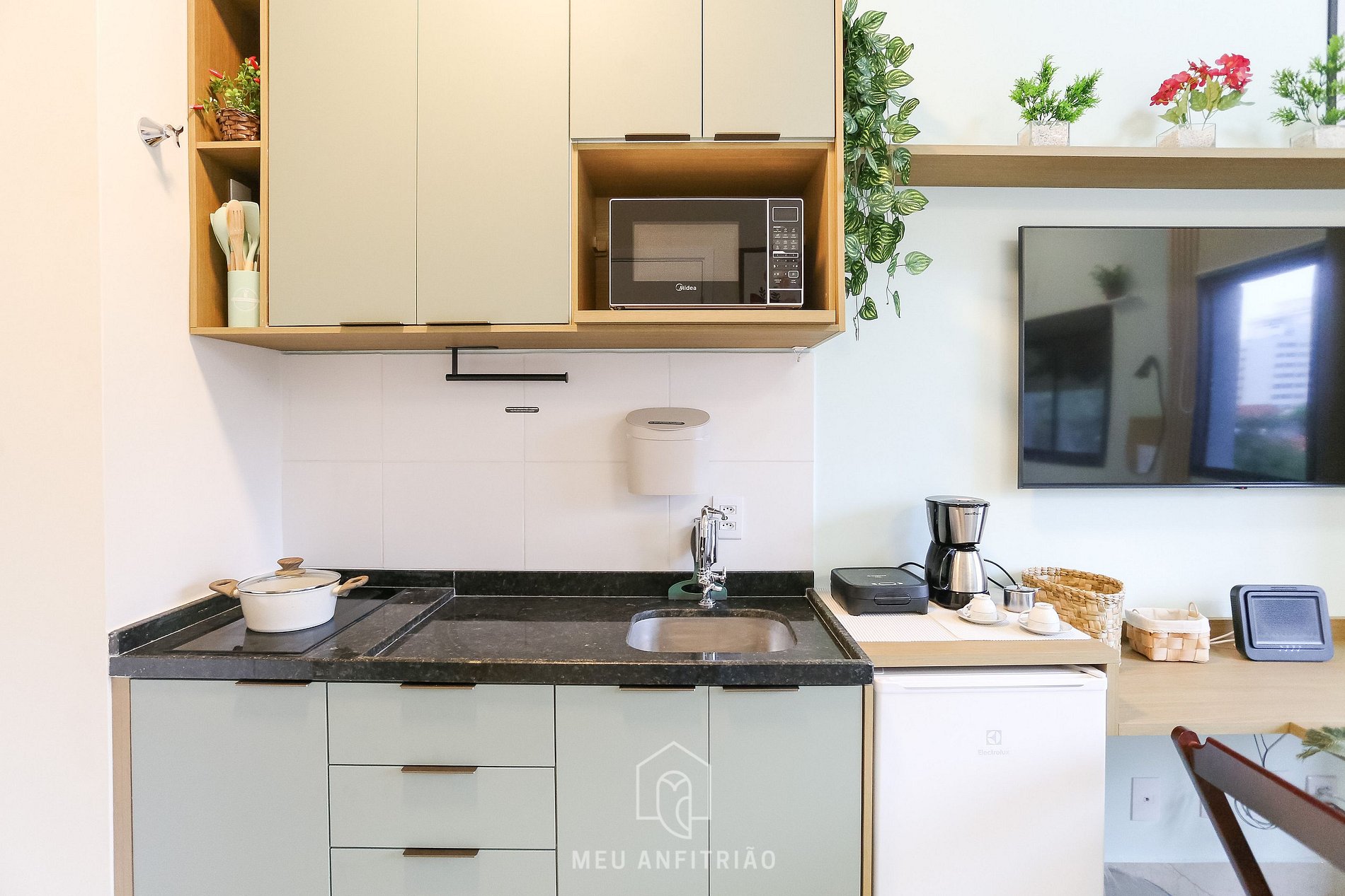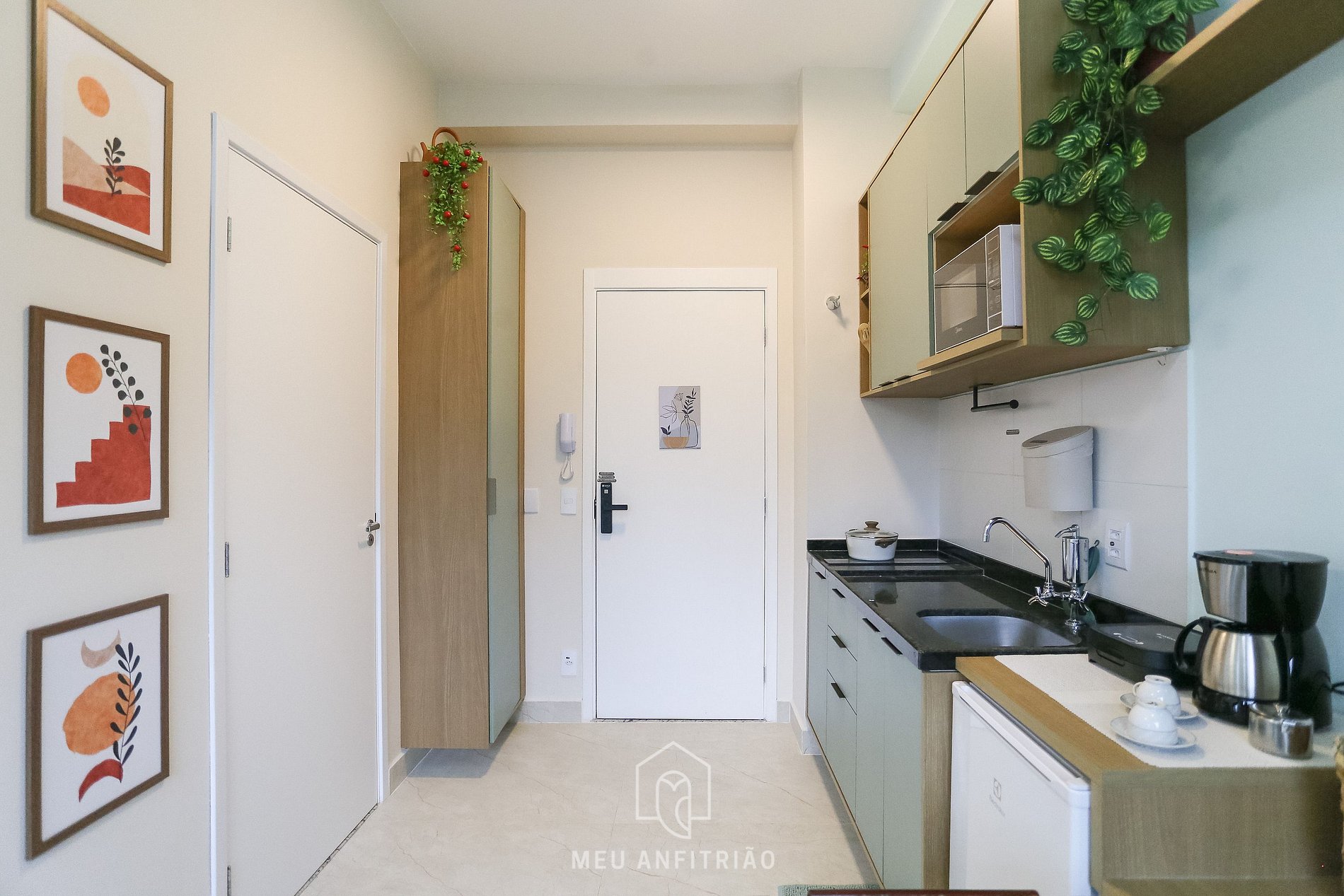 Ao entrar, o hóspede encontrará a cozinha, com os utensílios necessários para a estadia, como frigobar, fogão cooktop, micro-ondas, liquidificador, mixer, sanduicheira, cafeteira e chaleira elétricas, filtro d'água na torneira entre outros.