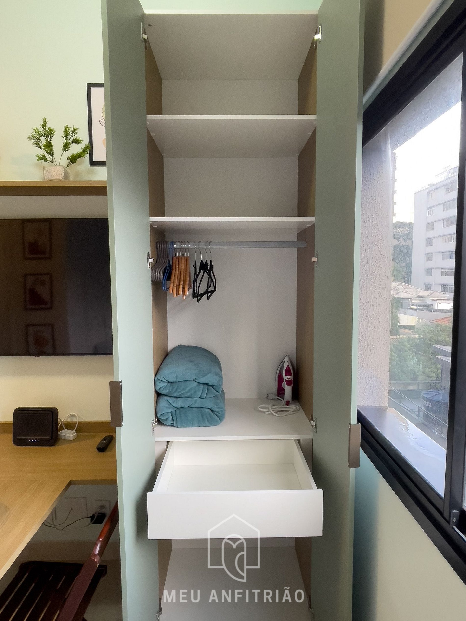 No mesmo ambiente, o studio também oferece ventilador de teto, mesa com cadeiras para refeições ou home office, WI-FI de alta velocidade, TV Smart, cortinas blackout, banheiro com chuveiro a gás e secador de cabelos.