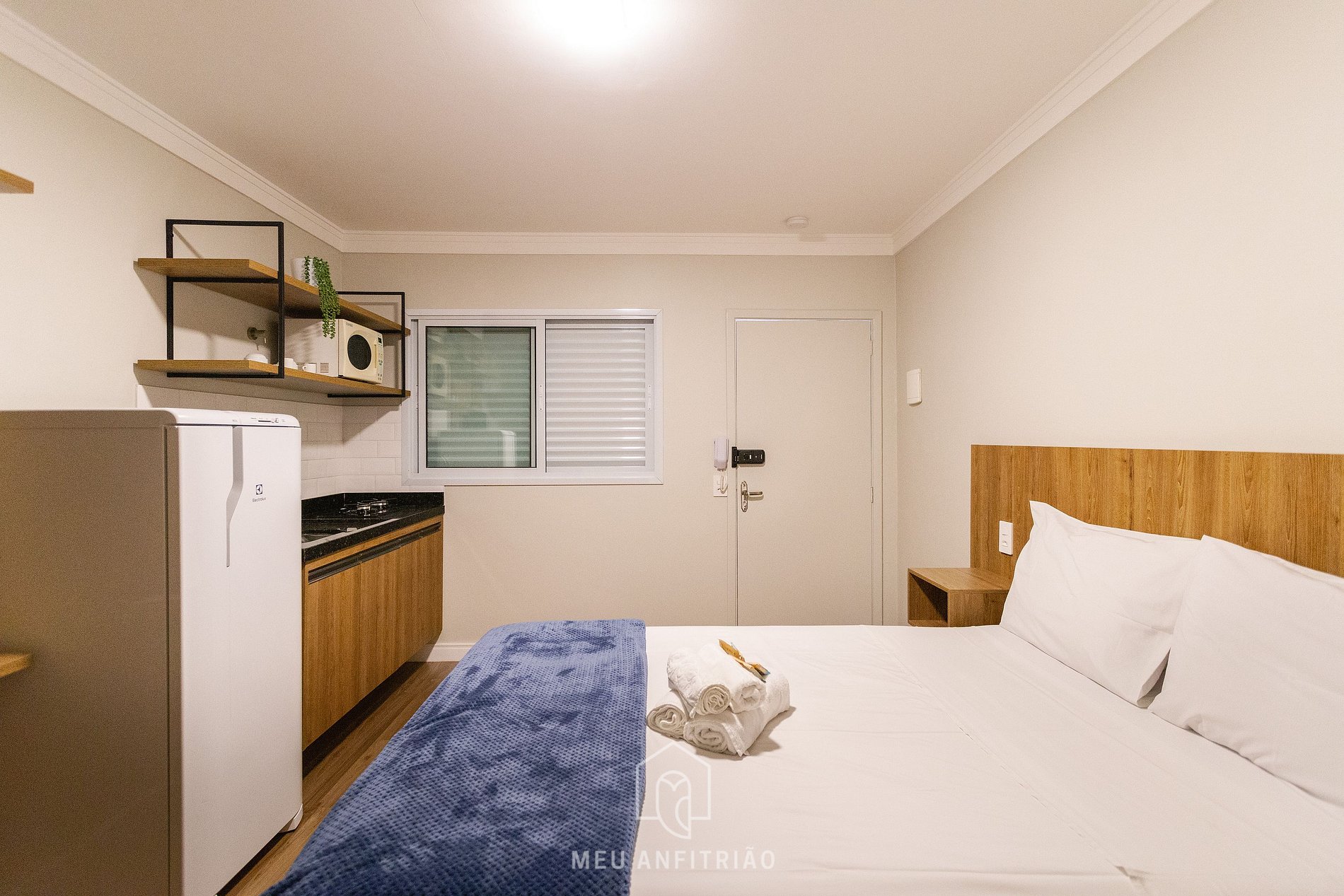 O hóspede terá acesso à cozinha ao entrar no studio, que conta com tudo que precisa para uma estadia prática, como geladeira, fogão cooktop, micro-ondas e outros utensílios essenciais para a estadia.