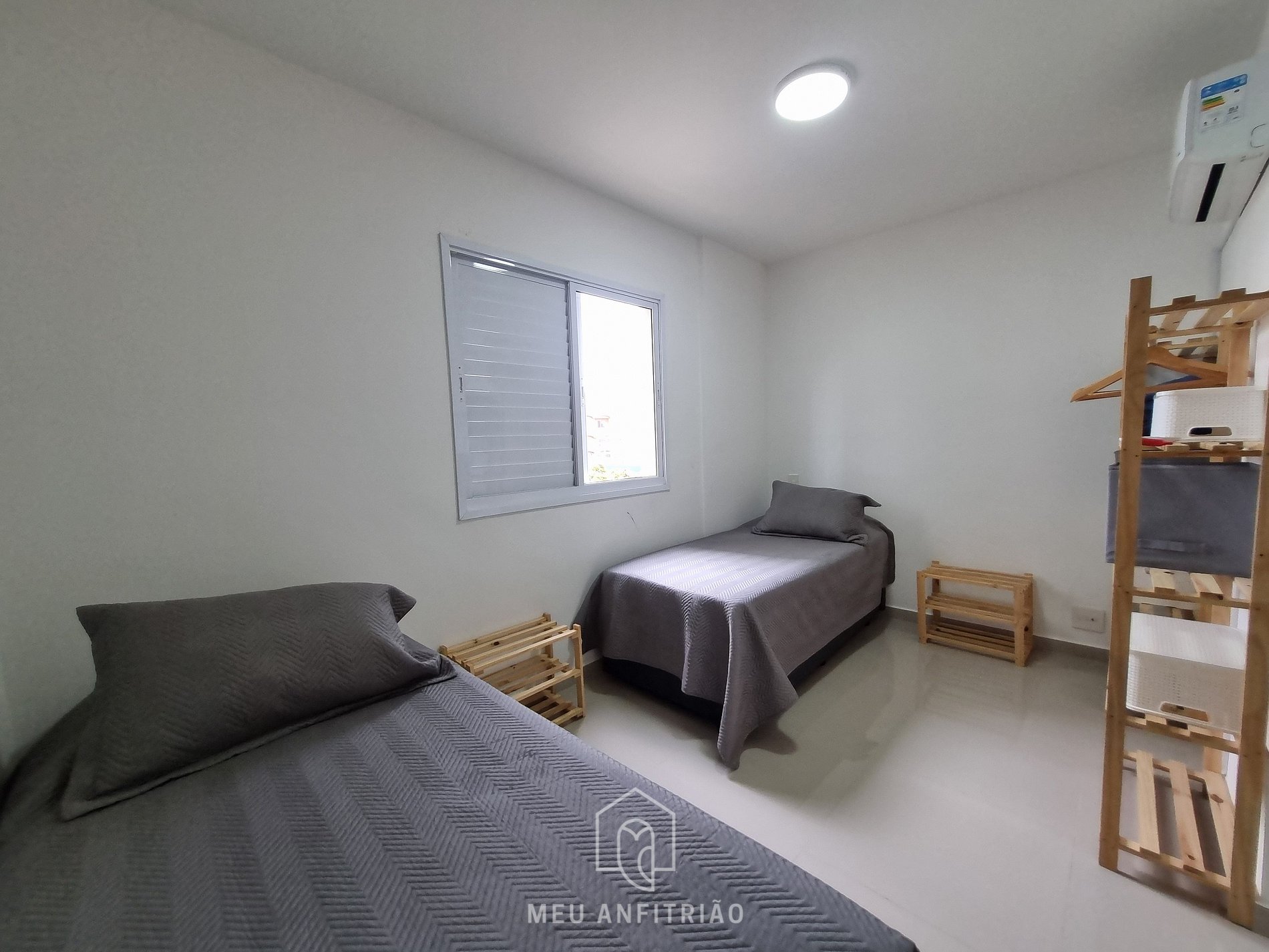 - Dormitórios: O apartamento possui 74m², com ambientes bem decorados, arejados e preparados para acomodar até 5 hóspedes. São 2 dormitórios, sendo 1 suíte com uma cama de solteiro e uma bicama, e 1 quarto com cama de casal, com banheiro localizado no corredor. Ambos os quartos contam com ar-condicionado e TV.