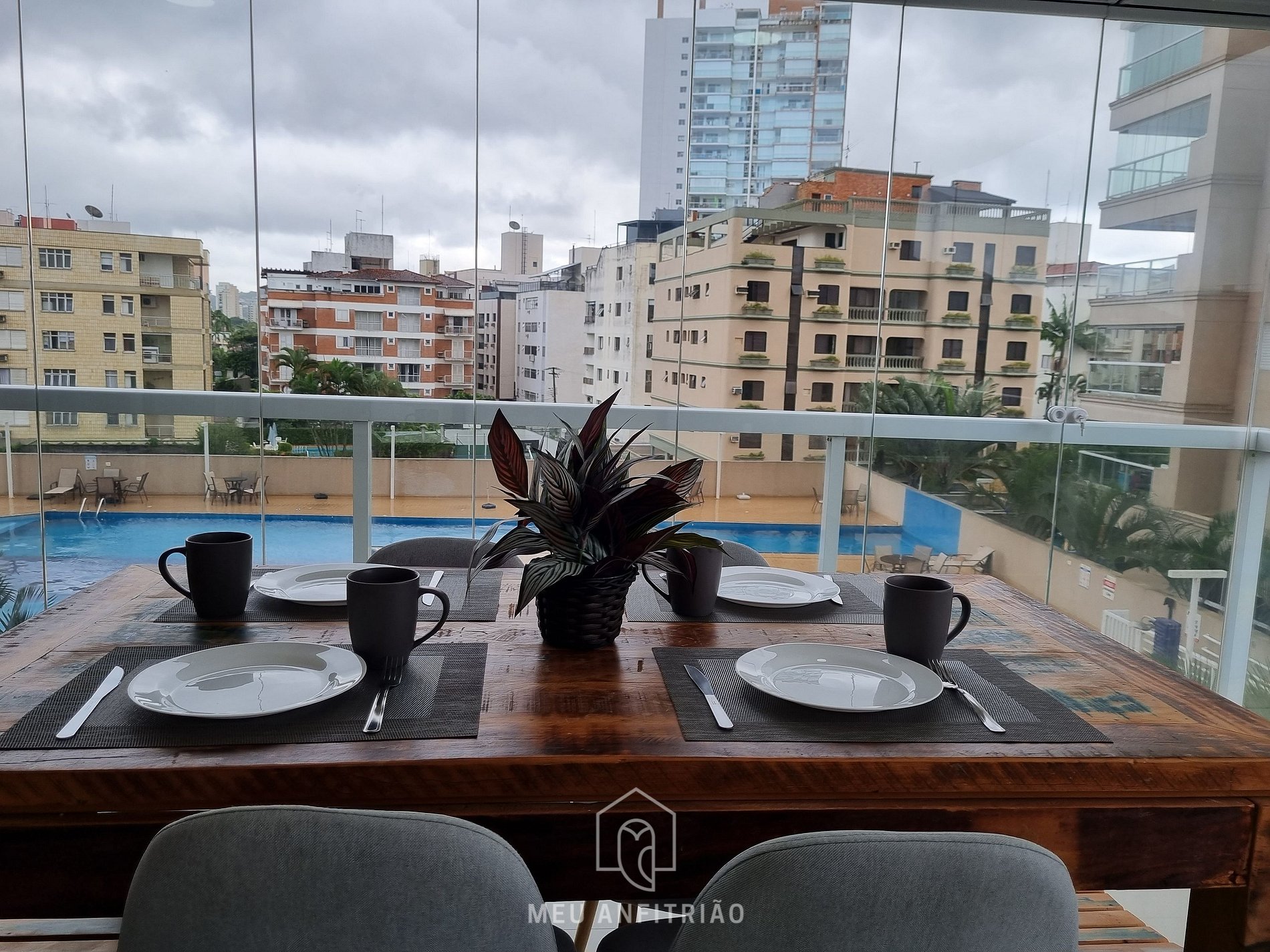 - Área gourmet: O apartamento também dispõe de área gourmet com churrasqueira, mesa para refeições e vista para a piscina do condomínio, além de persianas nas janelas que ajudam a controlar a luminosidade do ambiente.