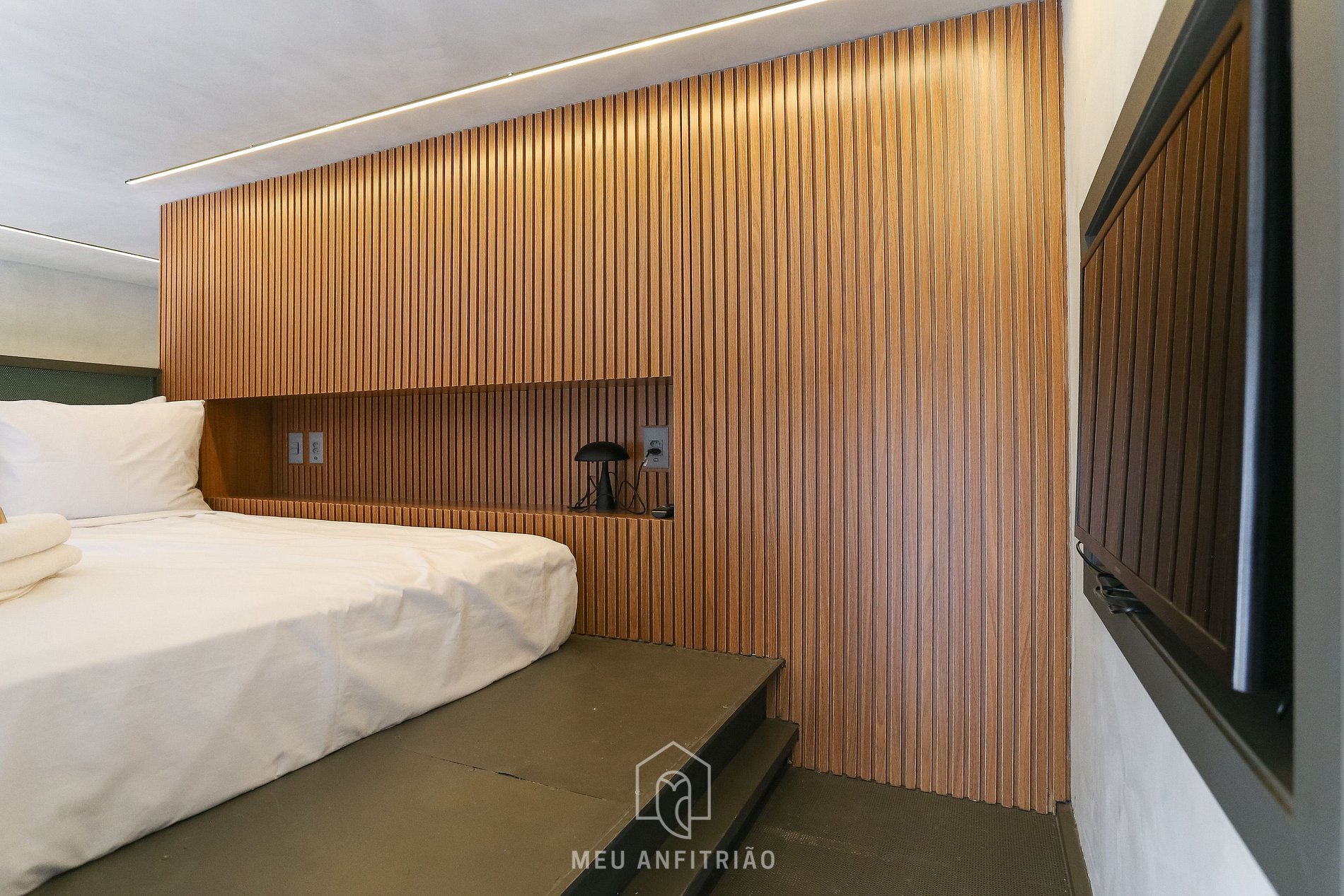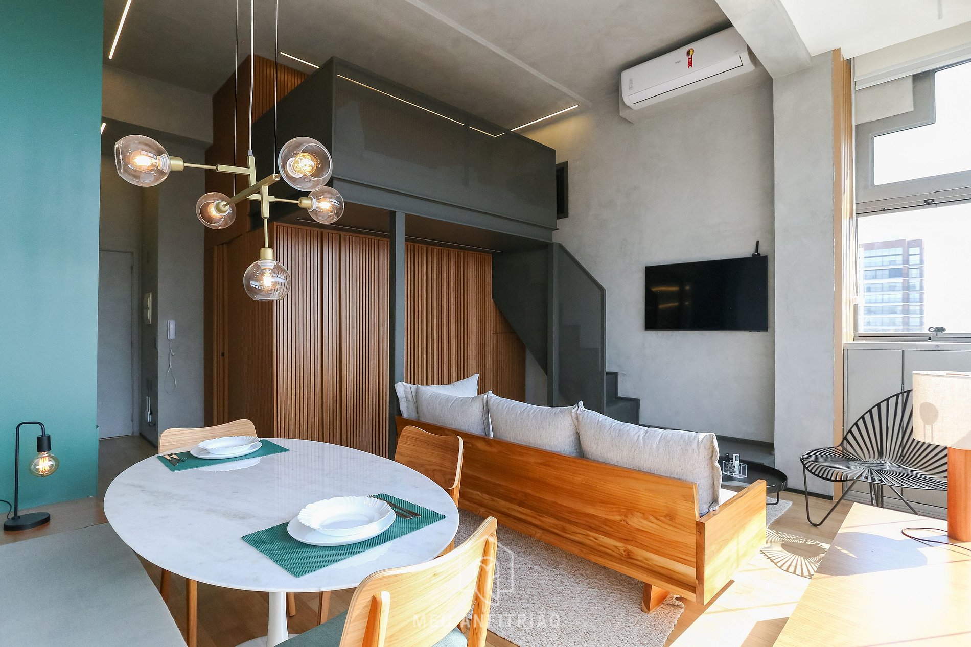 Apartamento de 35m² com pé-direito alto, cama de casal no mezanino para acomodar 2 pessoas e estrutura completa para uma estadia confortável.