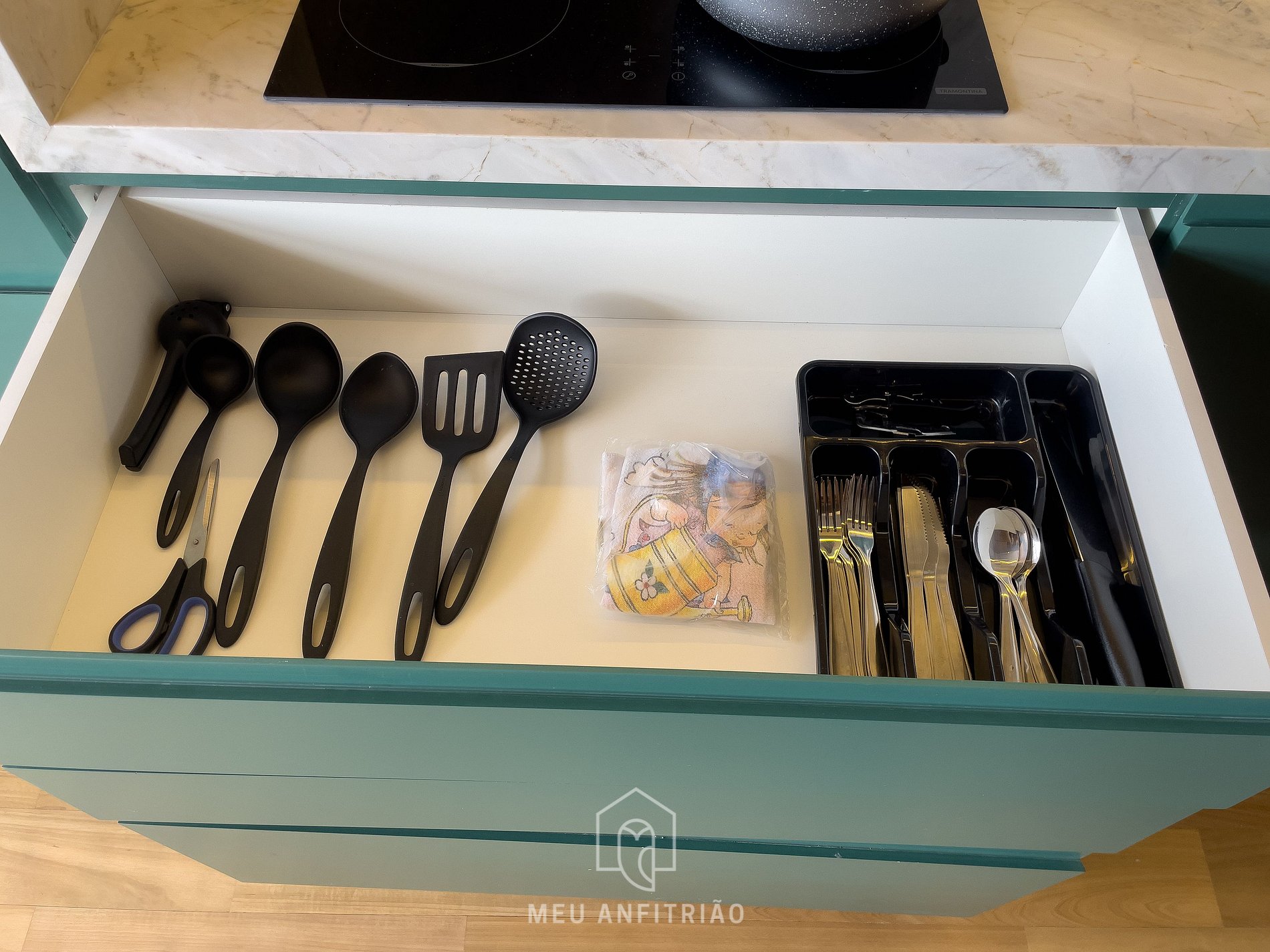 Ao entrar no apartamento, encontra-se a cozinha equipada com os principais utensílios para o dia a dia: geladeira, fogão cooktop, micro-ondas, forno, sanduicheira, liquidificador, cafeteira elétrica e mais.