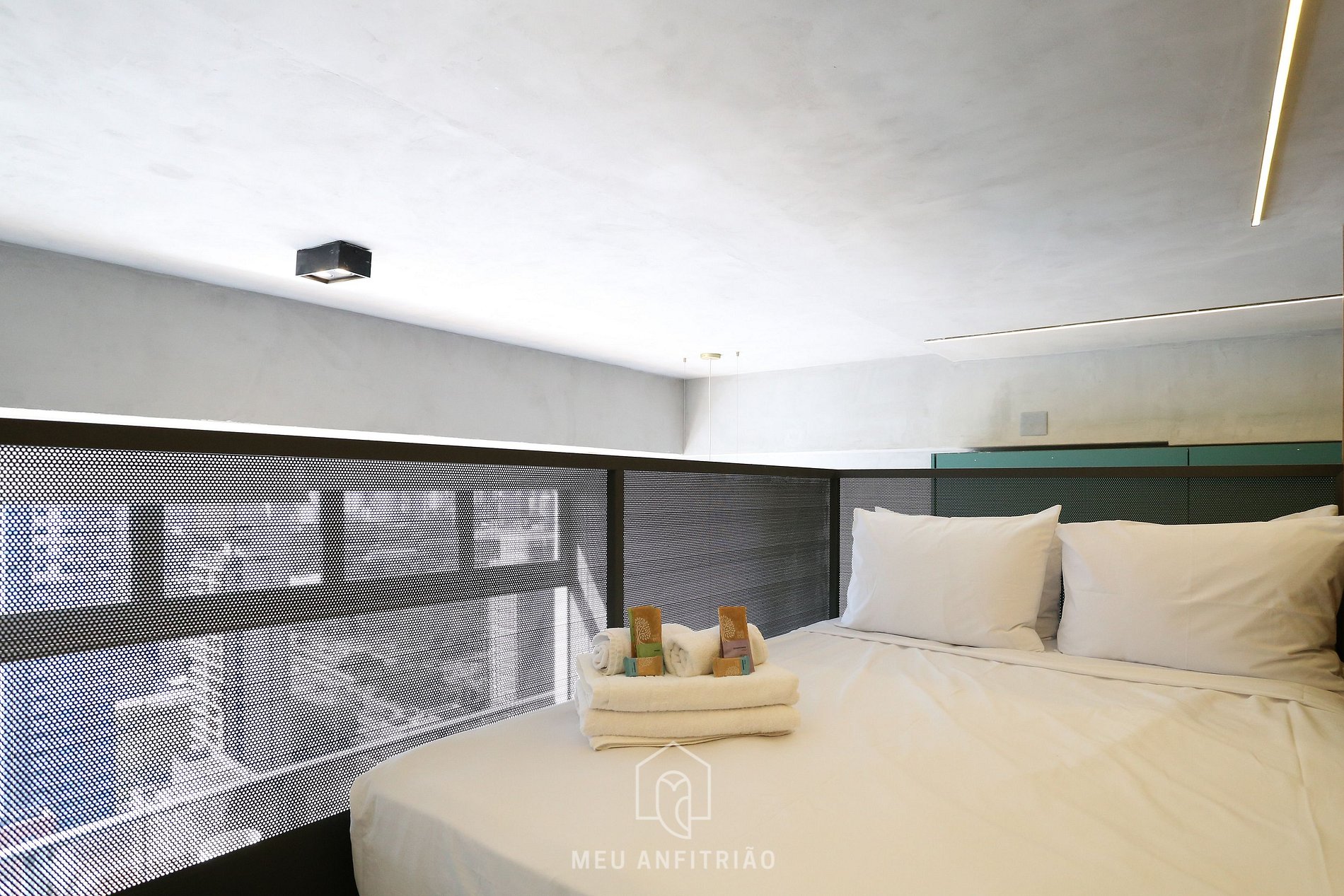 Apartamento de 35m² com pé-direito alto, cama de casal no mezanino para acomodar 2 pessoas e estrutura completa para uma estadia confortável.