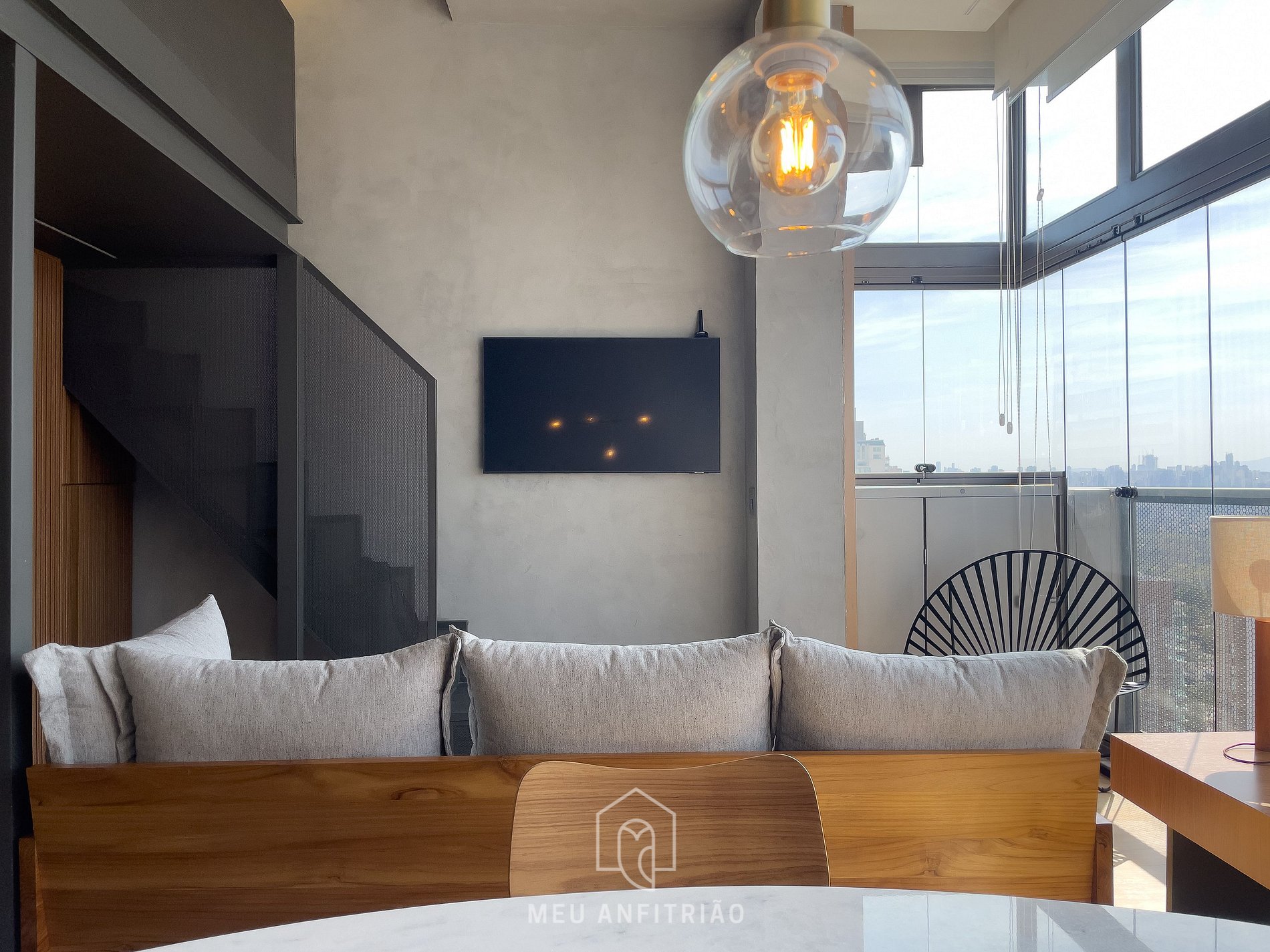 A sala de estar conta com sofá, mesa com cadeiras e banco de apoio, ideal tanto para refeições quanto para home office. O ambiente ainda oferece TV Smart e janelas de vidro com persianas, proporcionando uma vista ampla da cidade.