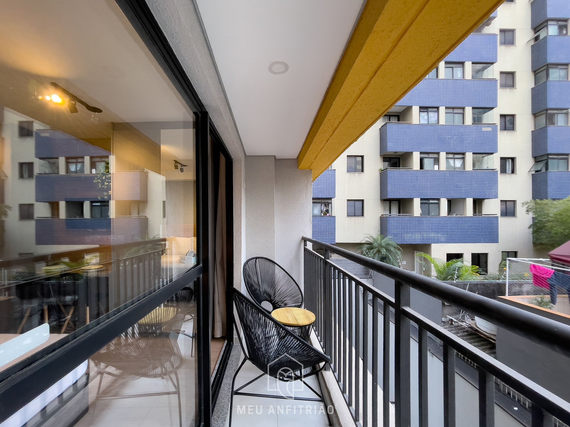 A varanda é separada por uma porta de vidro com cortinas blackout e oferece uma mesa com cadeiras, ideal para aproveitar a vista com conforto.