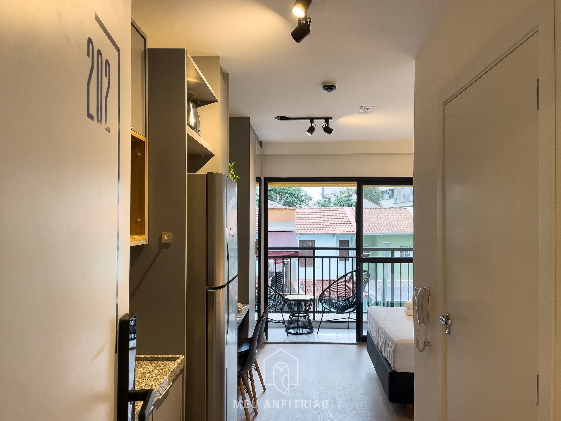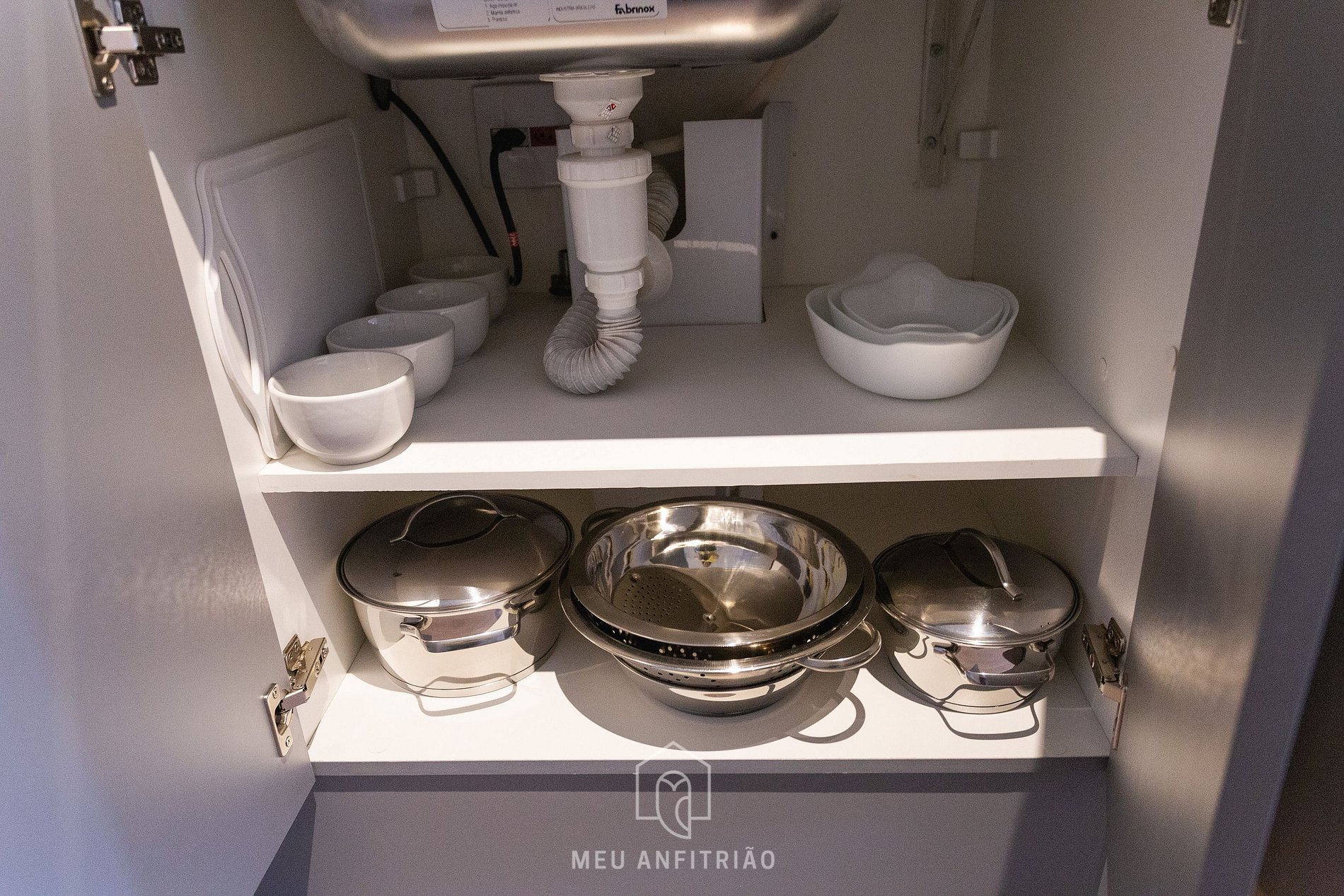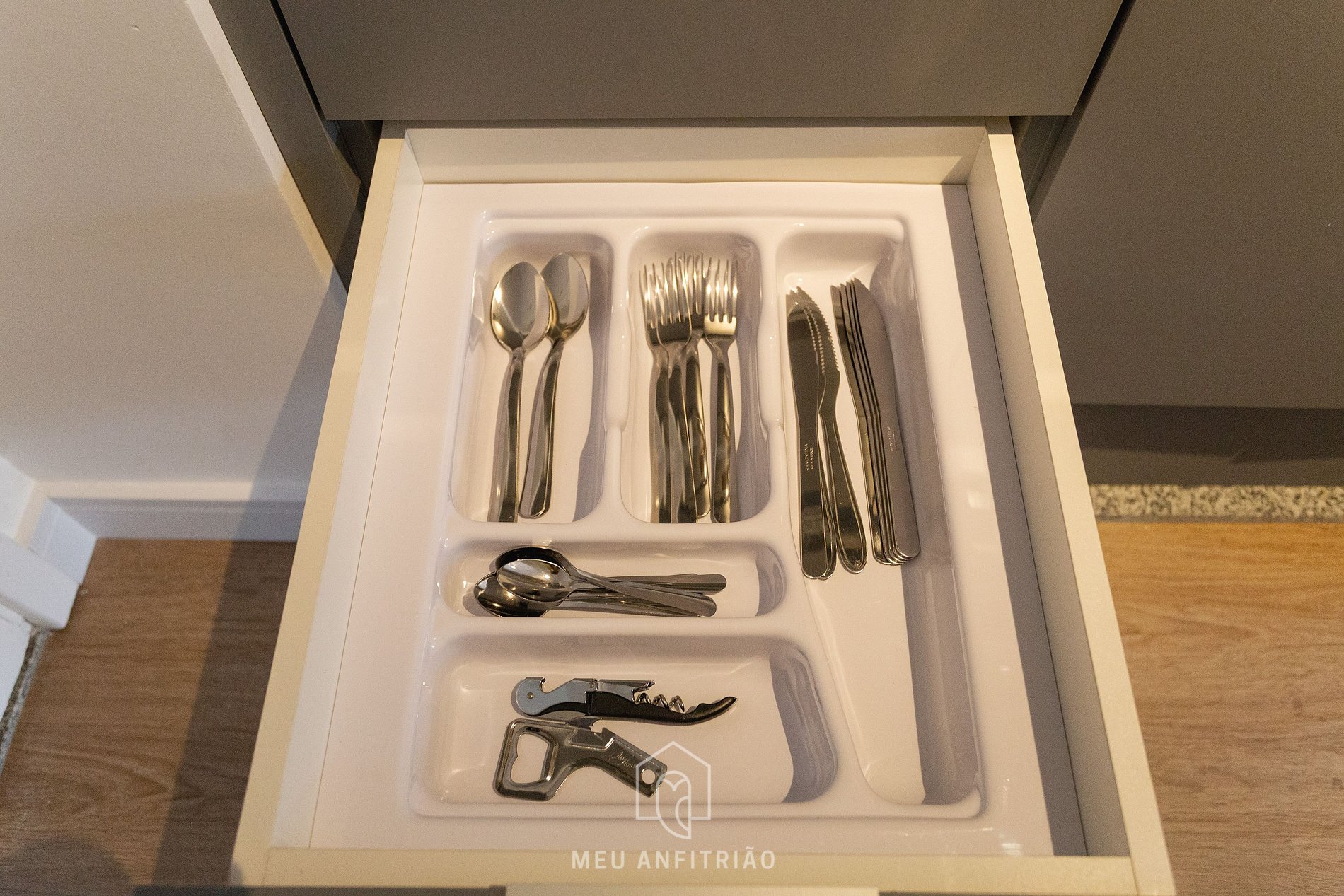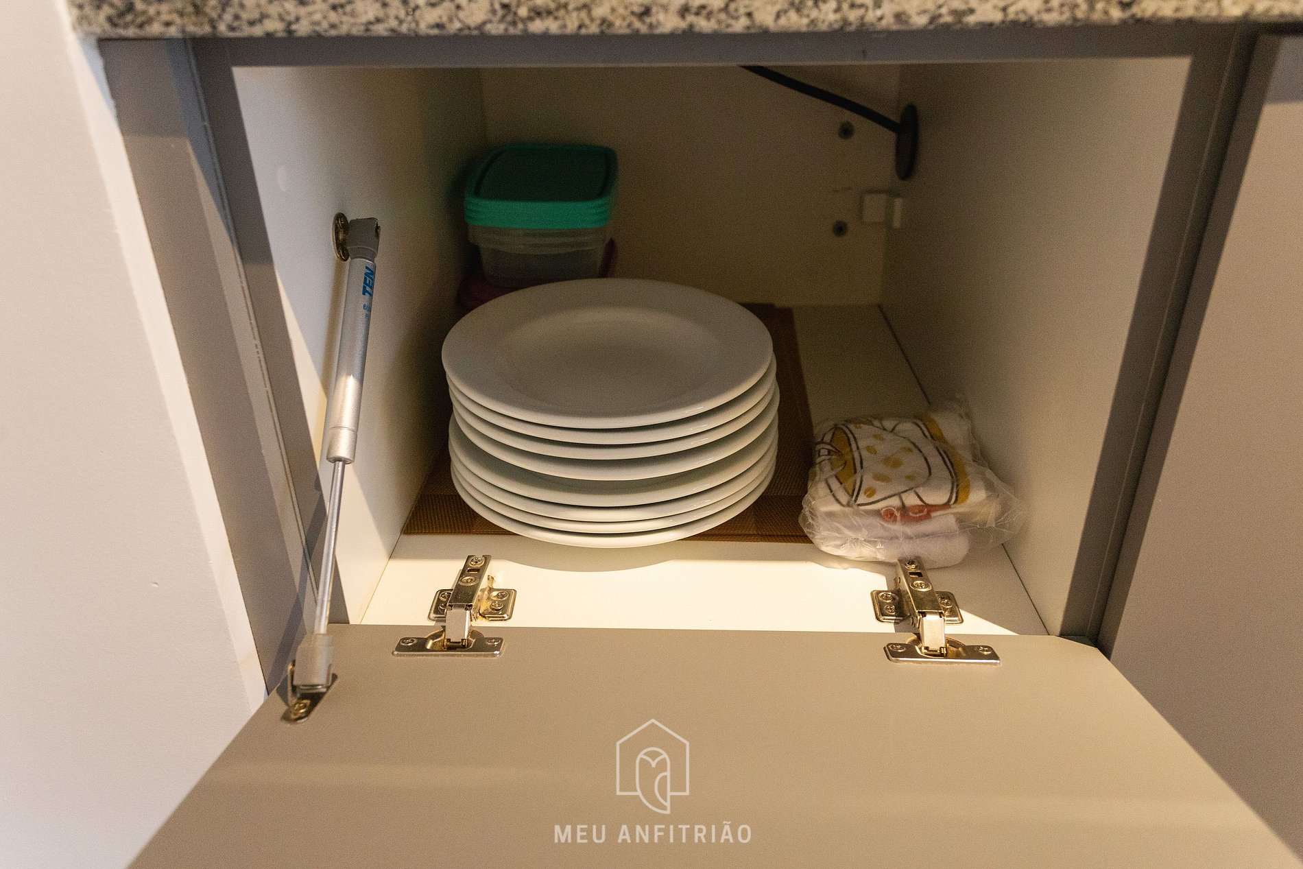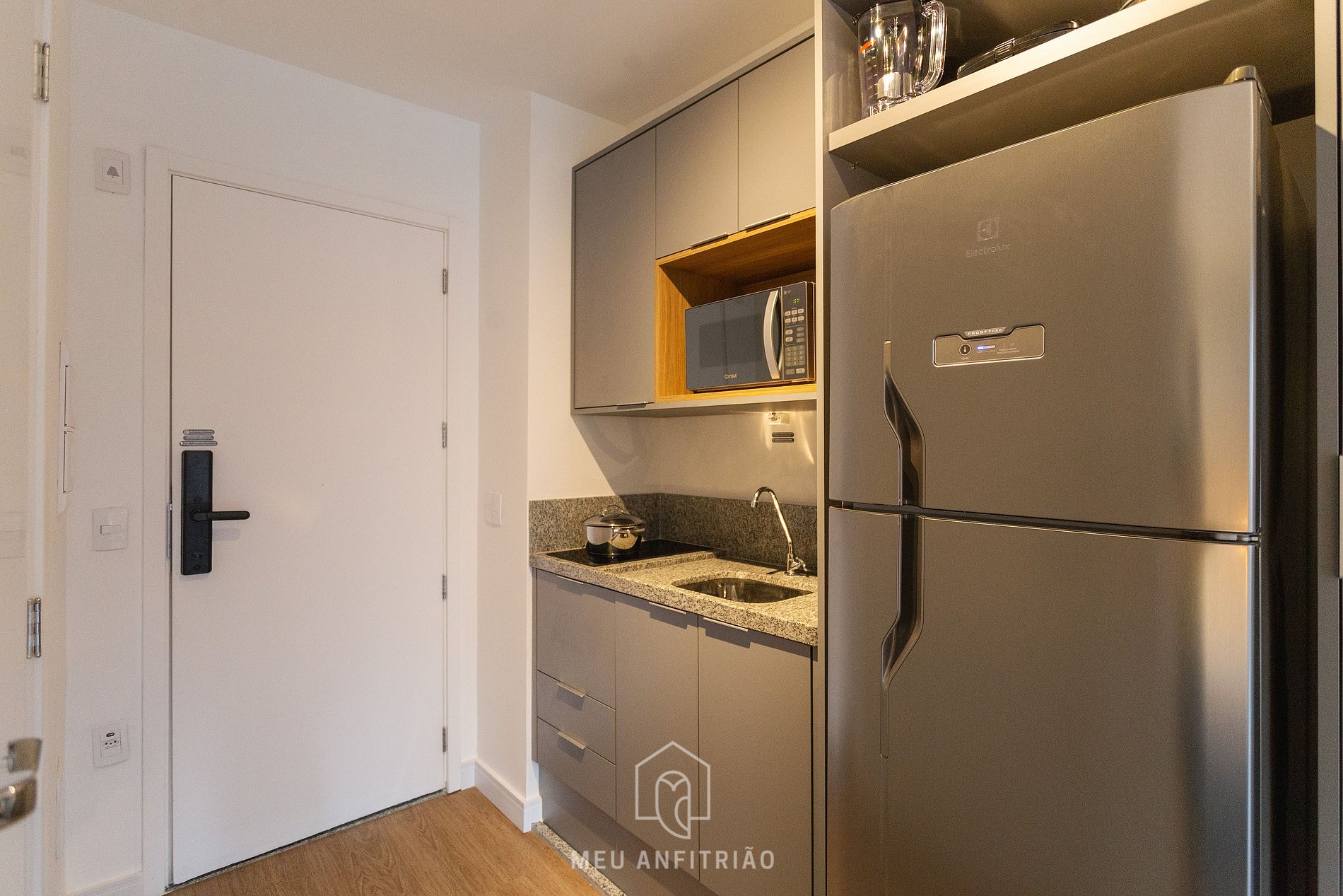 Ao entrar no studio, o hóspede encontrará a cozinha equipada com os principais itens para o dia a dia, como fogão cooktop, geladeira, micro-ondas, cafeteira e chaleira elétricas, sanduicheira, liquidificador e outros utensílios que tornam a estadia mais prática.