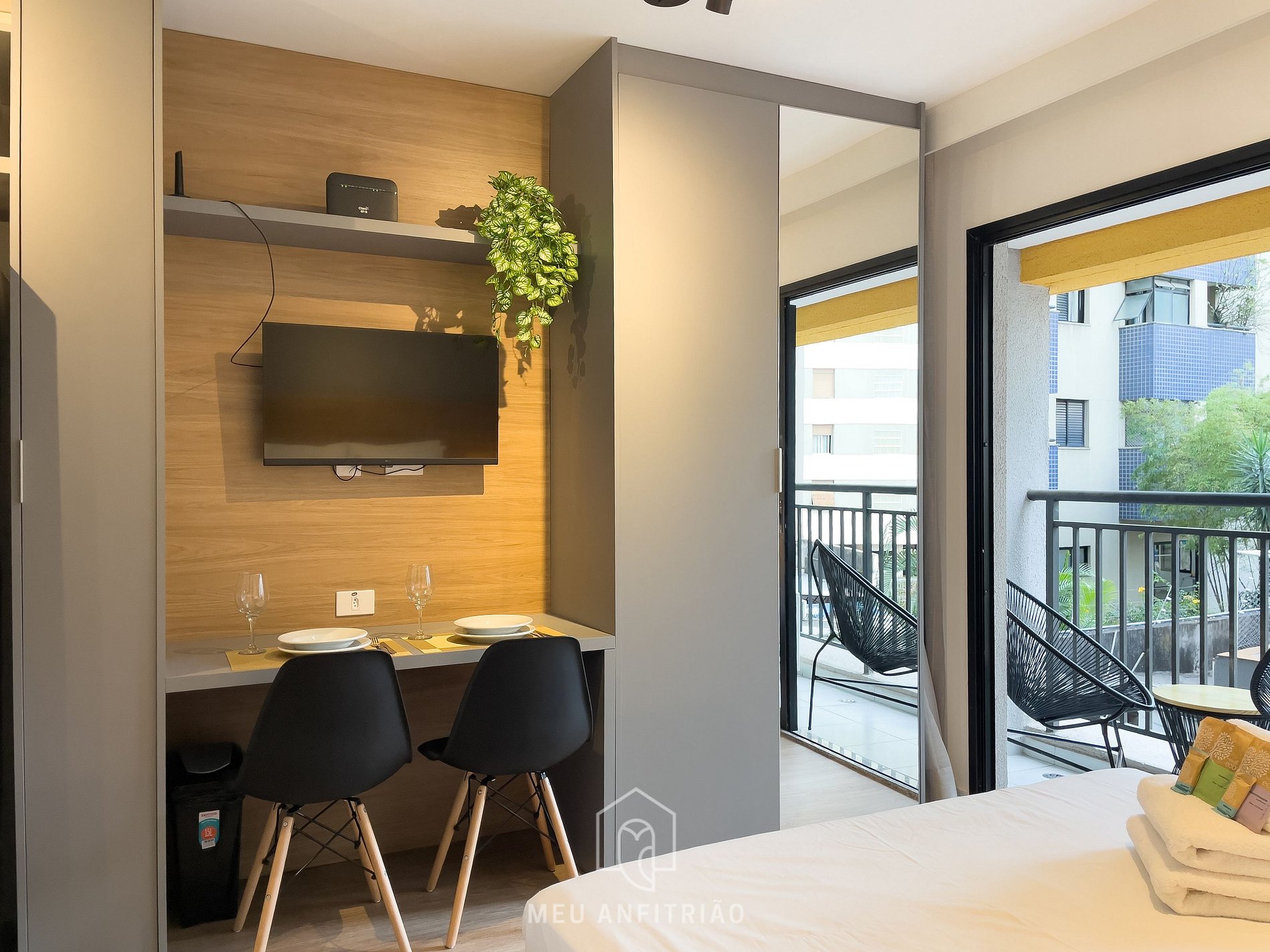 O espaço conta ainda com ar-condicionado, mesa com cadeiras para refeições, outra mesa com cadeiras dedicada ao home office, TV Smart LG, WI-FI de alta velocidade, guarda-roupas, ferro de passar roupa, além de um banheiro com chuveiro elétrico e secador de cabelo.