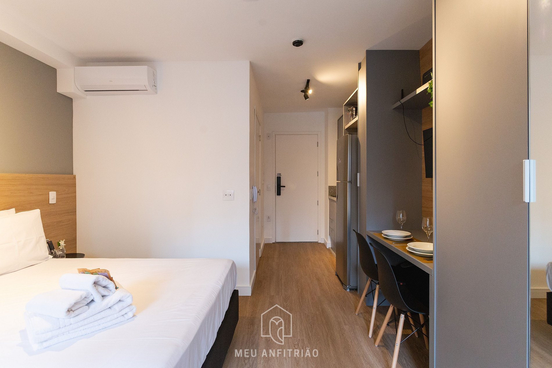 El condominio My One Bela Vista ofrece estudios completos de aproximadamente 24m² y cuenta con recepción 24 horas y un área de ocio completa, además de varias comodidades dentro del edificio y en la región para ayudarle durante su estancia.