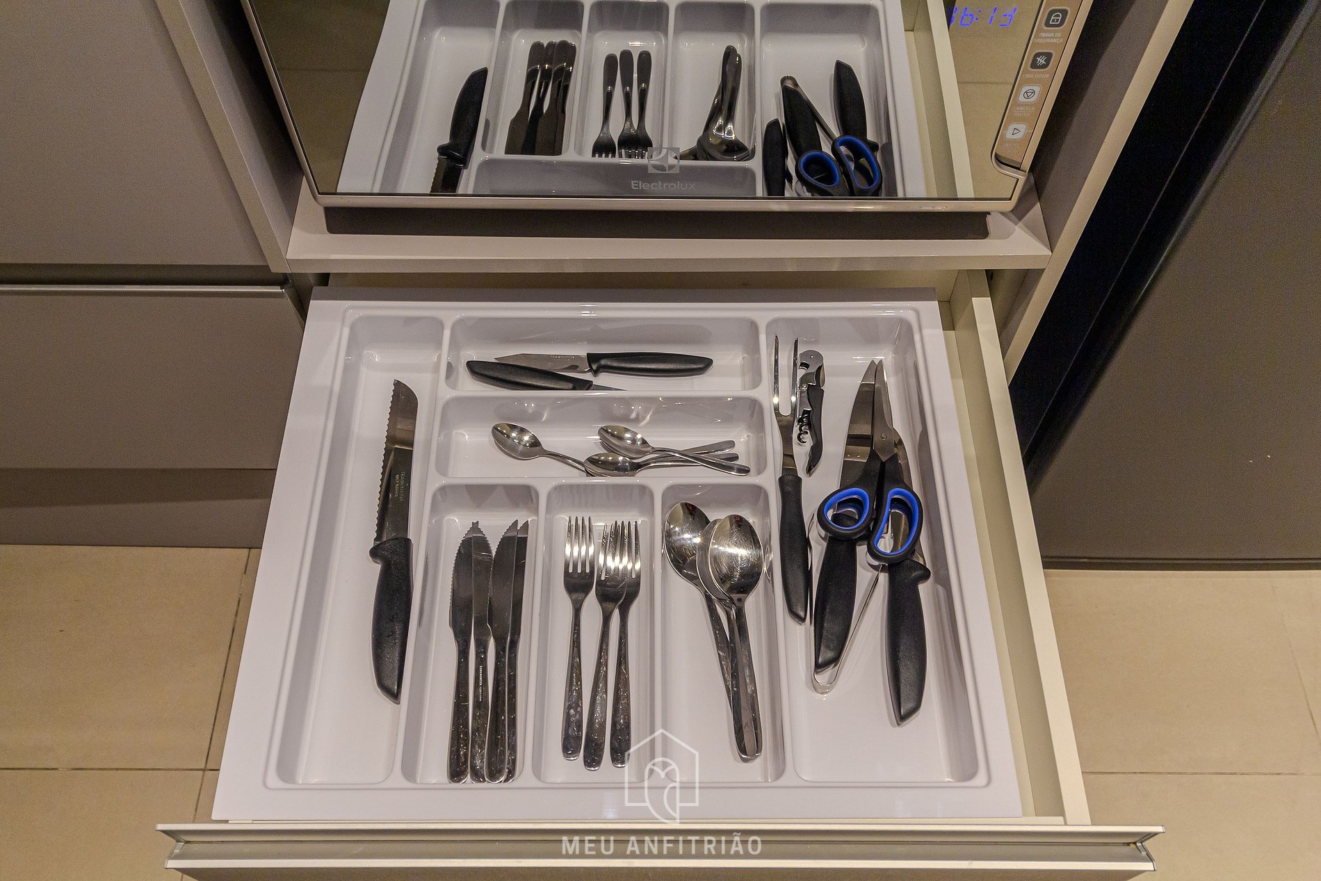 Ao entrar, o hóspede estará na cozinha, que conta com os utensílios necessários para uma estadia prática, como frigobar, fogão cooktop, micro-ondas, cafeteira Dolce Gusto, sanduicheira entre outros. Dispomos de mesa com cadeiras para refeições ou home office, além de um pequeno futón.