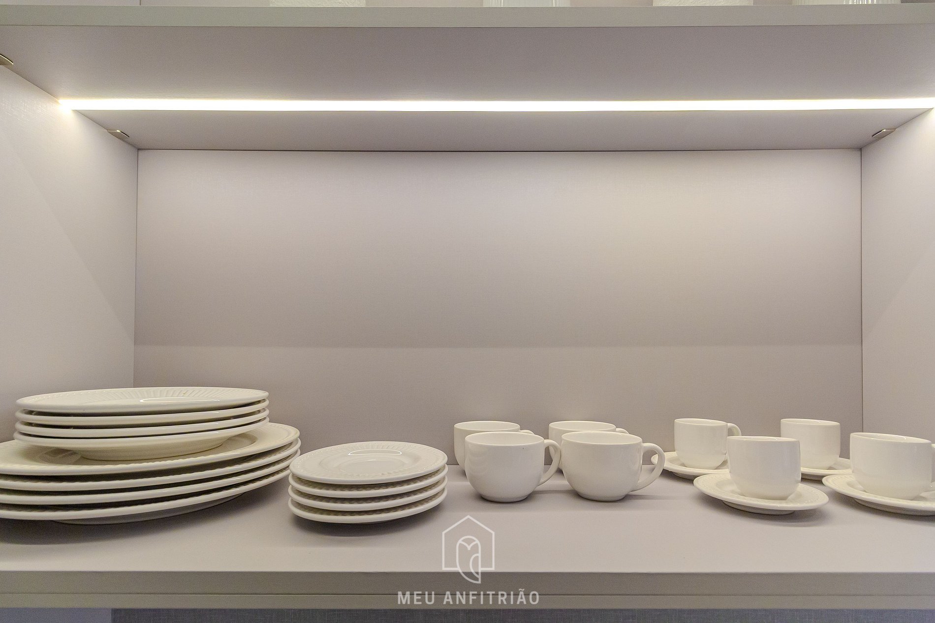 Ao entrar, o hóspede estará na cozinha, que conta com os utensílios necessários para uma estadia prática, como frigobar, fogão cooktop, micro-ondas, cafeteira Dolce Gusto, sanduicheira entre outros. Dispomos de mesa com cadeiras para refeições ou home office, além de um pequeno futón.