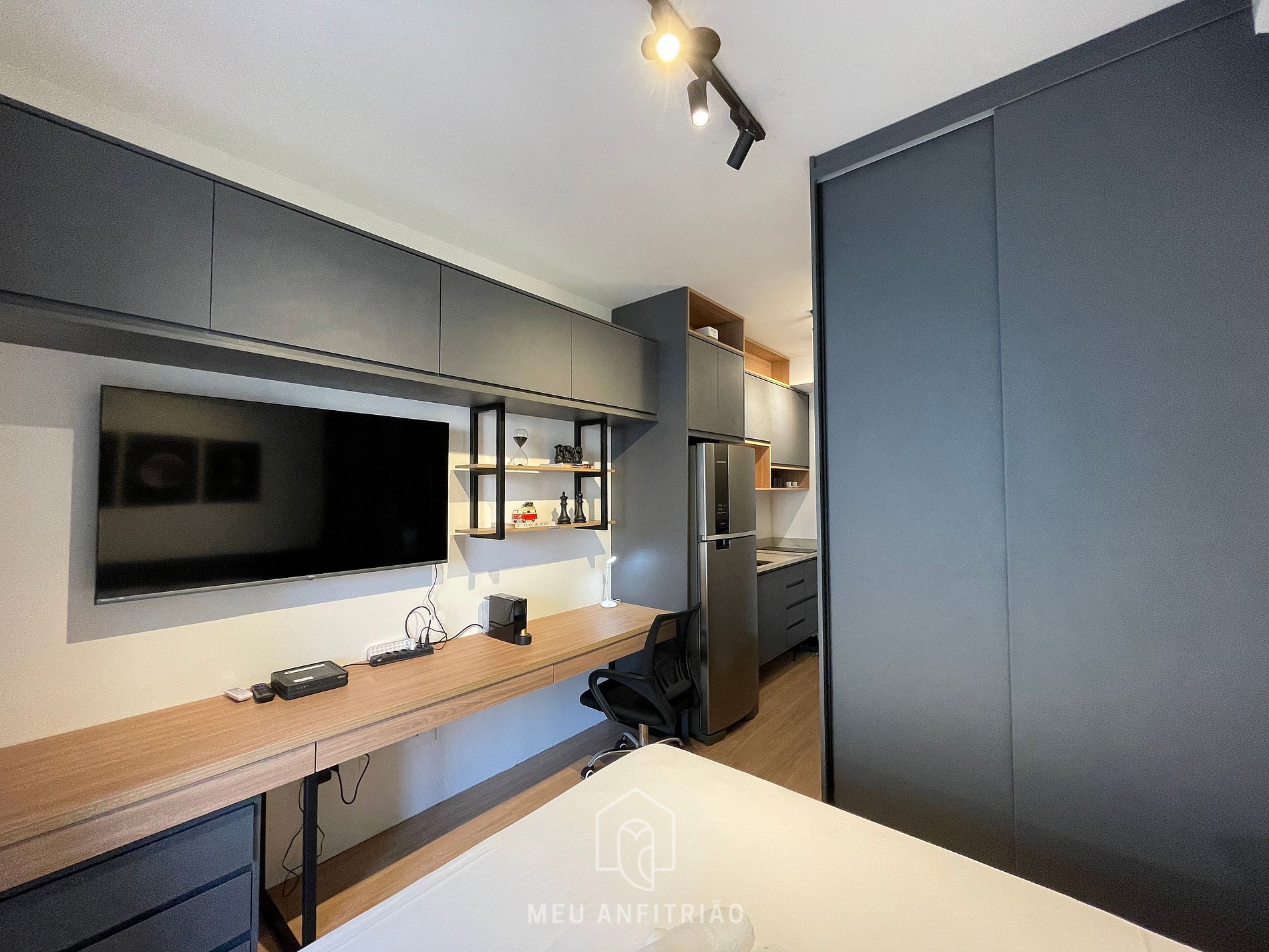 O studio dispõe de cozinha equipada com todos os utensílios necessários para uma estadia prática como: cooktop, micro-ondas, geladeira, liquidificador, sanduicheira, filtro d’água entre outros. Além disso, temos um banheiro, secador de cabelo, armário com cabides e mesa para home office.