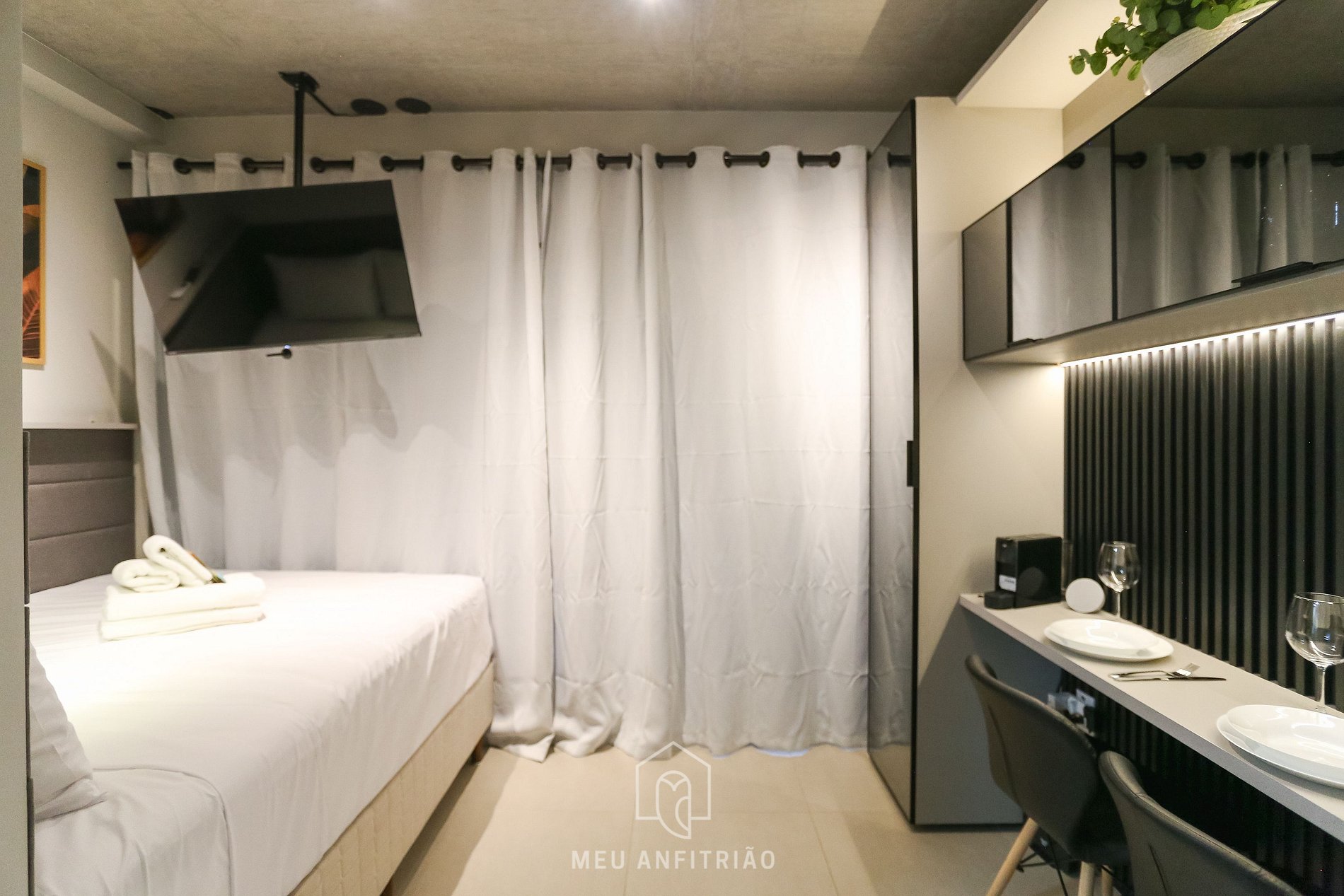 Entrando no espaço, o hóspede terá acesso à cozinha, que possui os utensílios necessários para o dia a dia, como fogão cooktop, geladeira, micro-ondas, filtro d’água, sanduicheira, mixer, liquidificador, cafeteira e chaleira elétricas, cafeteira Nespresso Essenza Mini entre outros.