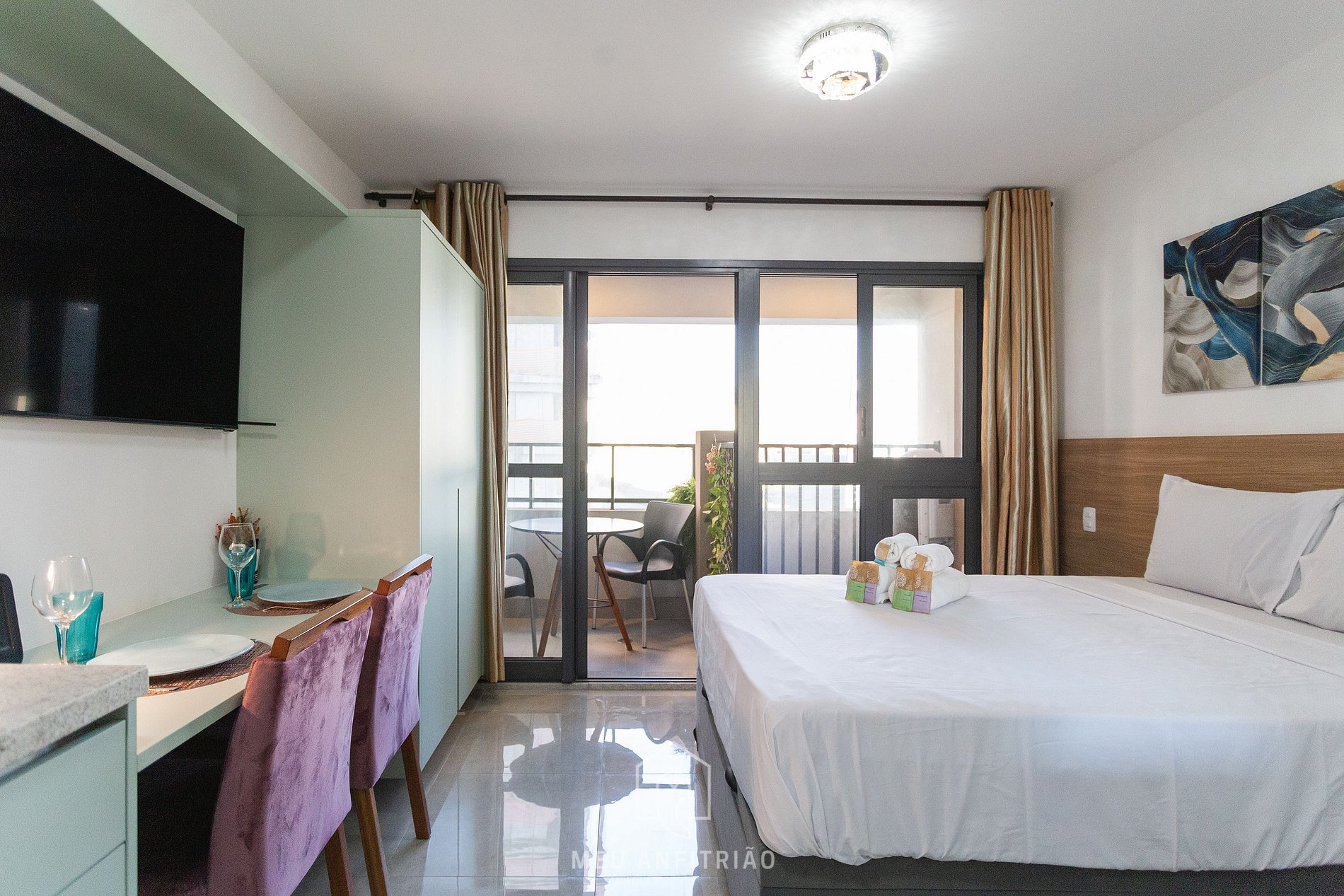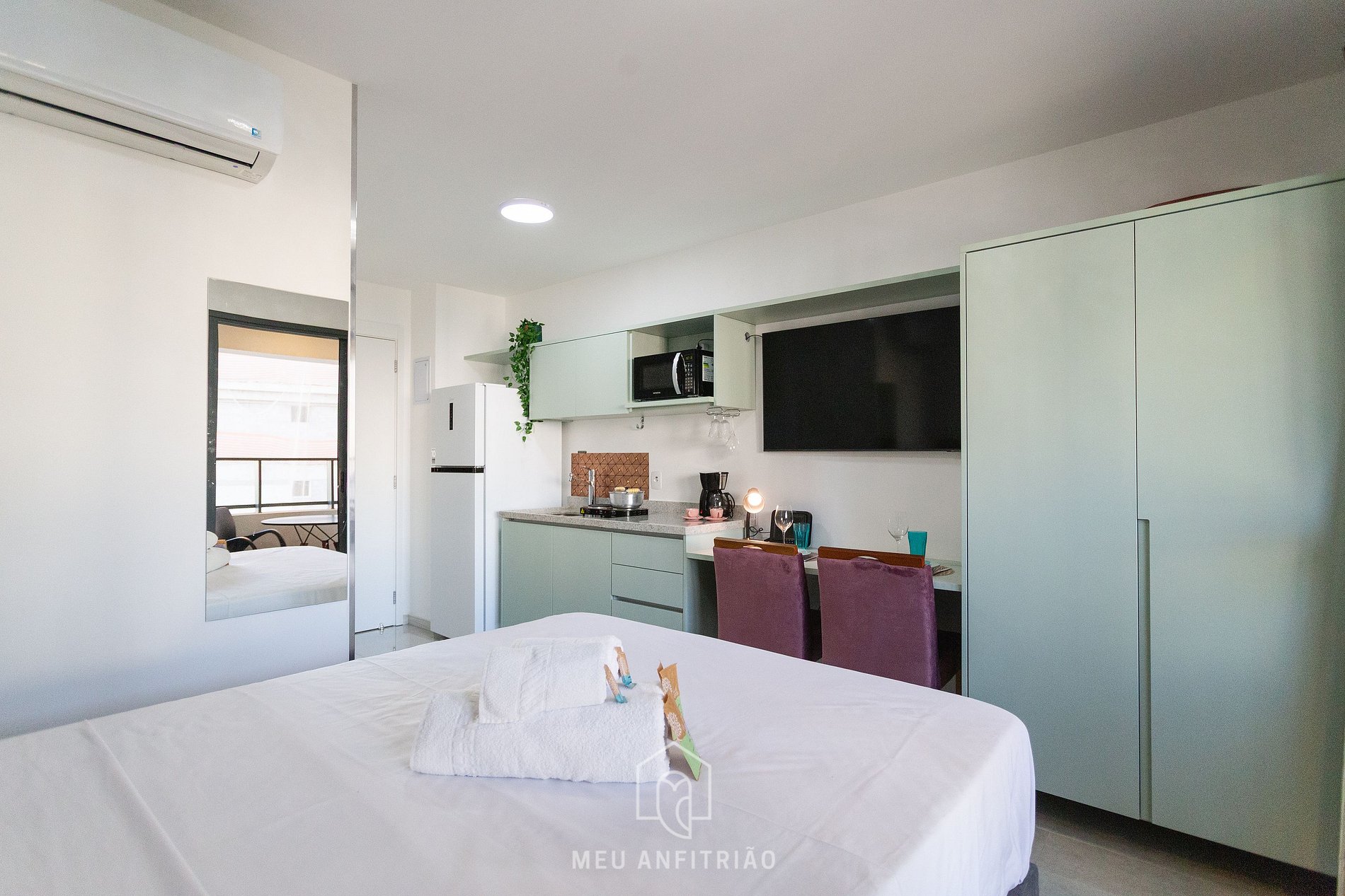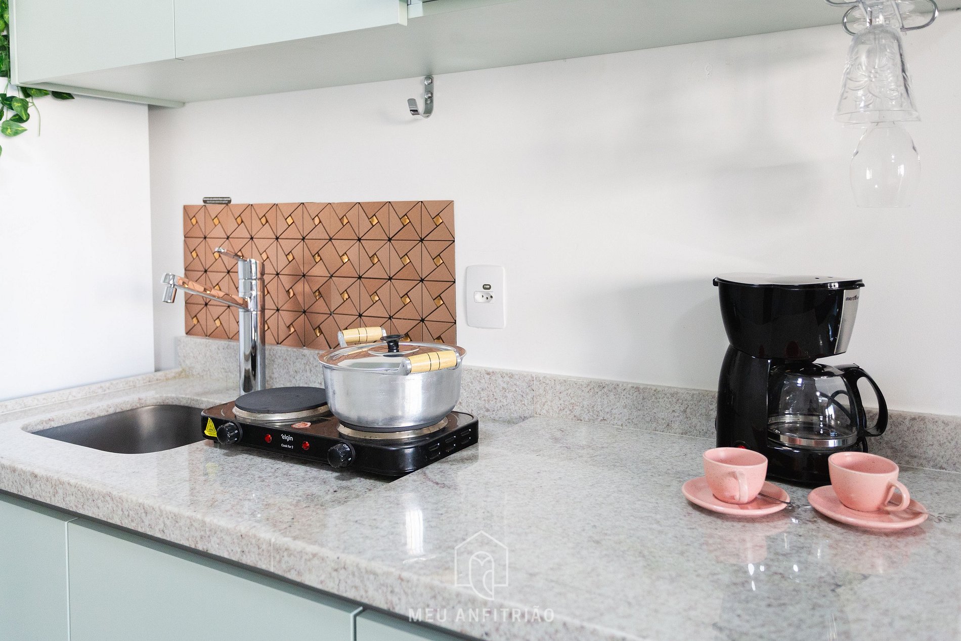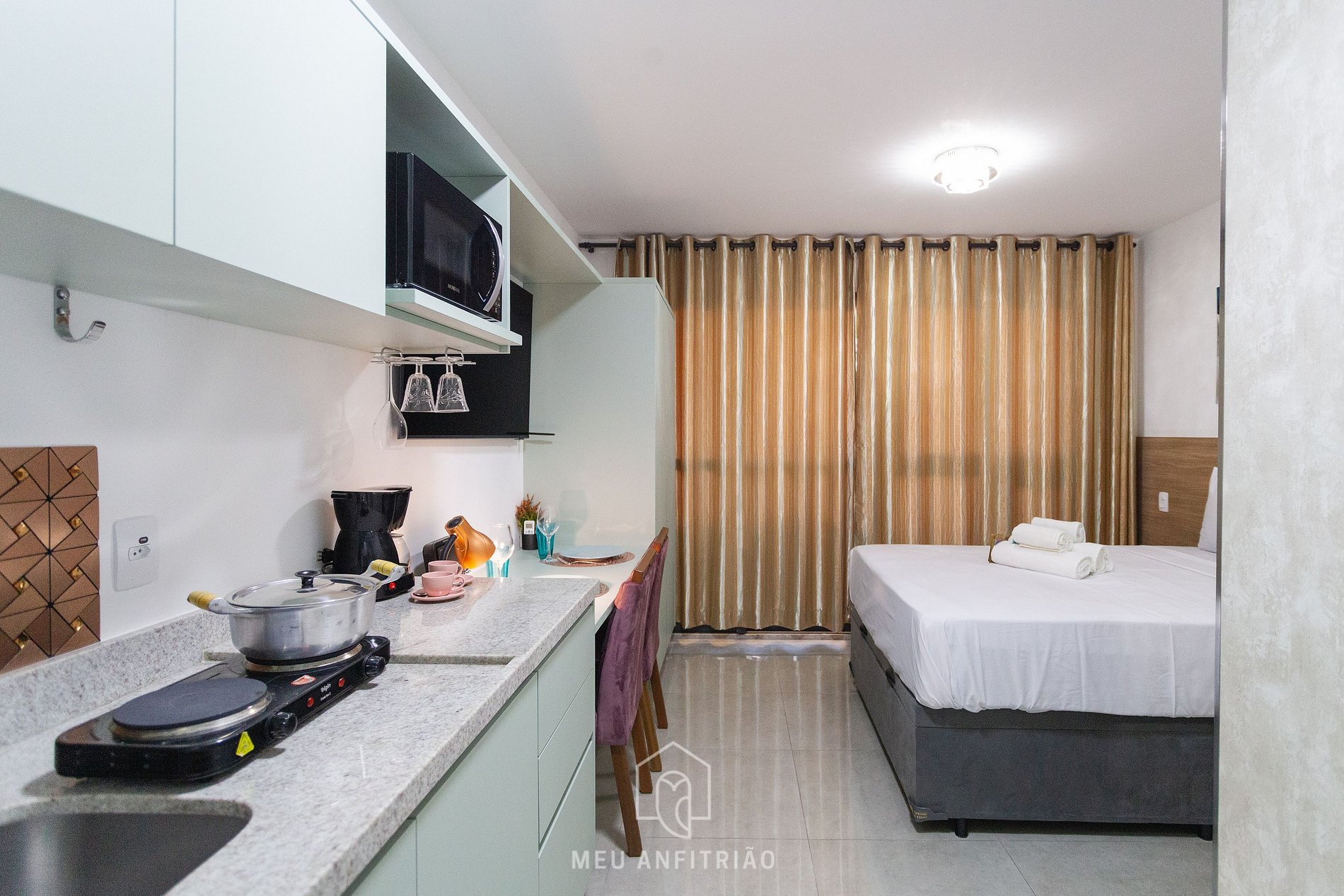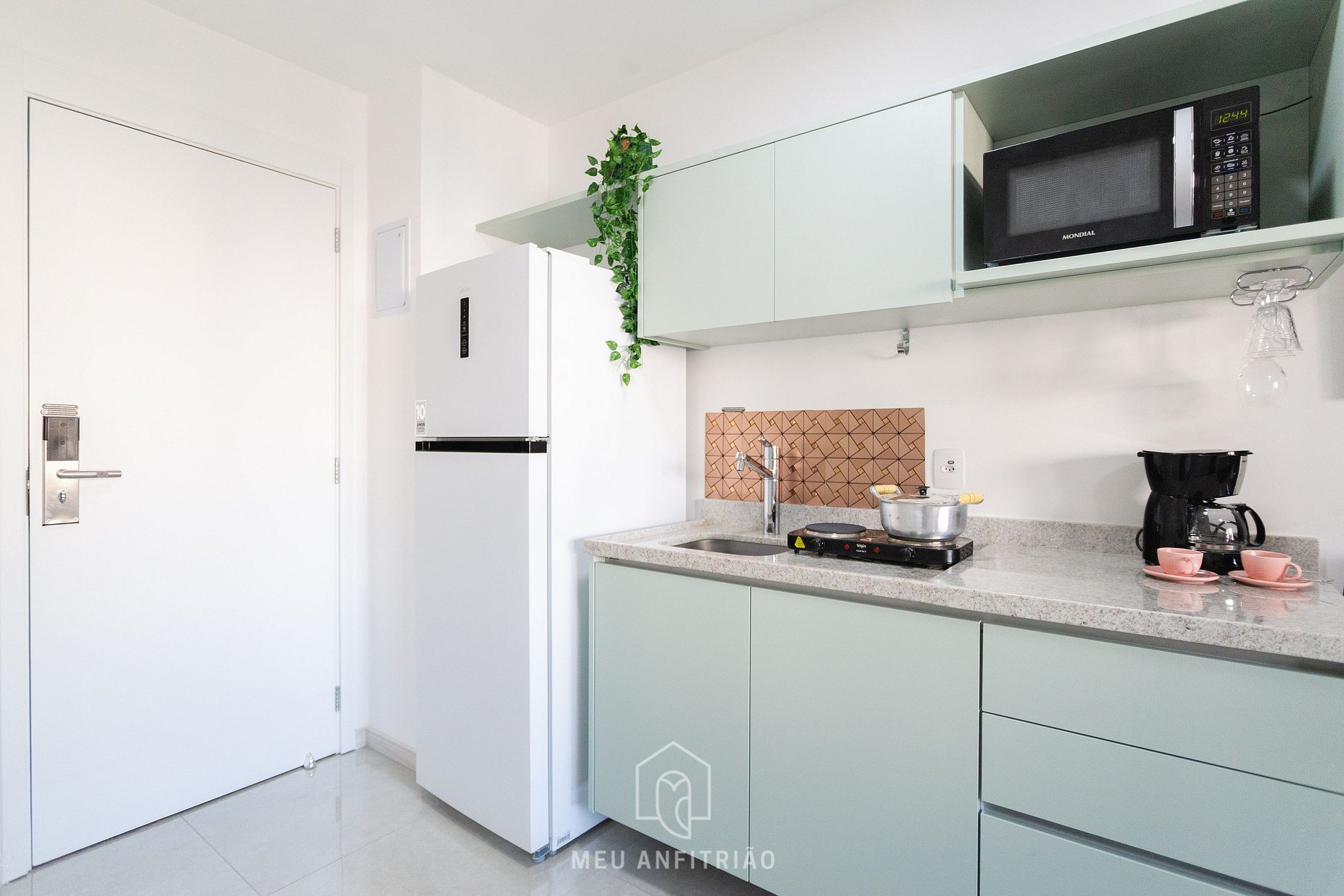 O hóspede estará na cozinha assim que entrar no studio, e ela conta com os itens ideais para uma estadia prática, como fogão cooktop, geladeira, micro-ondas, air fryer, liquidificador, sanduicheira, cafeteira e chaleira elétricas entre outros. A varanda dispõe de mesa com cadeiras e oferece uma vista para a cidade e porta de vidro com isolamento acústico e cortinas.
