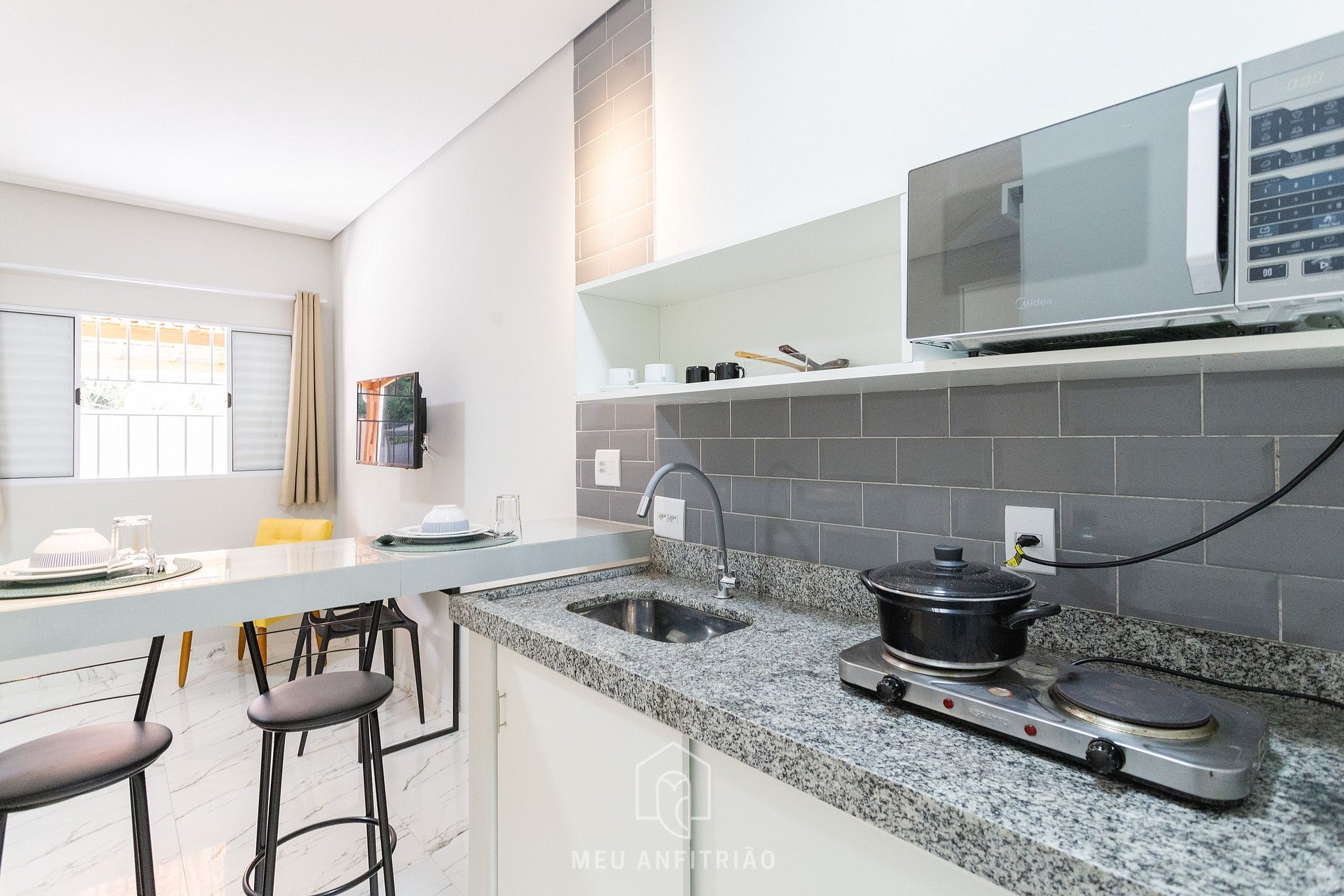 A cozinha do studio é completa com os utensílios necessários para a estadia, como fogão cooktop, geladeira, micro-ondas entre outros.
