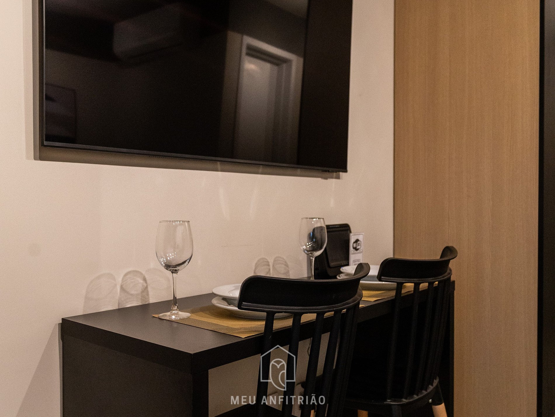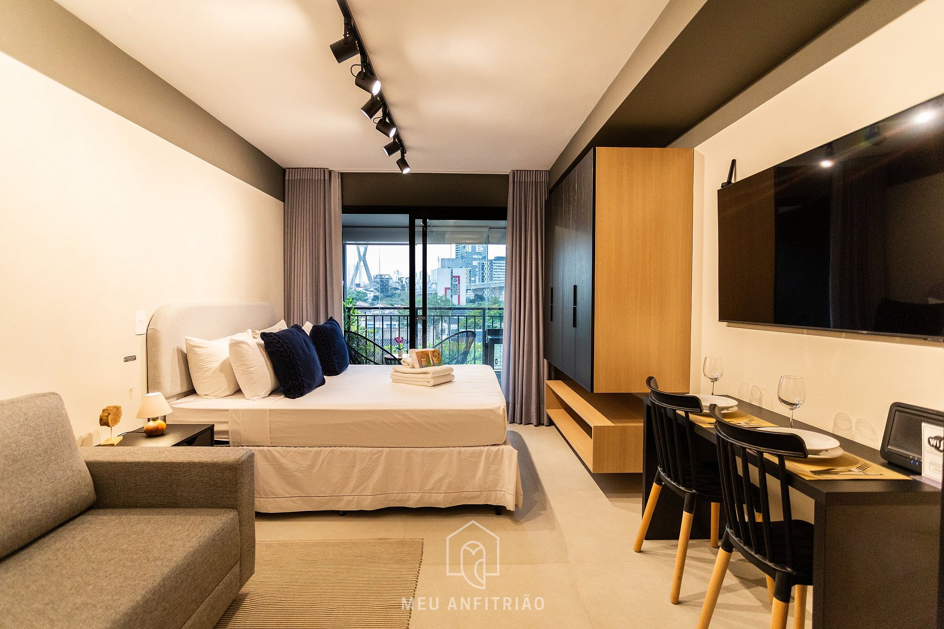 - Ambiente de quarto com cama queen, sofá, TV Smart Samsung, mesa com cadeiras para refeições ou home office, WI-FI de alta velocidade, ar-condicionado, steamer e guarda-roupas.