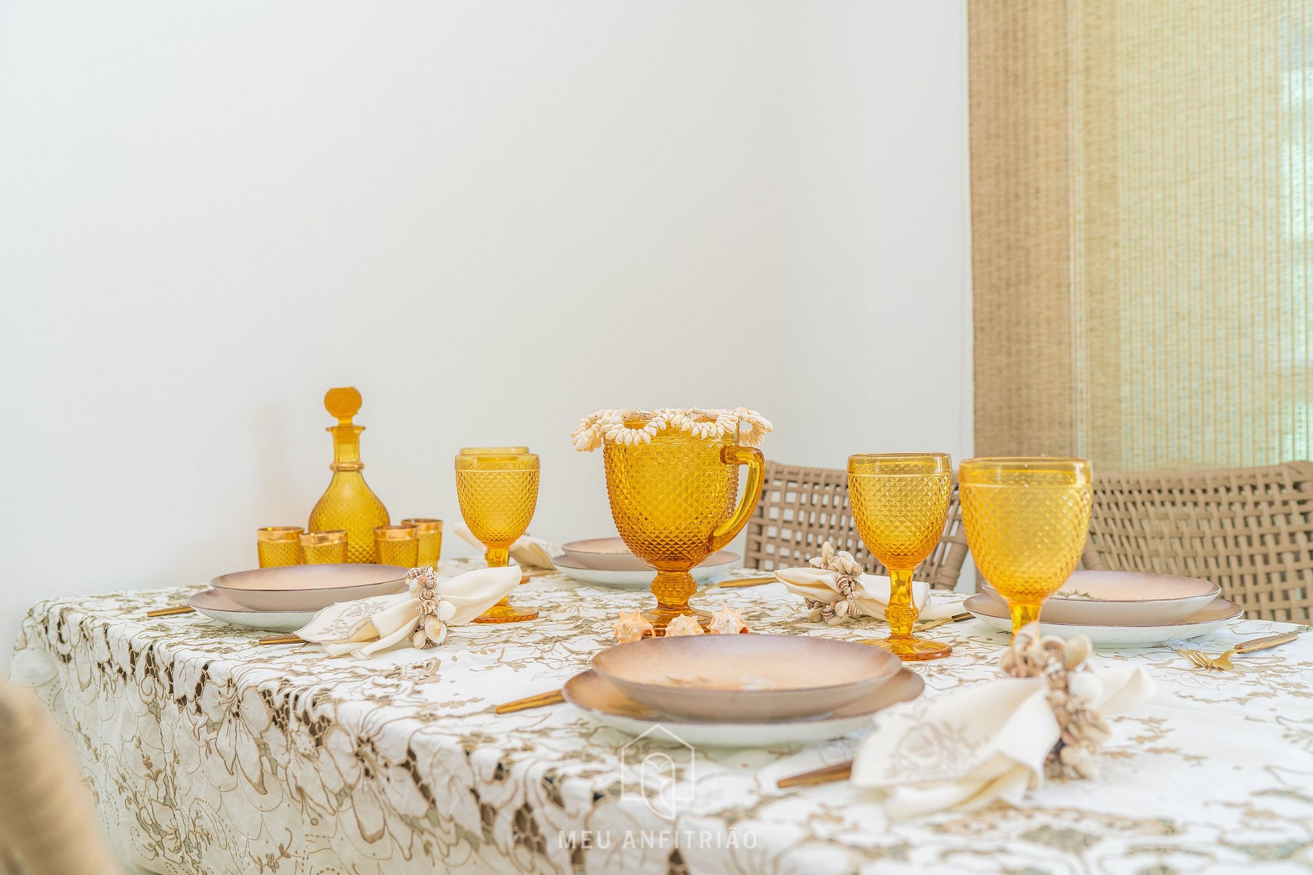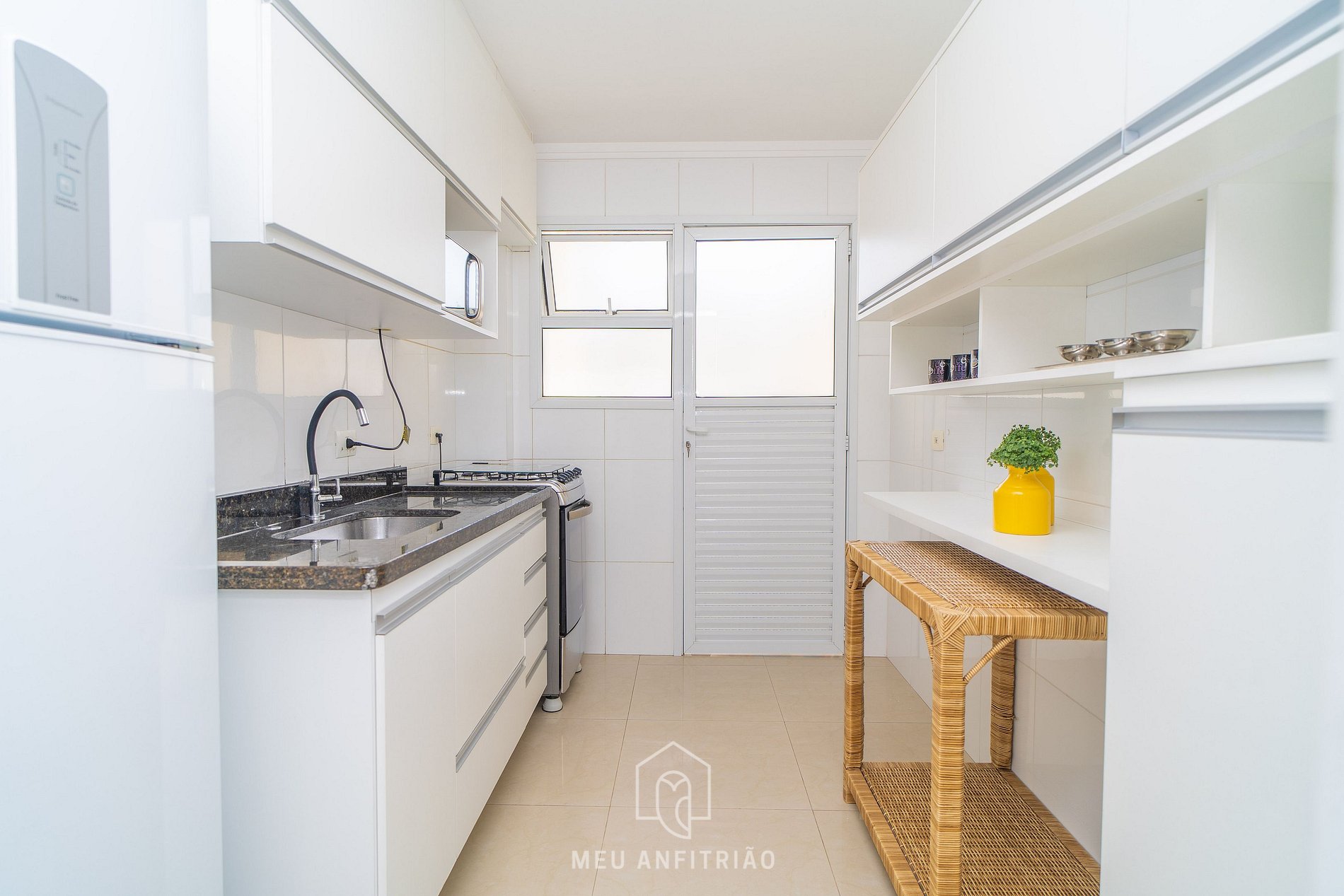 Ao entrar no apartamento, o hóspede terá acesso à sala de estar e jantar integradas, que possuem sofá, TV Smart e mesa com cadeiras para refeições. A cozinha dispõe dos utensílios necessários para uma estadia prática, como geladeira, fogão, forno, micro-ondas entre outros. Em seguida, temos a varanda, que possui uma churrasqueira, mais uma mesa com cadeiras para refeições e vista para a cidade.