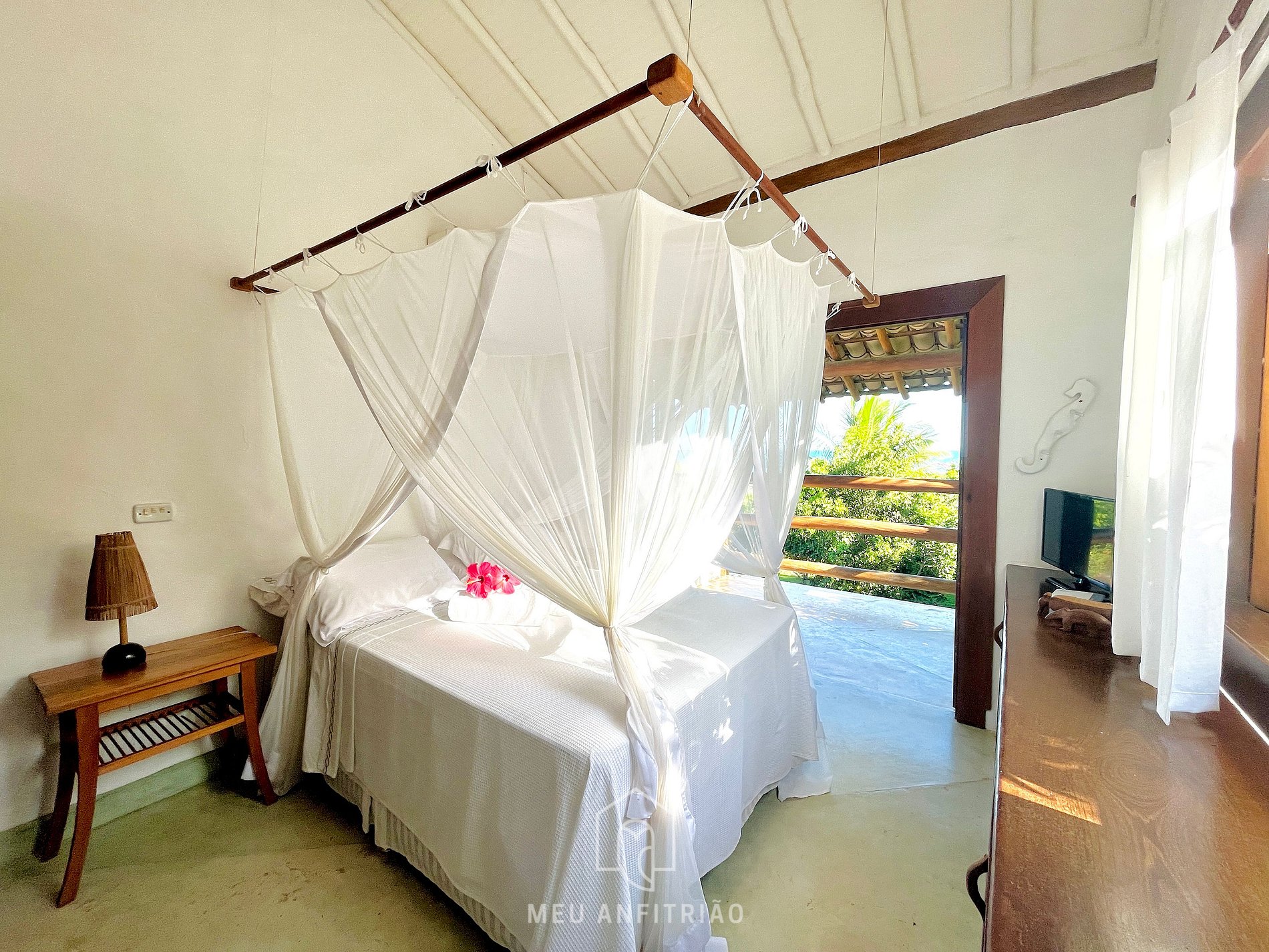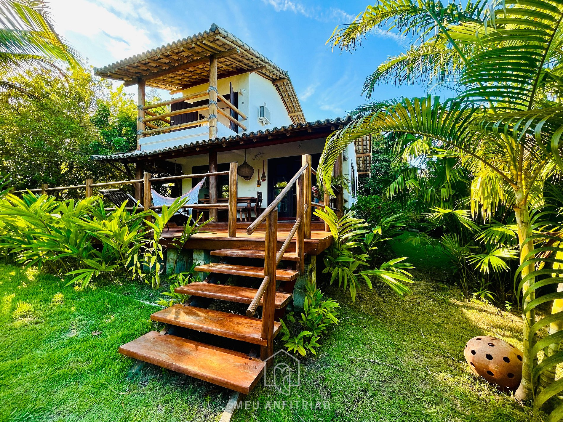 Seguindo em frente, no andar térreo, dispomos de uma suíte com cama de casal, varanda e vista para o jardim, além de outra suíte com cama de casal e vista para um pátio com ares de pracinha, sob uma bela mangueira. No andar superior, dispomos de uma suíte com cama de casal, varanda e vista para o mar.