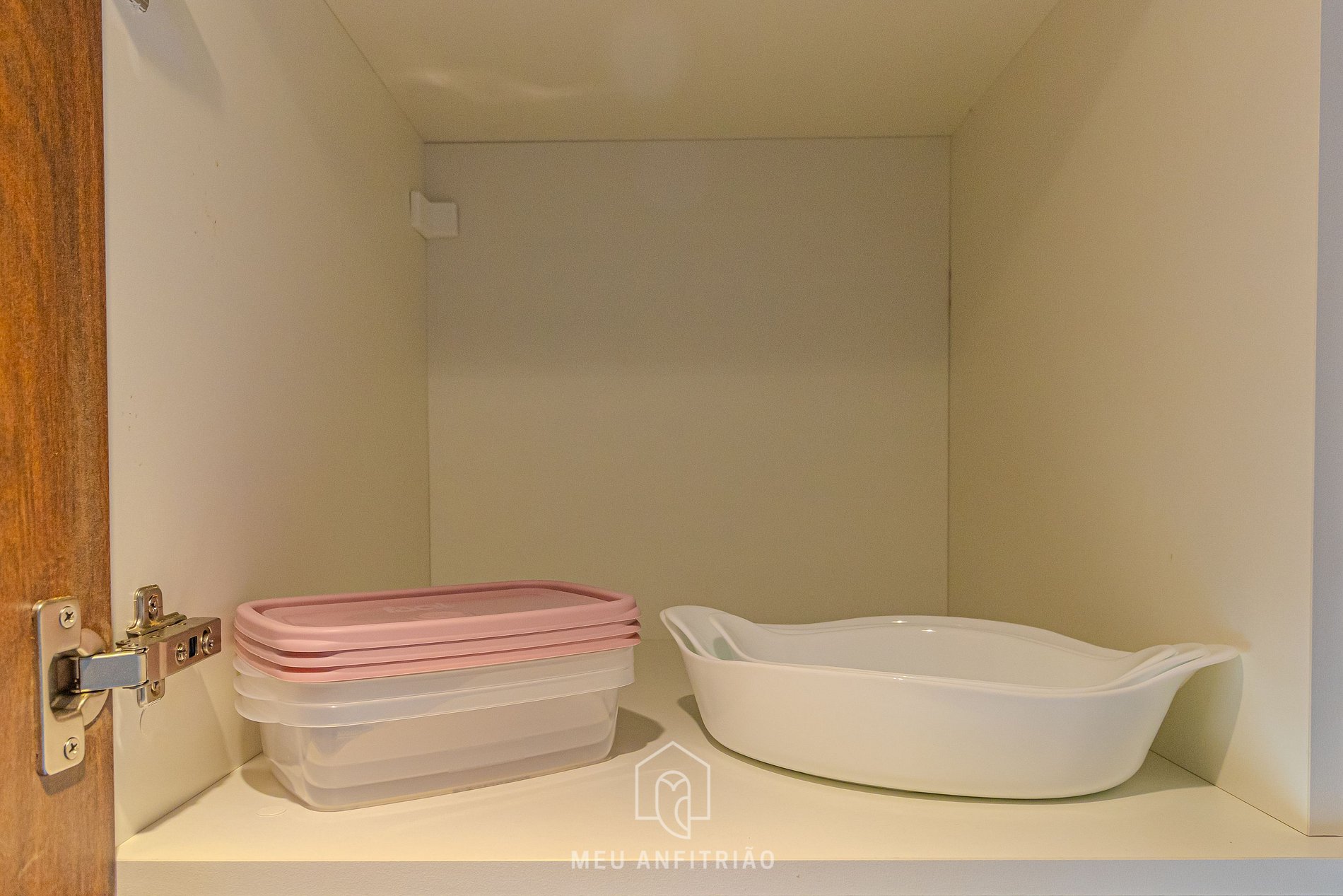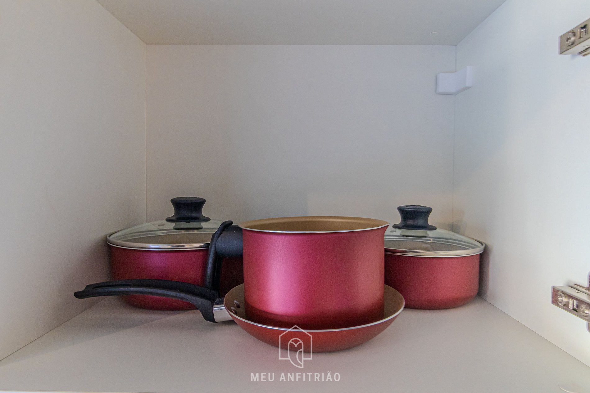 Entrando no studio, o hóspede terá acesso à cozinha, que oferece os itens ideais para uma estadia funcional, como geladeira, fogão cooktop, micro-ondas, chaleira, cafeteira elétrica, liquidificador, filtro d’água, sanduicheira entre outros.