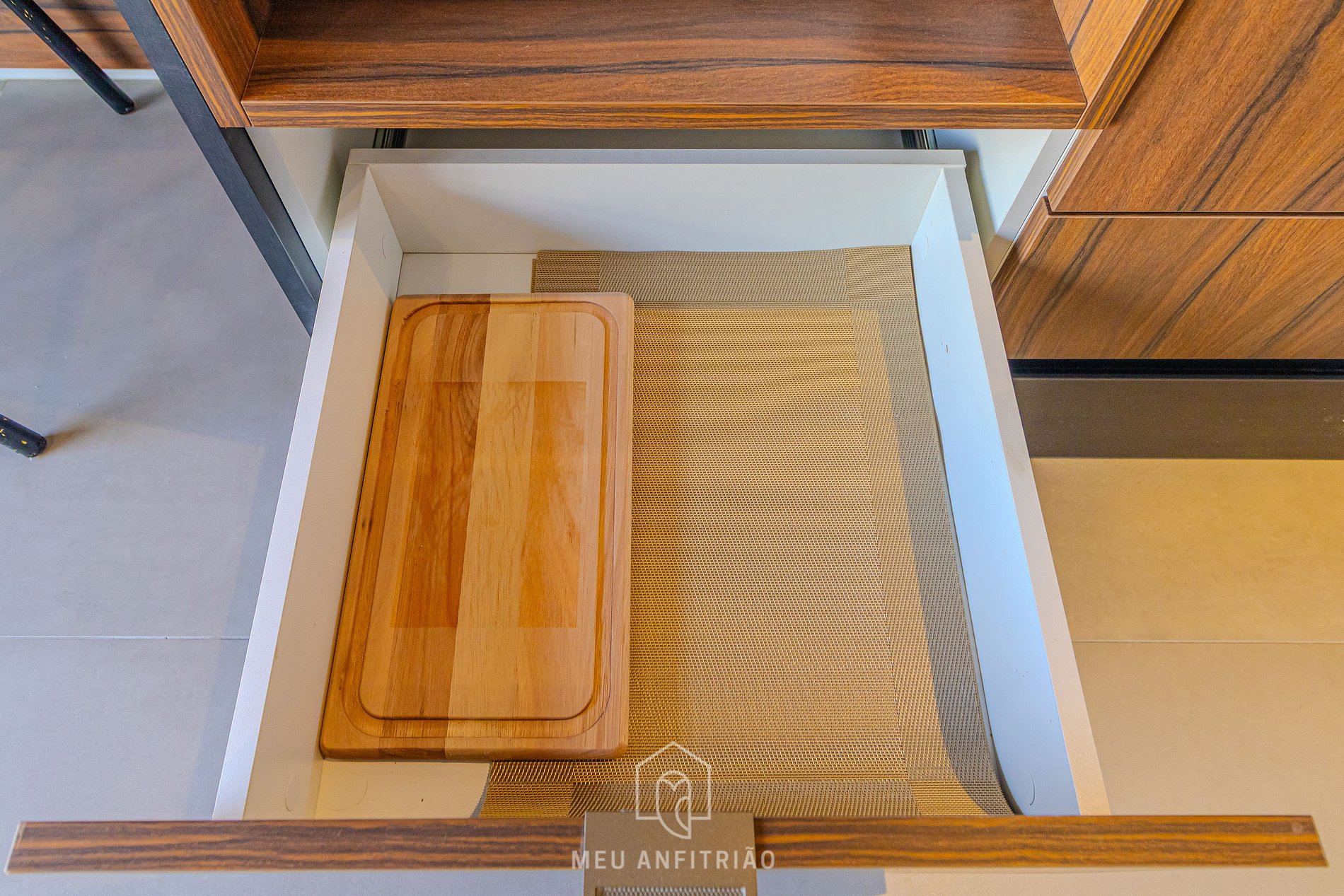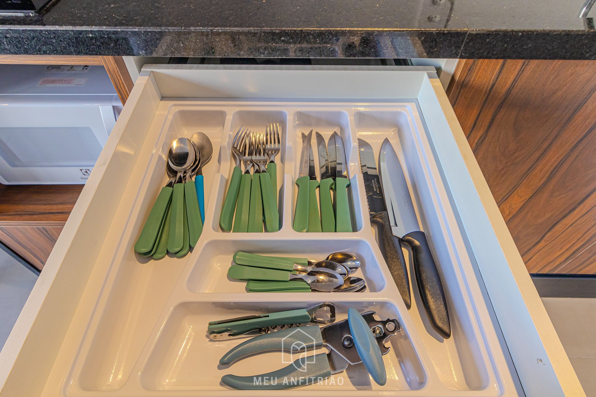 Entrando no studio, o hóspede terá acesso à cozinha, que oferece os itens ideais para uma estadia funcional, como geladeira, fogão cooktop, micro-ondas, chaleira, cafeteira elétrica, liquidificador, filtro d’água, sanduicheira entre outros.