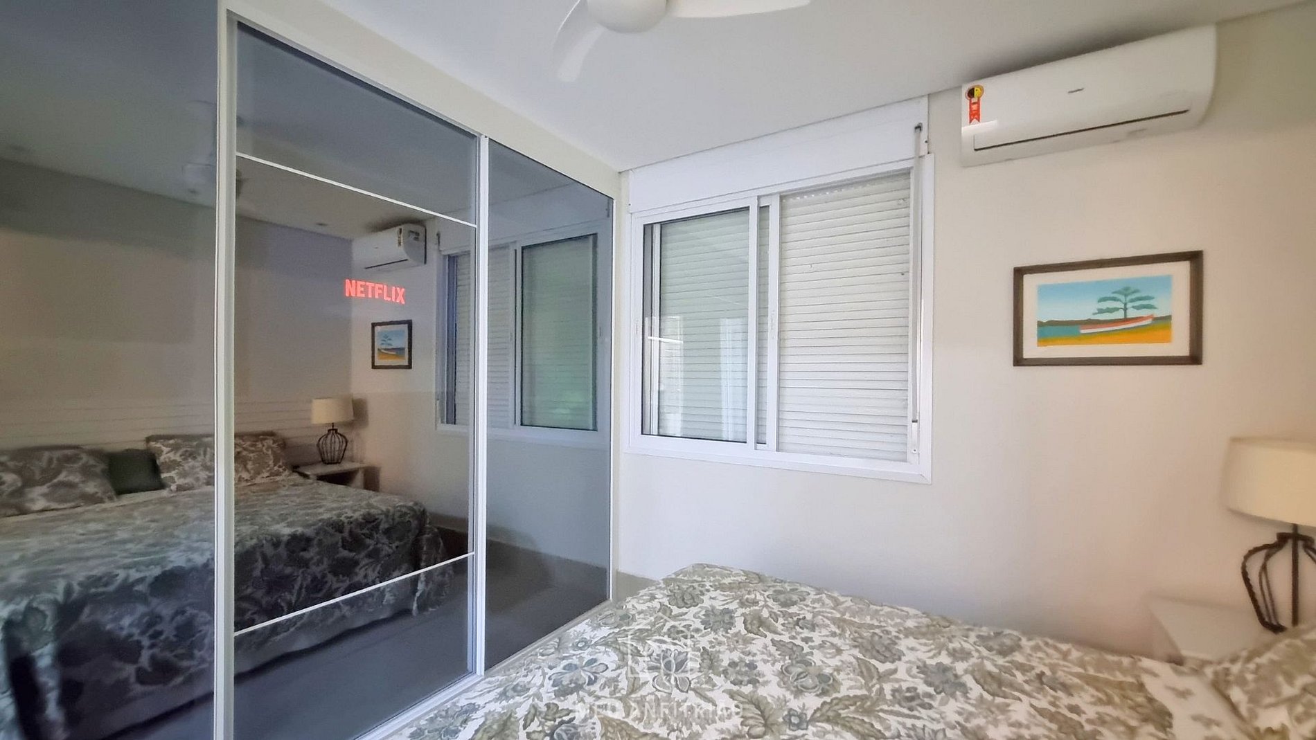 O apartamento também conta com uma ampla sala de estar com poltronas, sofá, TV Smart, ar-condicionado e ventiladores. O imóvel é arejado e contém uma varanda em toda extensão da sala com ampla vista para o mar. Nela, há uma mesa, poltrona e cervejeira para proveito do ambiente externo.