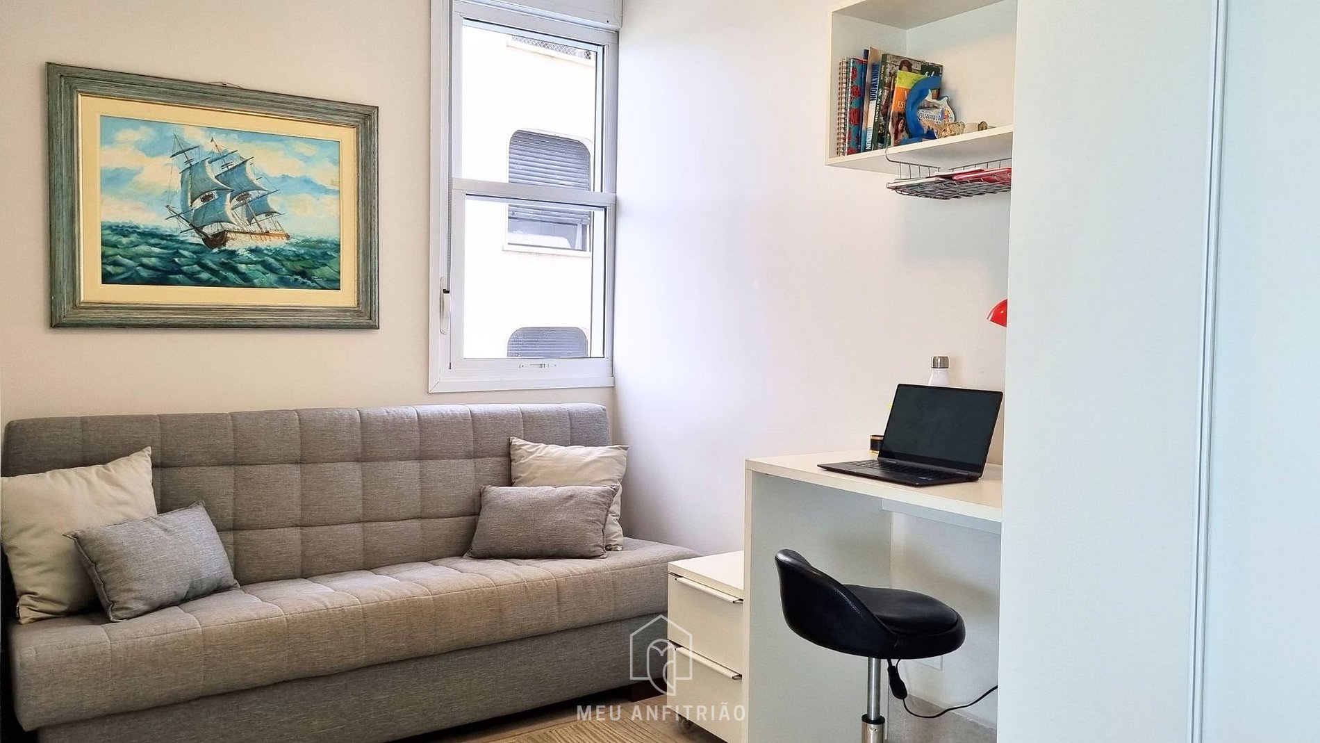 Nosso apartamento acomoda até 6 pessoas em 3 quartos, sendo uma suíte com cama queen e ar-condicionado, um quarto com duas camas de solteiro e um quarto reversível com sofá-cama de casal.