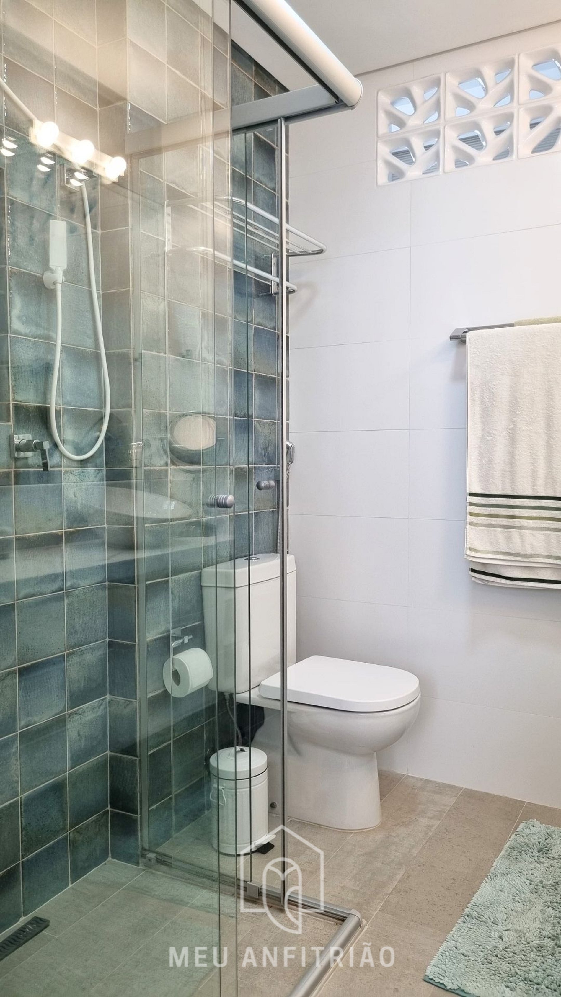 Ao entrar no apartamento, temos acesso à sala de jantar com mesa e bancada para refeições, além de uma cozinha completa equipada com utensílios necessários para a estadia como fogão, geladeira, microondas, forno, filtro d’água, sanduicheira, panelas, panela de pressão, entre outros.