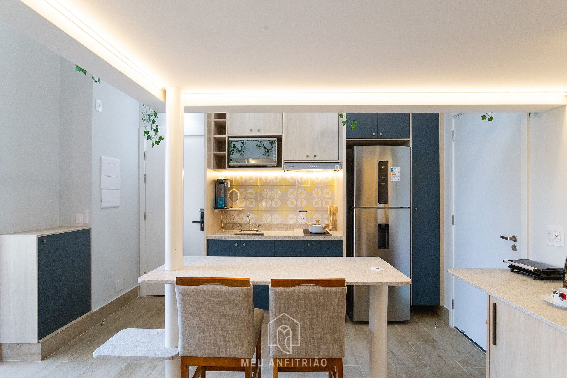 Ao entrar, o hóspede estará na cozinha, que oferece os utensílios ideais para uma estadia prática, como geladeira, fogão cooktop, micro-ondas, forno elétrico, filtro d’água, coifa, sanduicheira, chaleira elétrica, cafeteira Nespresso Essenza entre outros, além de uma mesa com cadeiras para refeições e uma mesa com cadeira para home office com TV Smart Samsung.