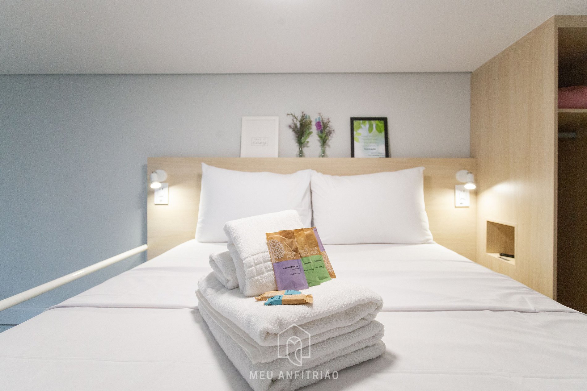 Nosso studio oferece um espaço amplo de 31m² e conta com um alto pé-direito, acomodando até 2 pessoas em uma cama de casal no mezanino. O condomínio possui área de lazer completa e portaria presencial 24h.