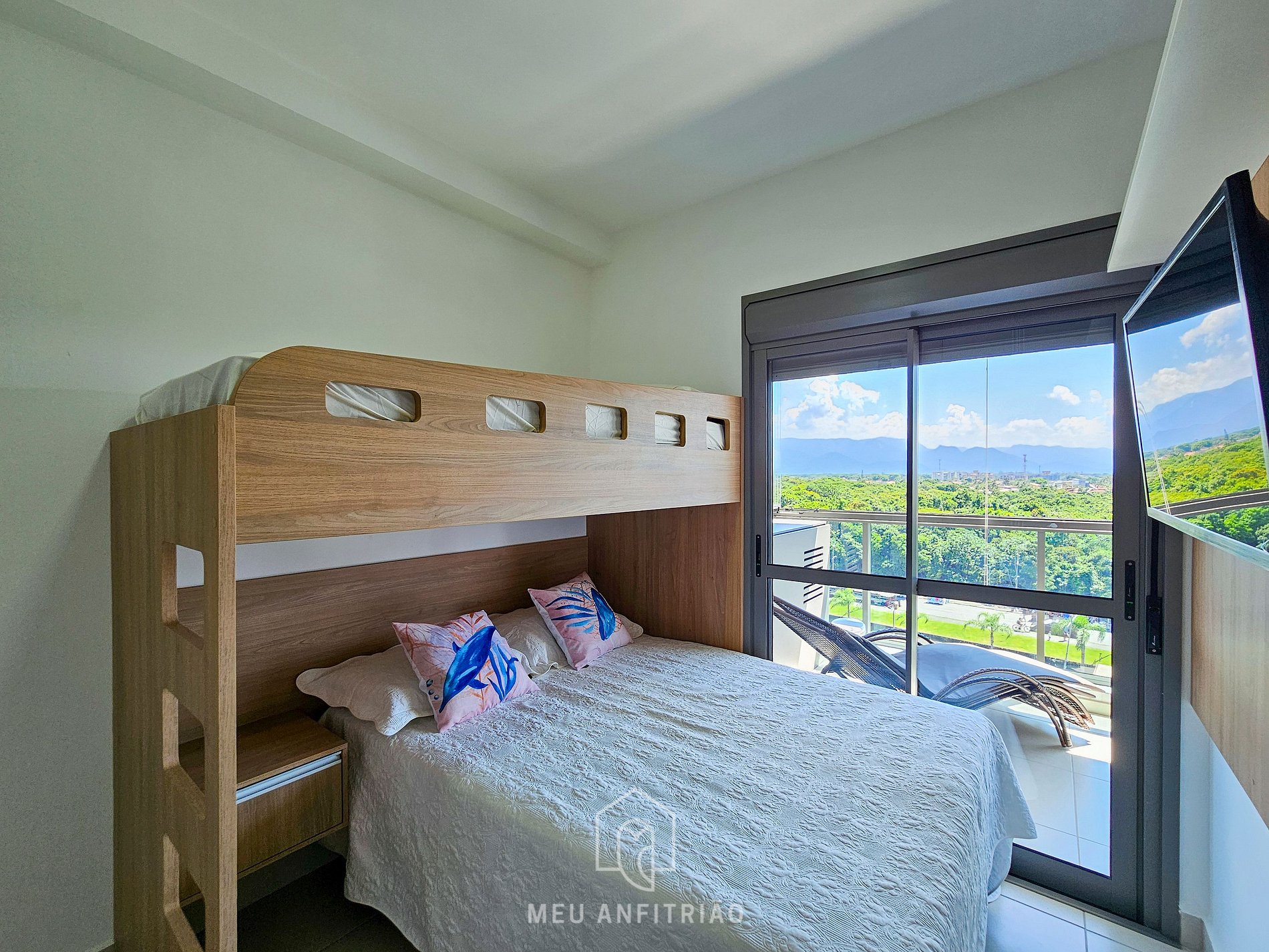 Nosso apartamento acomoda até 5 pessoas em uma cama queen, uma cama de casal e uma cama de solteiro em beliche.