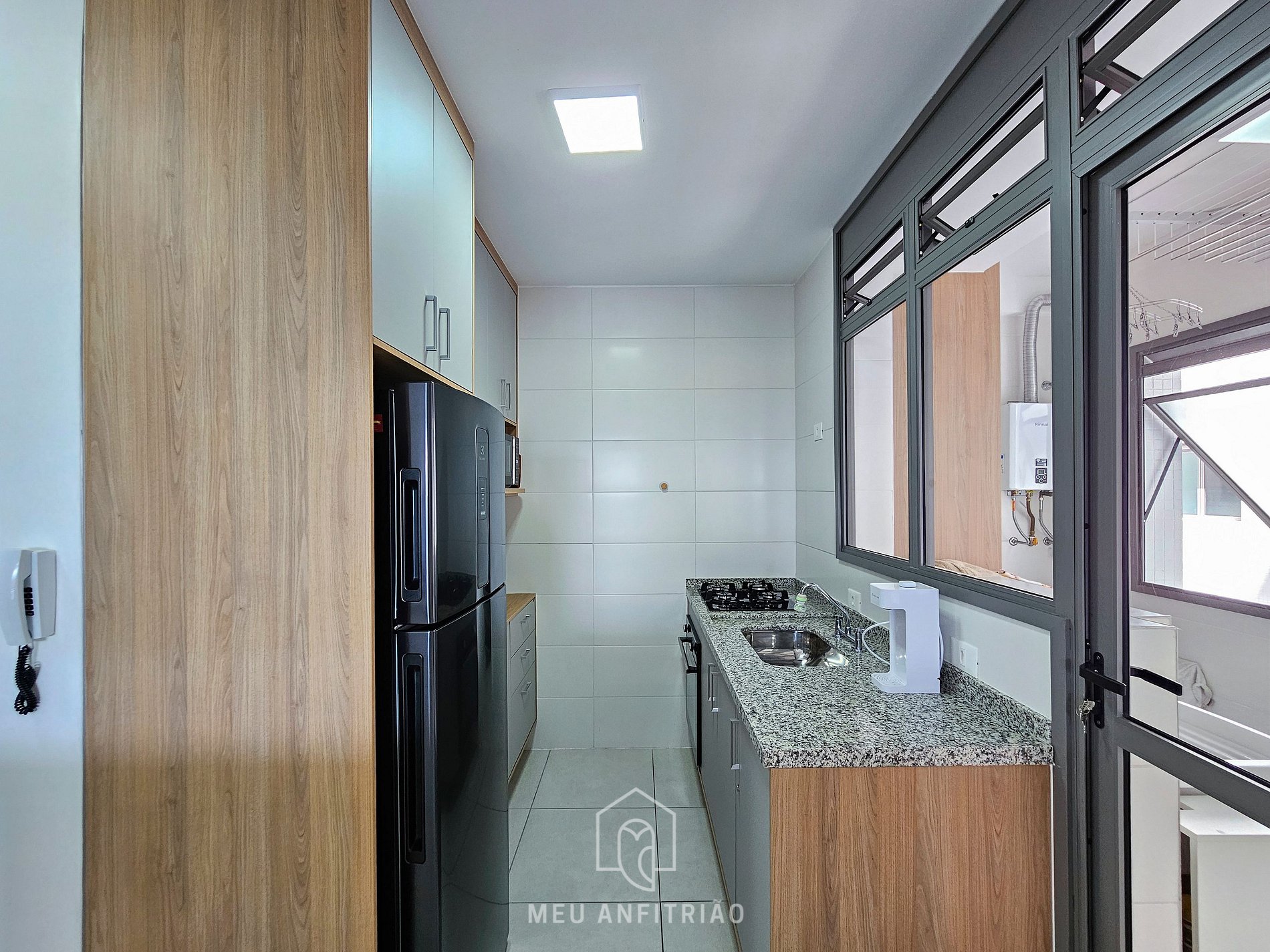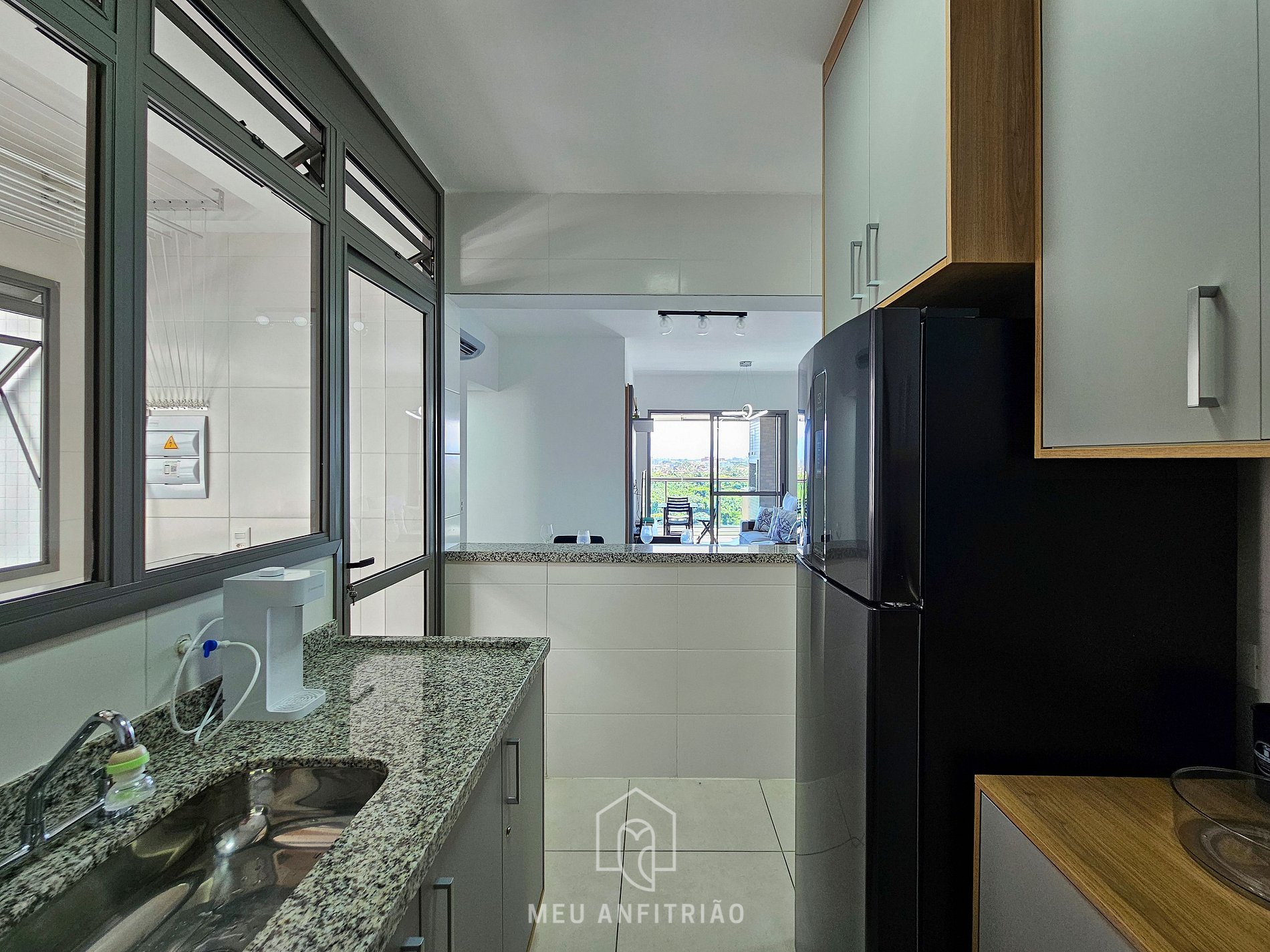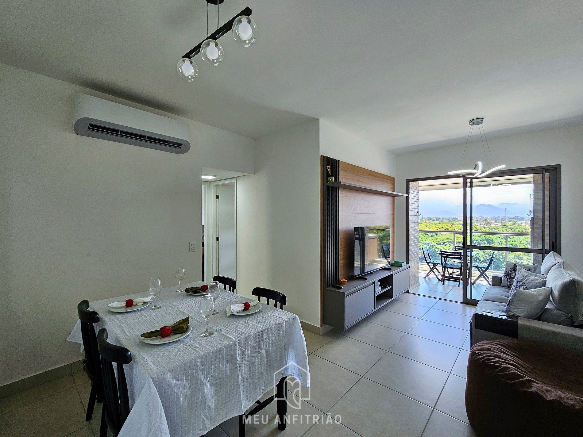 Ao entrar no apartamento, o hóspede terá acesso à cozinha, que conta com os utensílios ideais para uma estadia prática, como fogão cooktop, forno, geladeira, micro-ondas, filtro d’água, air fryer, sanduicheira, liquidificador, chaleira elétrica entre outros. Ao lado, temos as salas de jantar e estar, que contam com mesa com cadeiras para refeições e sofá. A varanda gourmet conecta a sala à um dos quartos e conta com mesas, cadeiras, espreguiçadeira e churrasqueira.