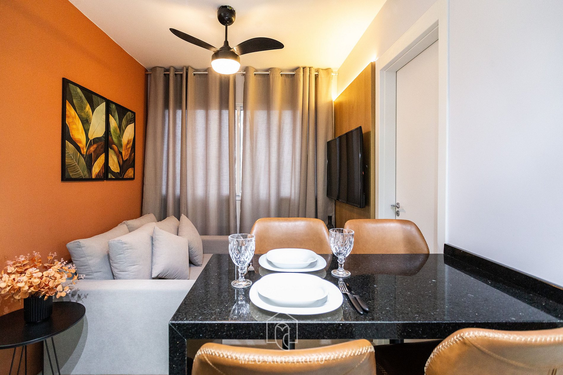 Ao lado, a sala de estar conta com sofá, TV Smart LG e ar-condicionado portátil. O primeiro quarto dispõe de uma cama de casal, guarda-roupas e outra TV Smart LG. O segundo quarto possui uma cama de solteiro, espaço para home office com cadeira e guarda-roupas. Todos os ambientes contam com ventilador de teto.