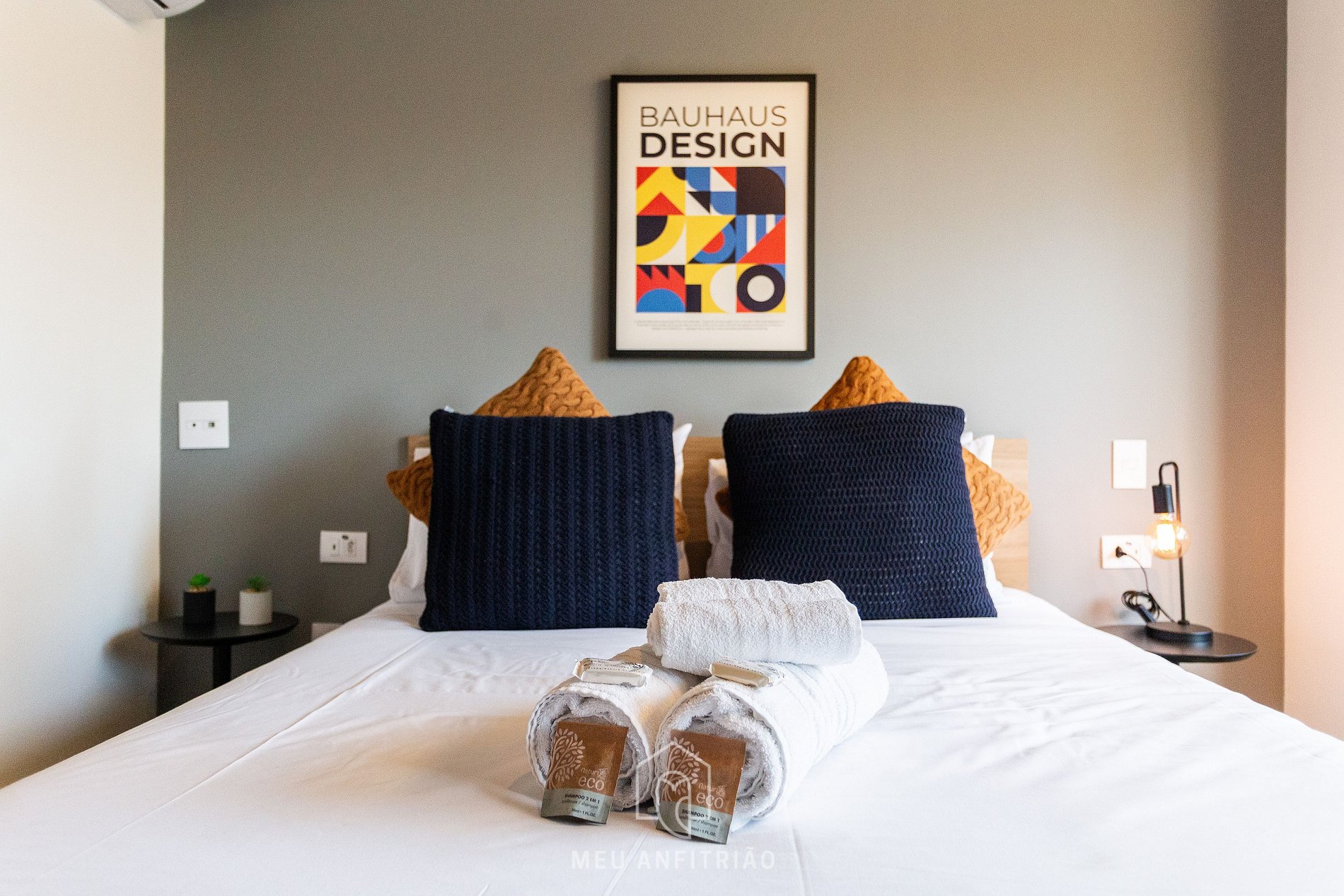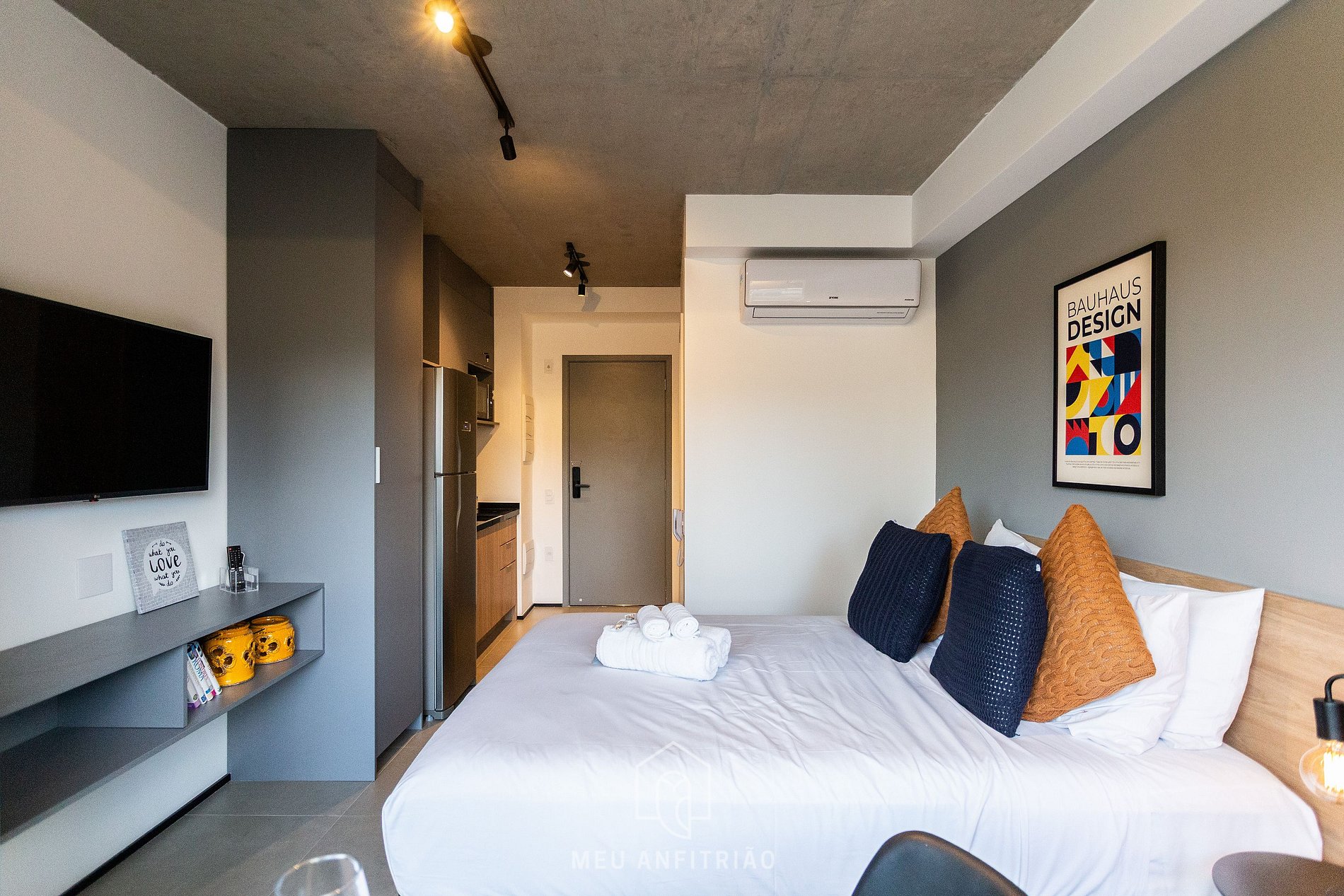 Nosso studio de 23m² acomoda 2 pessoas em uma cama de casal. O condomínio tem portaria presencial 24h e área de lazer.