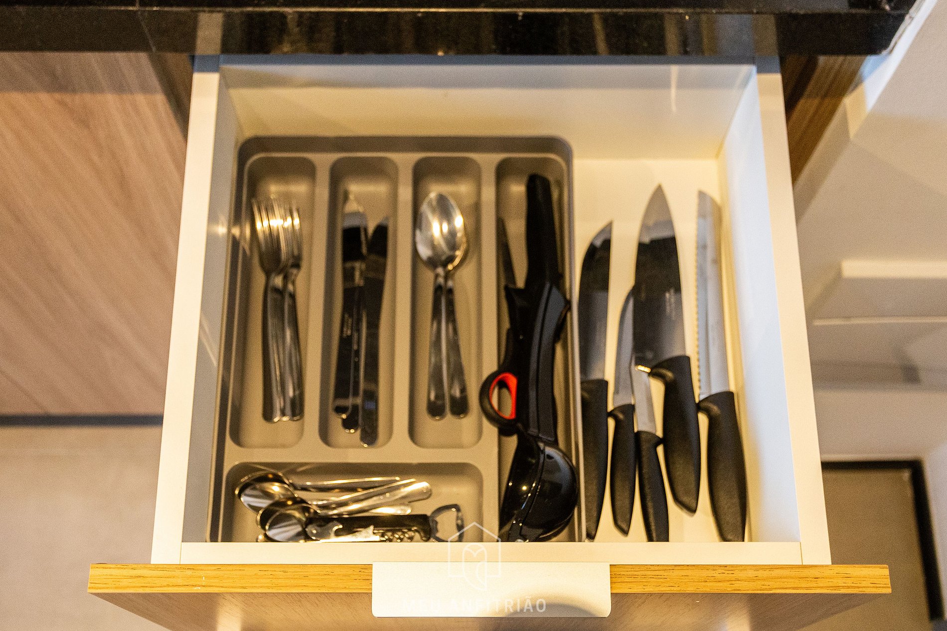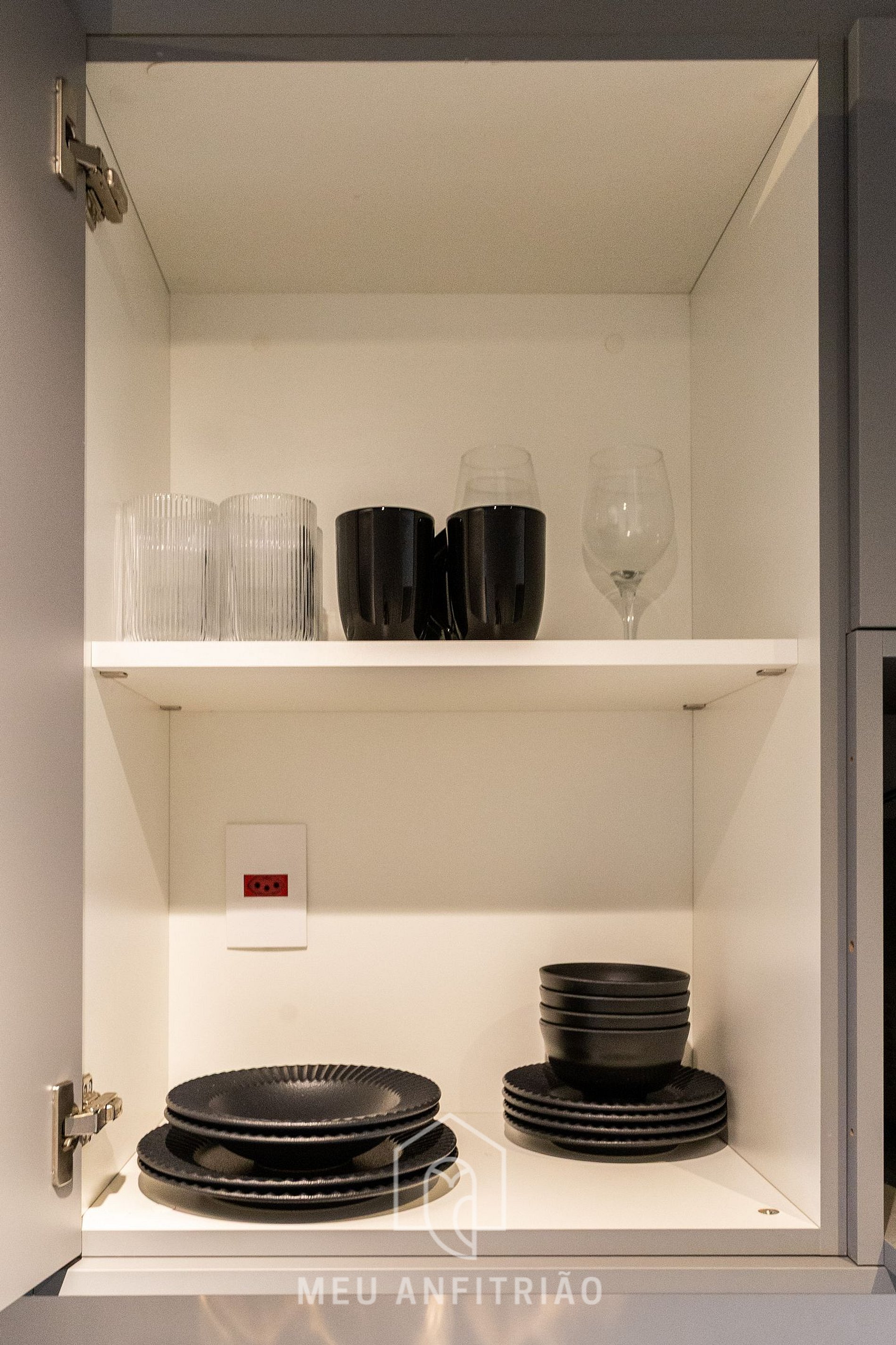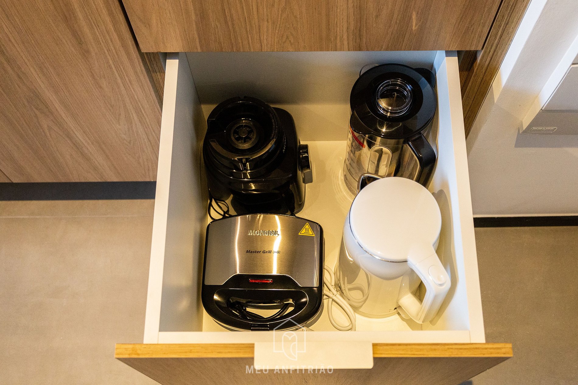 Entrando no studio, o hóspede estará diretamente na cozinha, que oferece os utensílios ideais para uma hospedagem funcional, como fogão cooktop, geladeira, micro-ondas, sanduicheira, liquidificador, cafeteira e chaleira elétricas, entre outros.