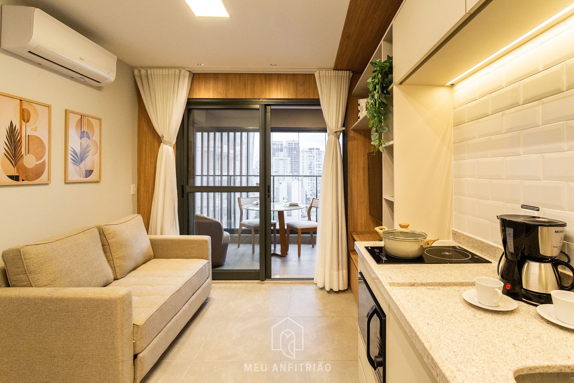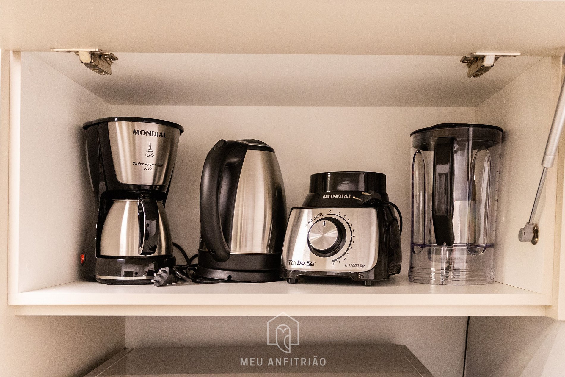 - Cozinha equipada com os principais utensílios para uma estadia prática, como fogão cooktop, geladeira, micro-ondas com função de forno, liquidificador, cafeteira e chaleira elétricas entre outros, além de um lavabo logo ao lado.