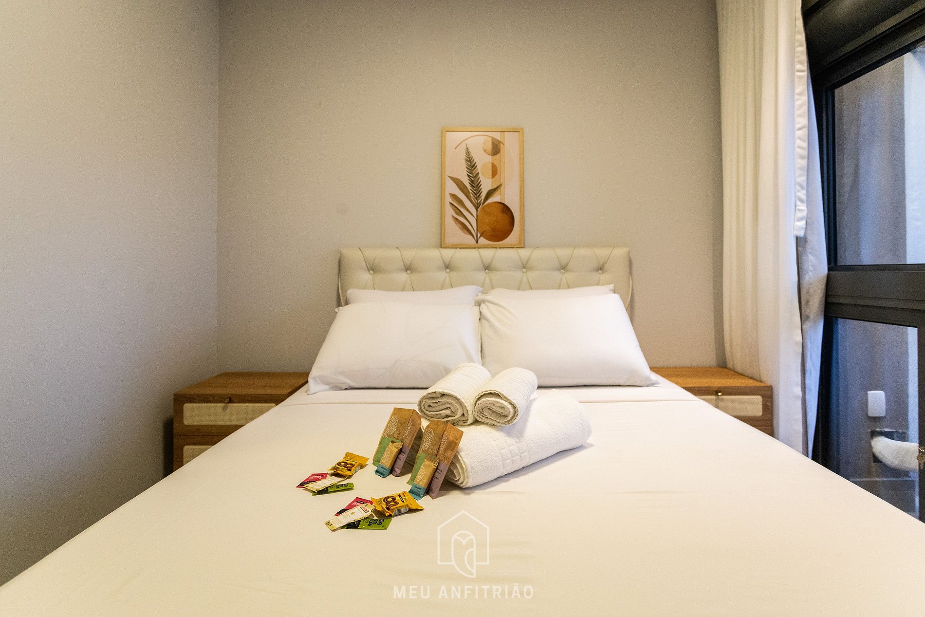 - Quarto com cama de casal, guarda-roupas, TV Smart Philco, steamer, ar-condicionado quente e frio e cortinas blackout.