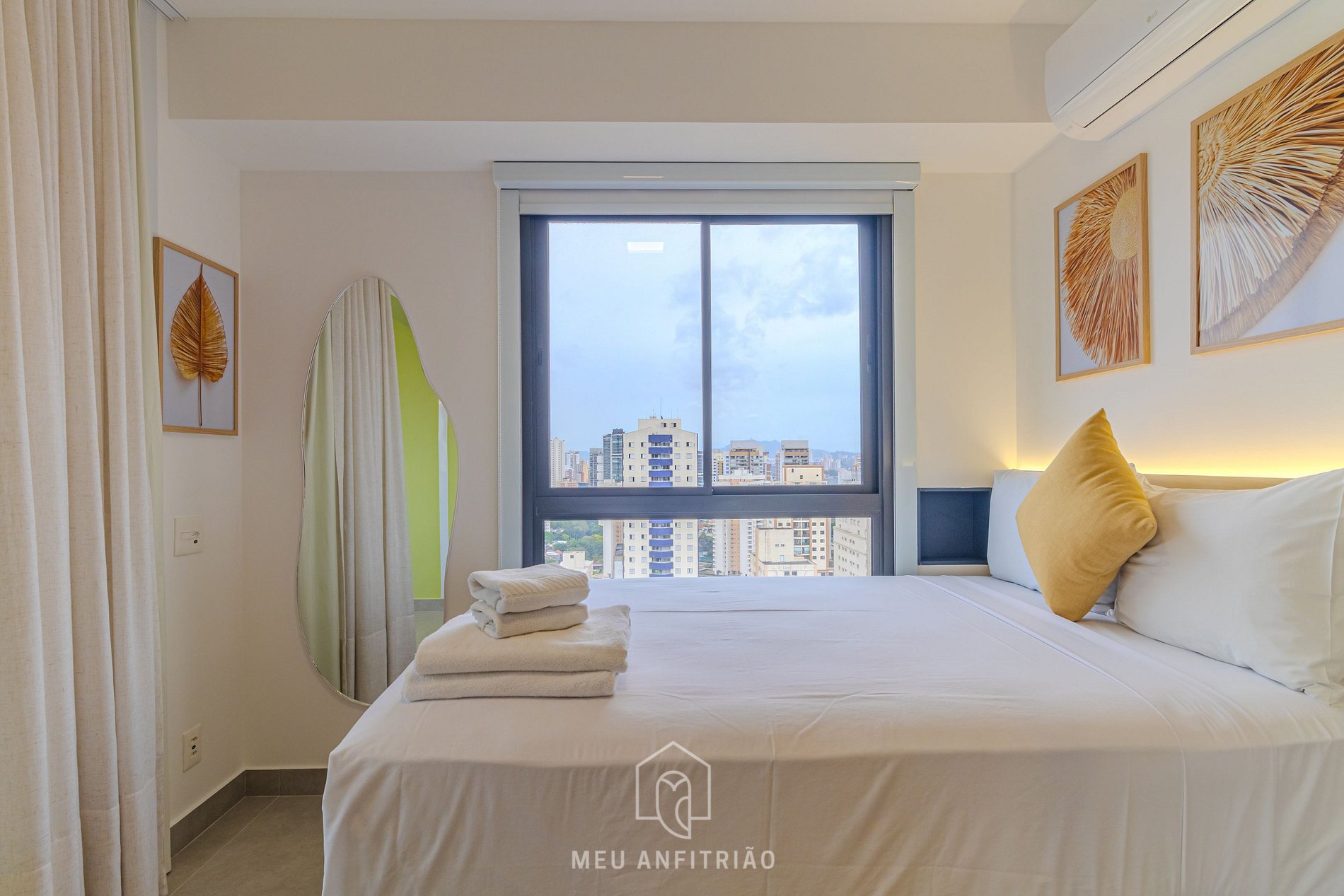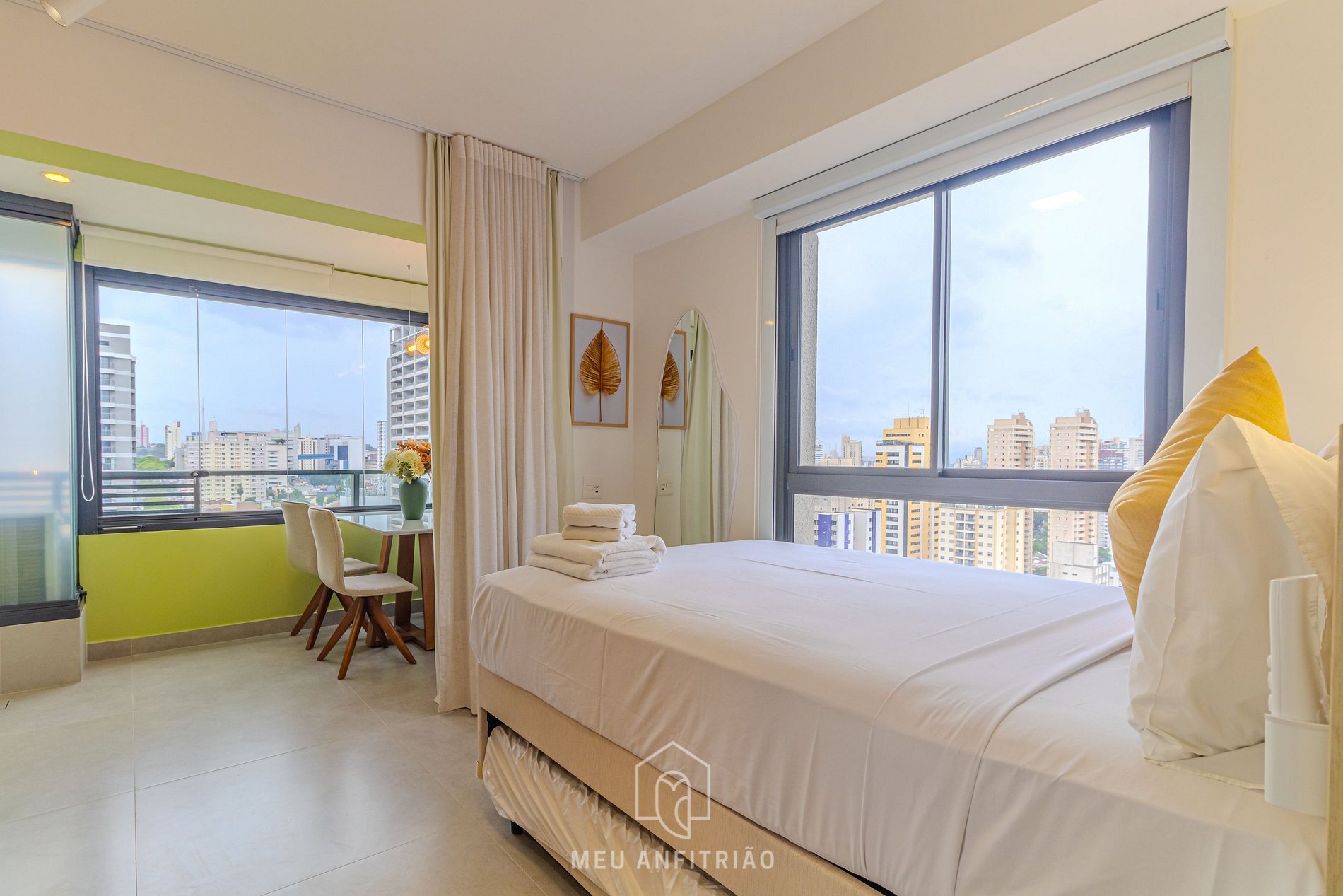 - O studio conta com Smart TV, ar-condicionado quente e frio, cortinas e persianas blackout, cama de casal com 1 bicama de solteiro, armário e vaporizador.