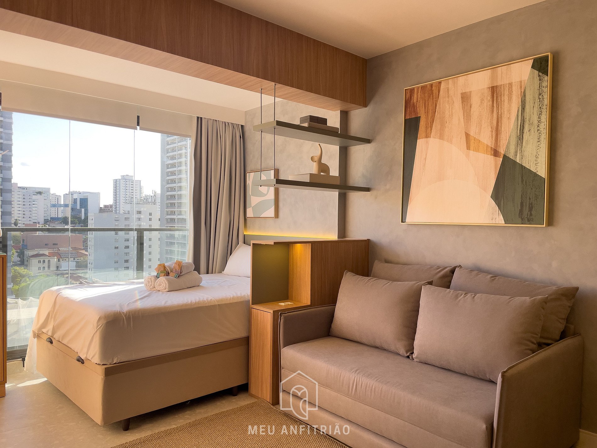 - O studio oferece sofá-cama para 2 pessoas, ar-condicionado quente e frio, Smart TV Samsung, armário, steamer, e na área da varanda integrada temos persianas, cama de casal e costinas blackout.