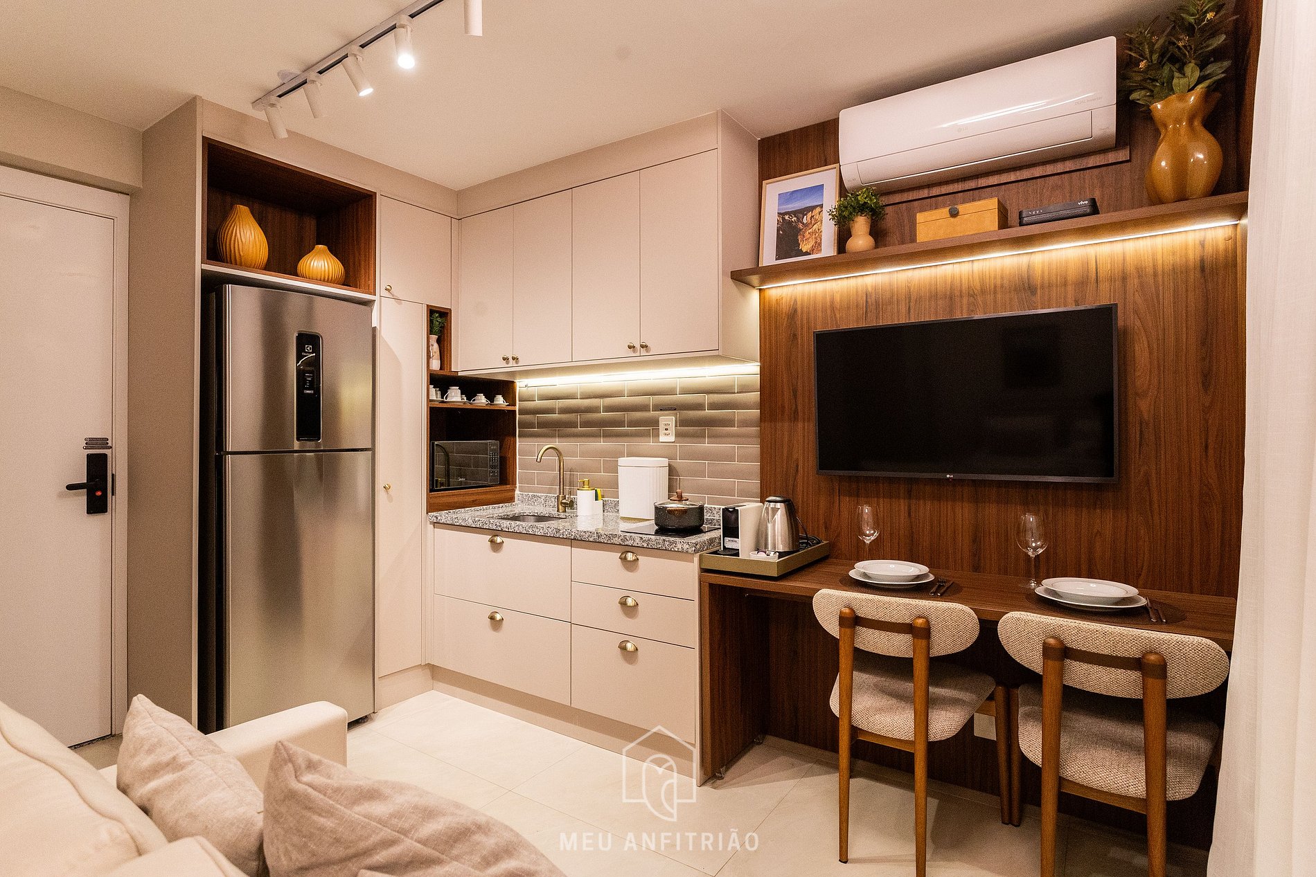 Espaço novo, muito limpo e de fácil acesso. Tudo funciona perfeitamente bem: geladeira grande, ar condicionado, fogão de indução, ferro de passar e a vapor, microondas, Airfryer, sanduicheira, liquidificador... Possui tudo o que necessário para a estadia: talhares, panelas, copos, taças... O chuveiro é excelente e a cama muito confortável. A área da piscina é muito agradável. Portaria 24h. Recomendo muito!