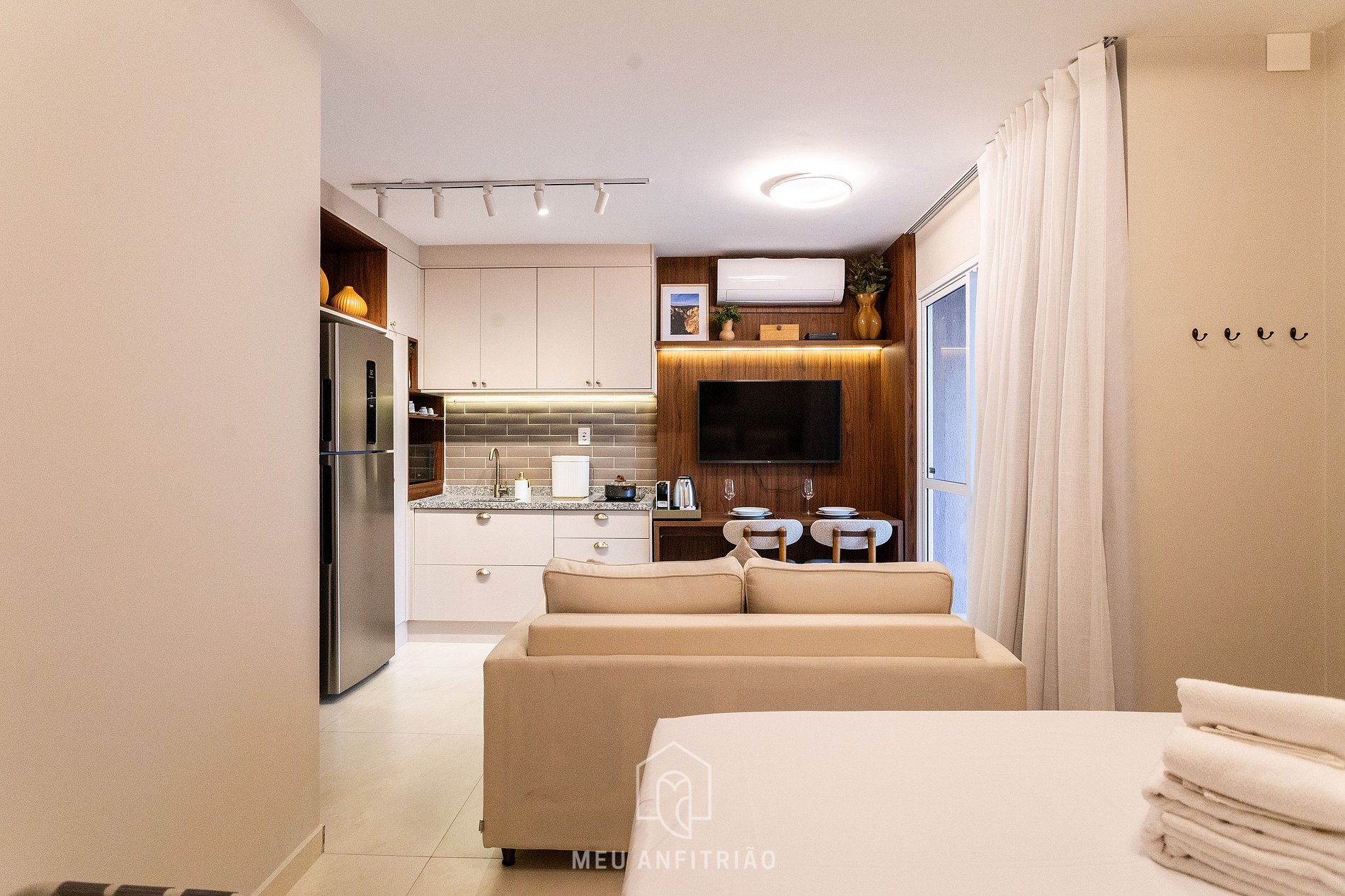 Conta com cama queen, sofá-cama, ar-condicionado, Wi-Fi rápido, Smart TV e uma cozinha equipada para refeições rápidas no dia a dia. A varanda traz mais ventilação e luminosidade ao ambiente, tornando a estadia ainda mais agradável.