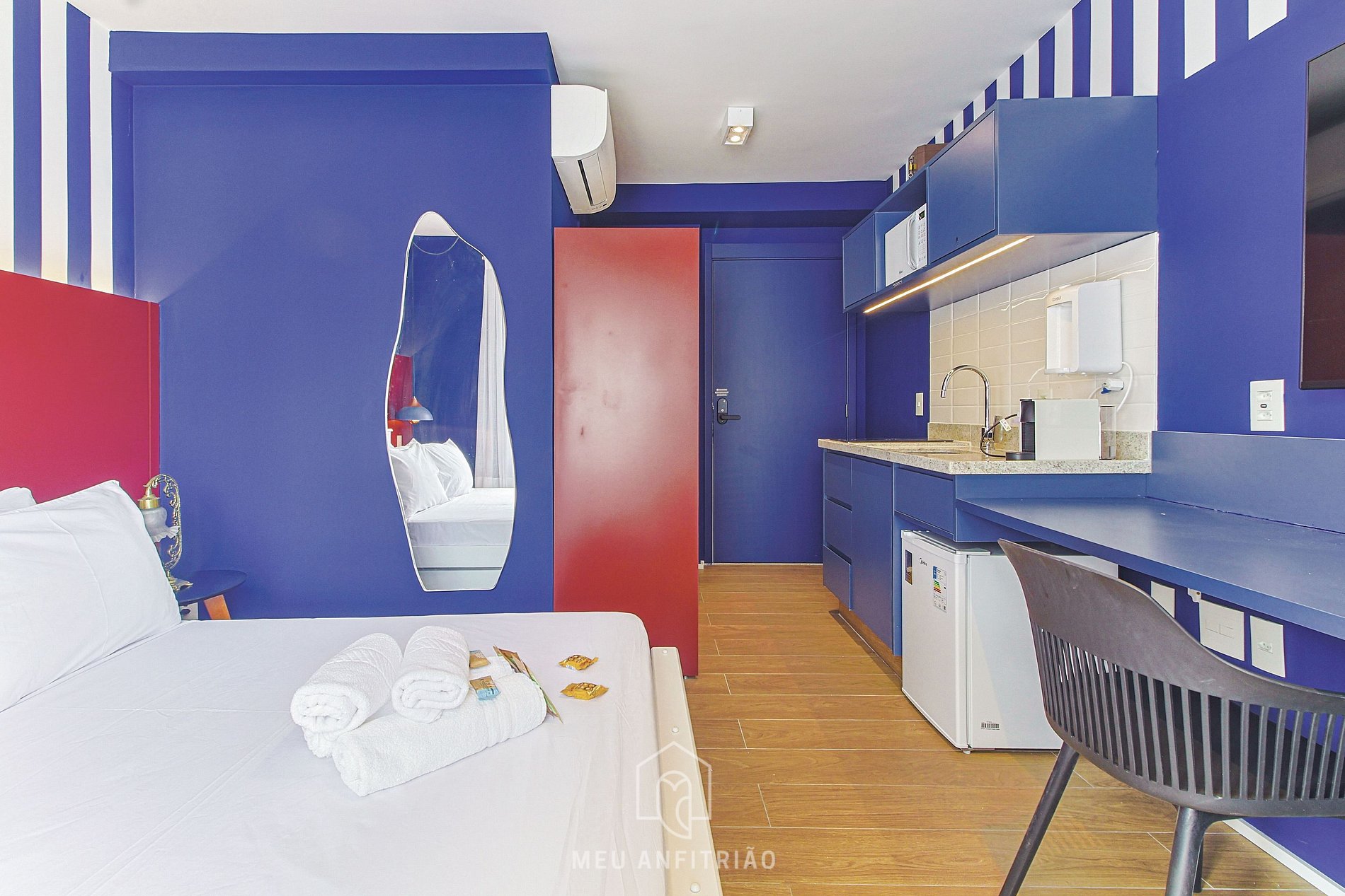 - O ambiente do studio conta com guarda-roupa, cama de casal, bicama de solteirocama de solteiro embaixo da de casal, mesa para home office e refeições, Smart TV, ar-condicionado quente e frio, vaporizador e cortinas.