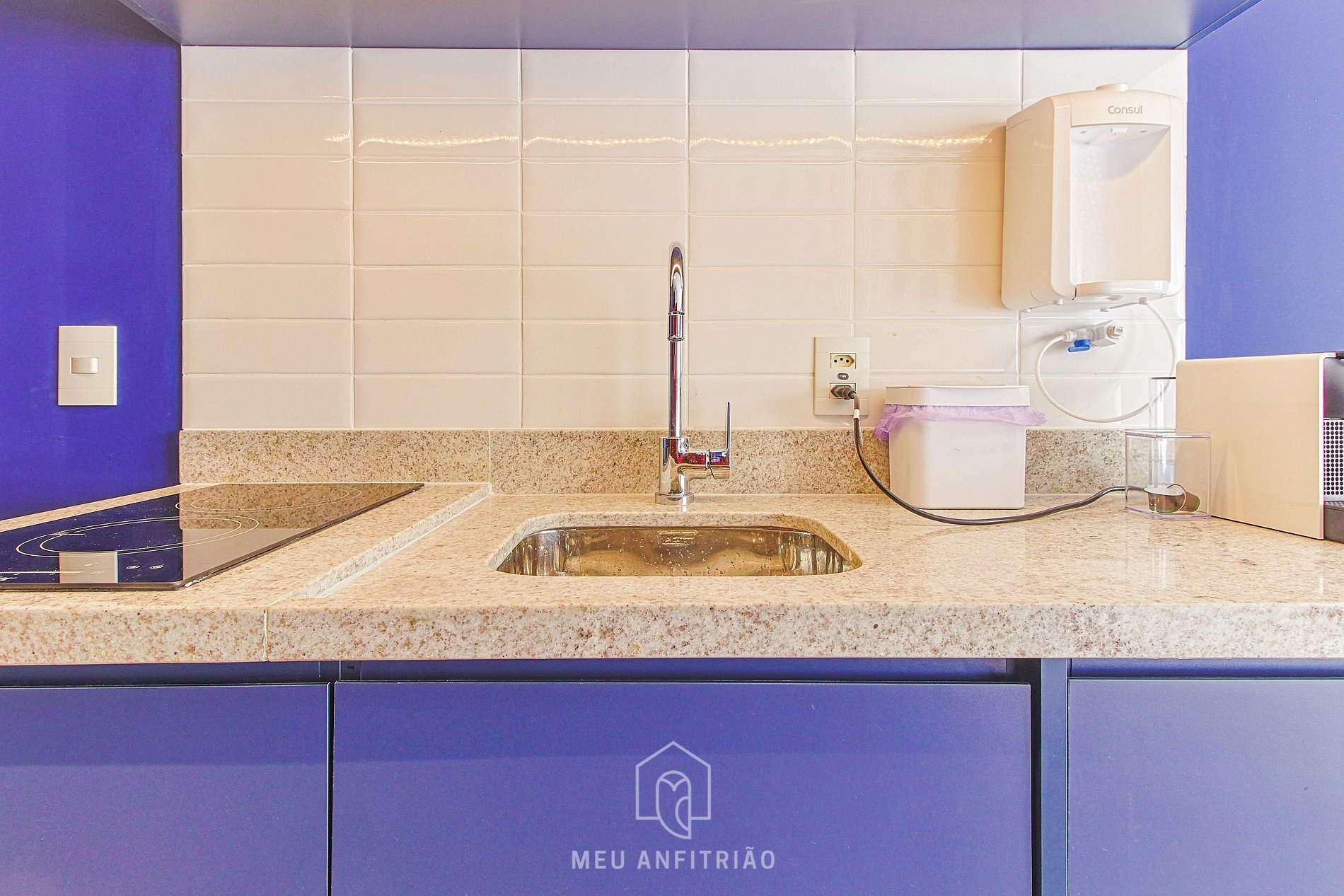 - Na cozinha temos frigobar, fogão cooktop embutido 2 bocas, filtro d’água, micro-ondas, liquidificador, cafeteira por cápsulas Nespresso, sanduicheira elétrica, entre outros itens úteis para uma estadia confortável.