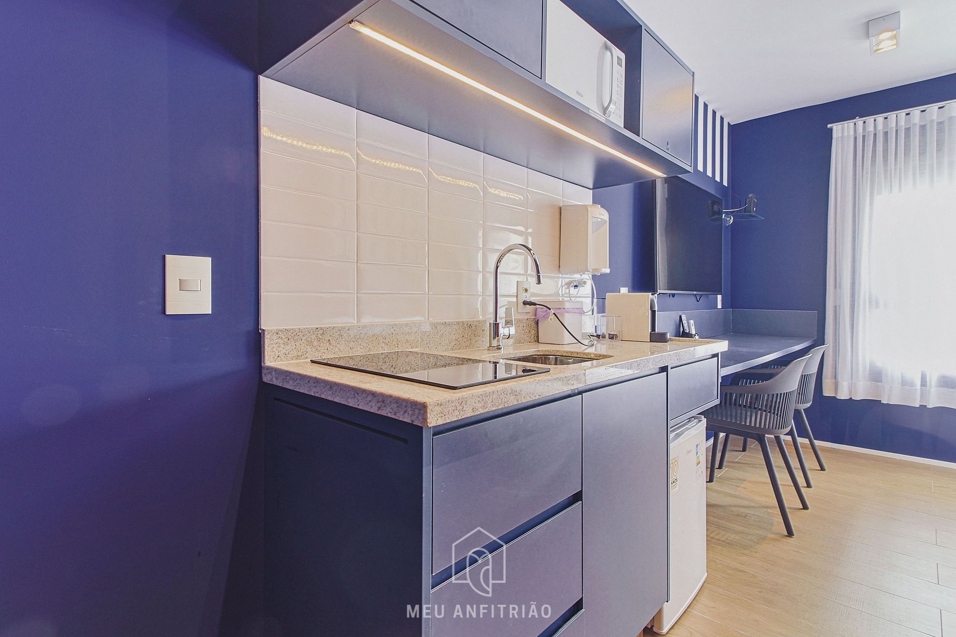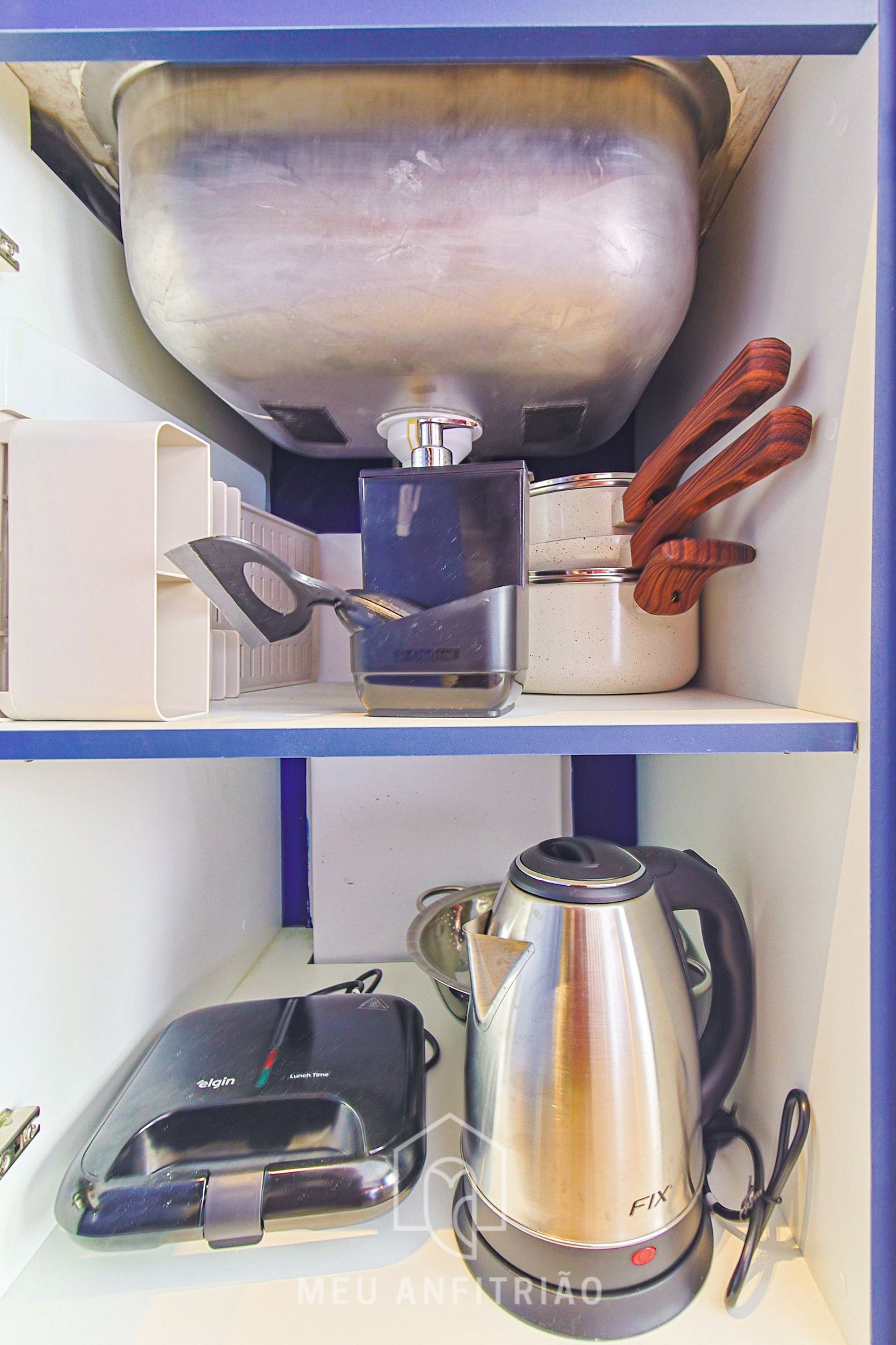 - Na cozinha temos frigobar, fogão cooktop embutido 2 bocas, filtro d’água, micro-ondas, liquidificador, cafeteira por cápsulas Nespresso, sanduicheira elétrica, entre outros itens úteis para uma estadia confortável.