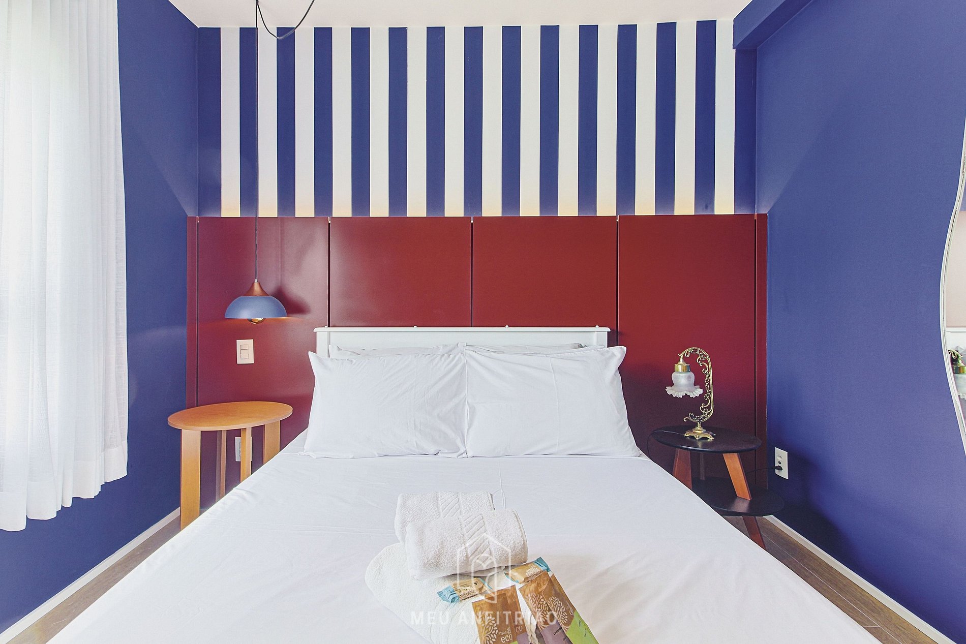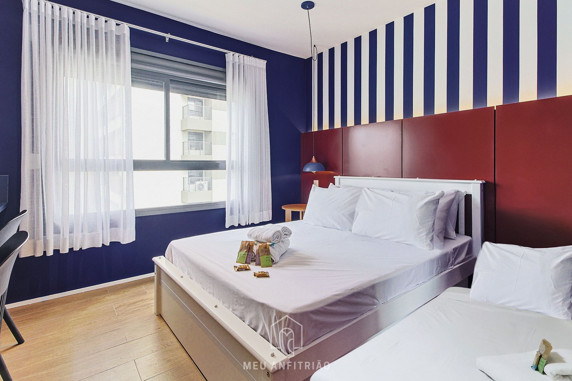 Studio de aproximadamente 23m² bem decorado, para 3 pessoas em uma cama de casal e outra de solteiro. O condomínio oferece academia, e espaço para coworking e portaria presencial 24h.