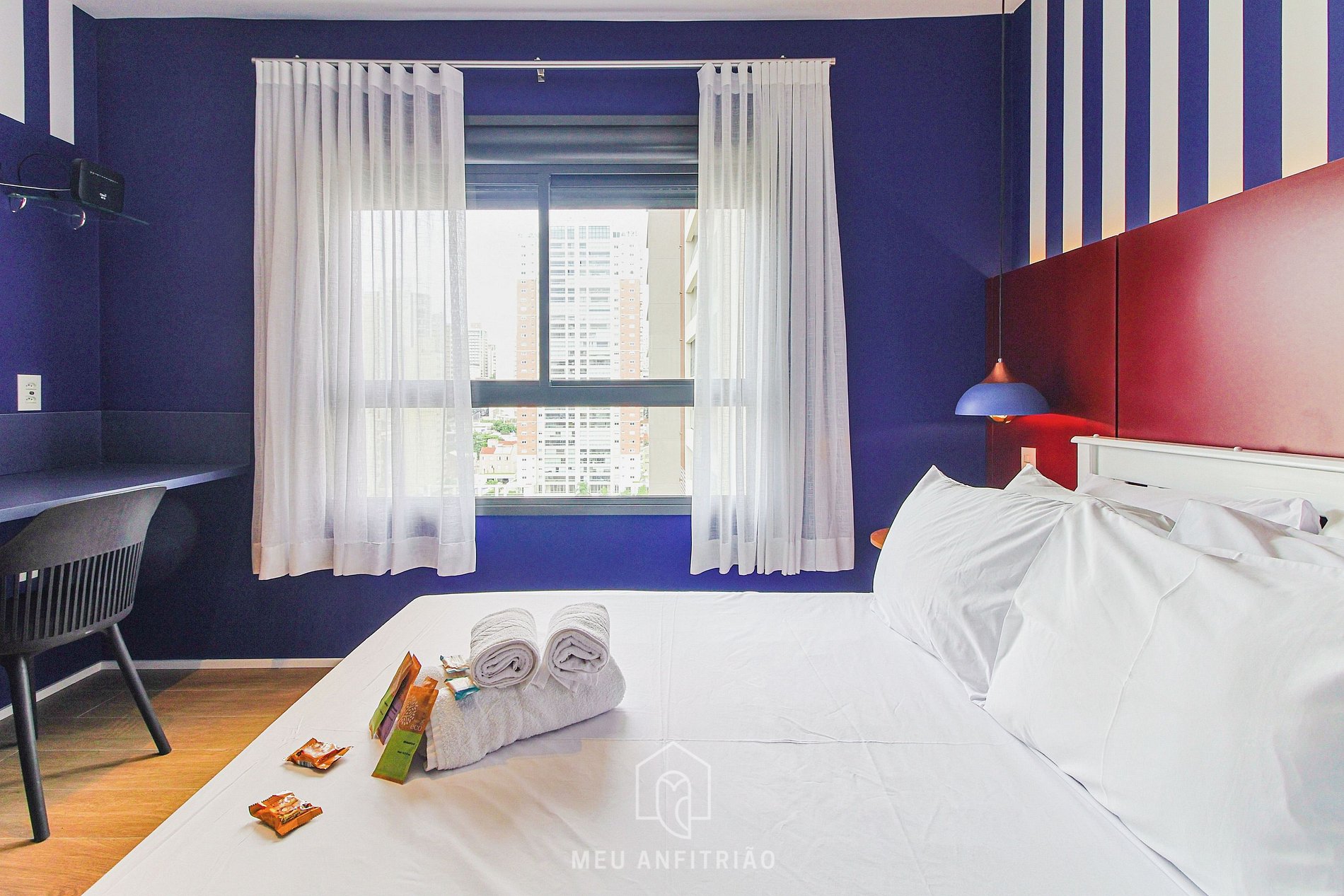 - O ambiente do studio conta com guarda-roupa, cama de casal, bicama de solteirocama de solteiro embaixo da de casal, mesa para home office e refeições, Smart TV, ar-condicionado quente e frio, vaporizador e cortinas.
